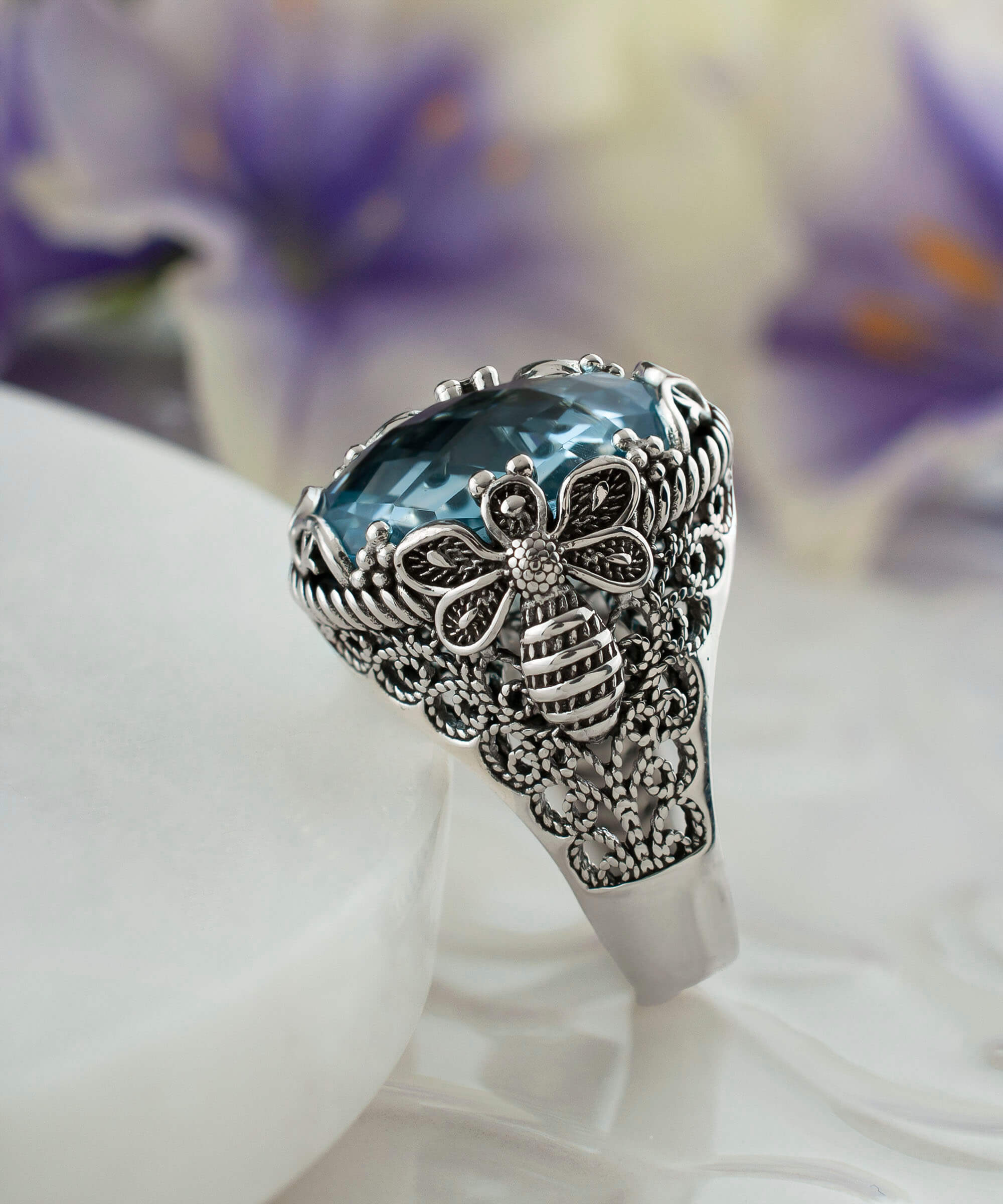 To maintain the beauty of your Filigree Art Bee Blue Topaz Silver Ring, it is recommended to store it in the provided velvet pouch when not in use. Regularly polishing the silver with the included cloth will help keep it shining and free from tarnish. Avoid exposing the ring to harsh chemicals or abrasive materials to preserve its exquisite finish.
