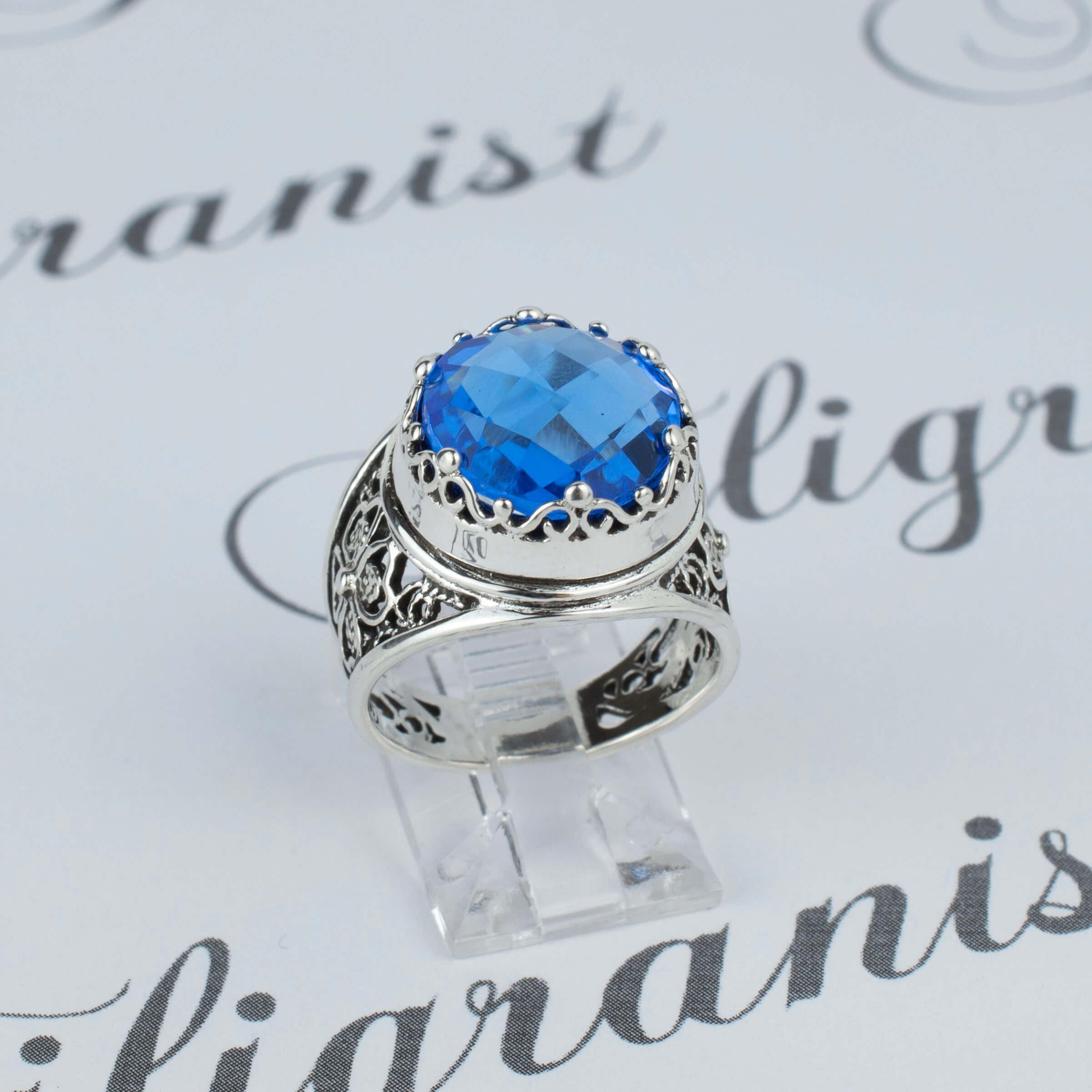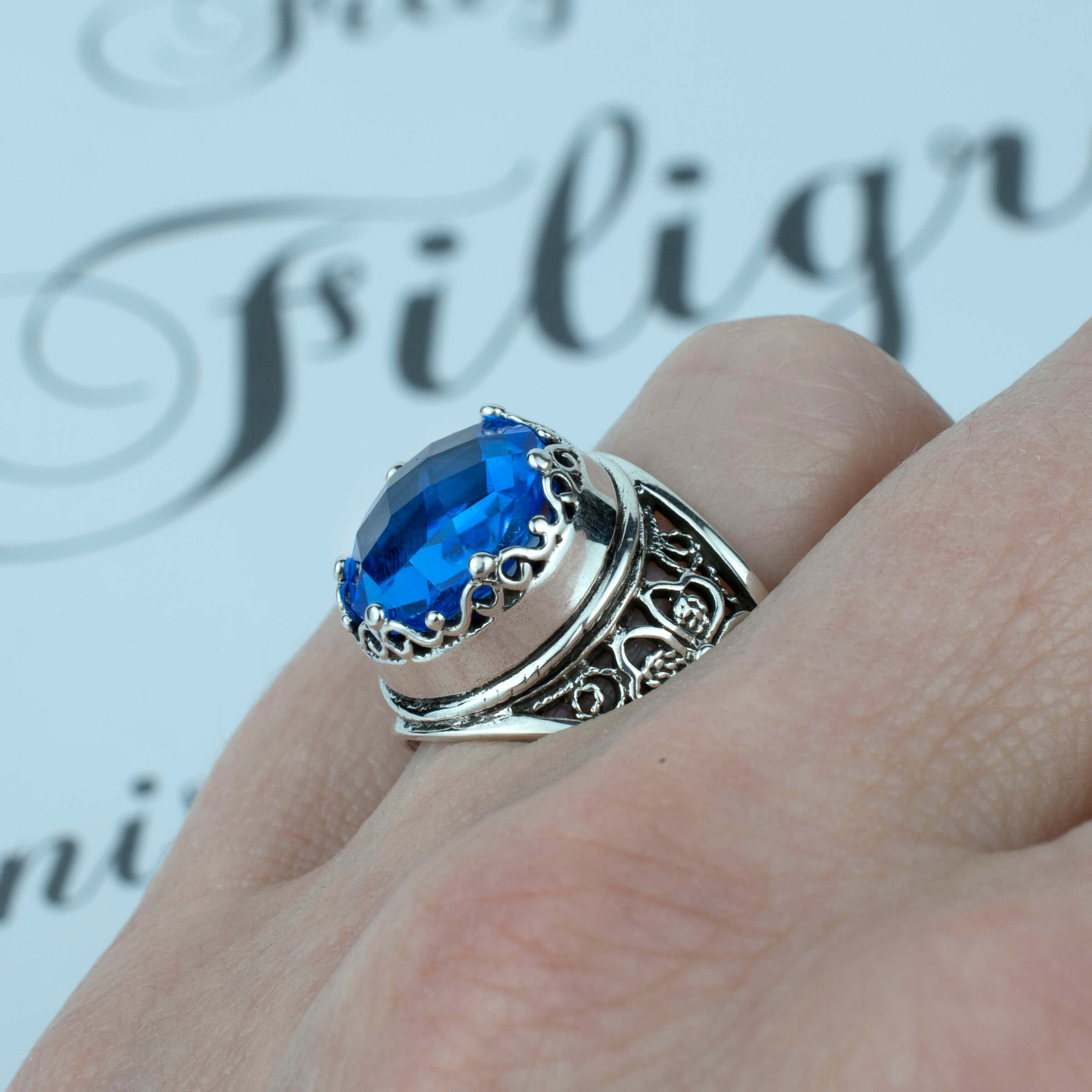 In summary, the Filigree Art Blue Quartz Gemstone Women Crown Silver Statement Ring is a perfect blend of artistry, elegance, and quality. Its unique design, combined with the stunning blue quartz gemstone, makes it a must-have accessory for any jewelry lover.