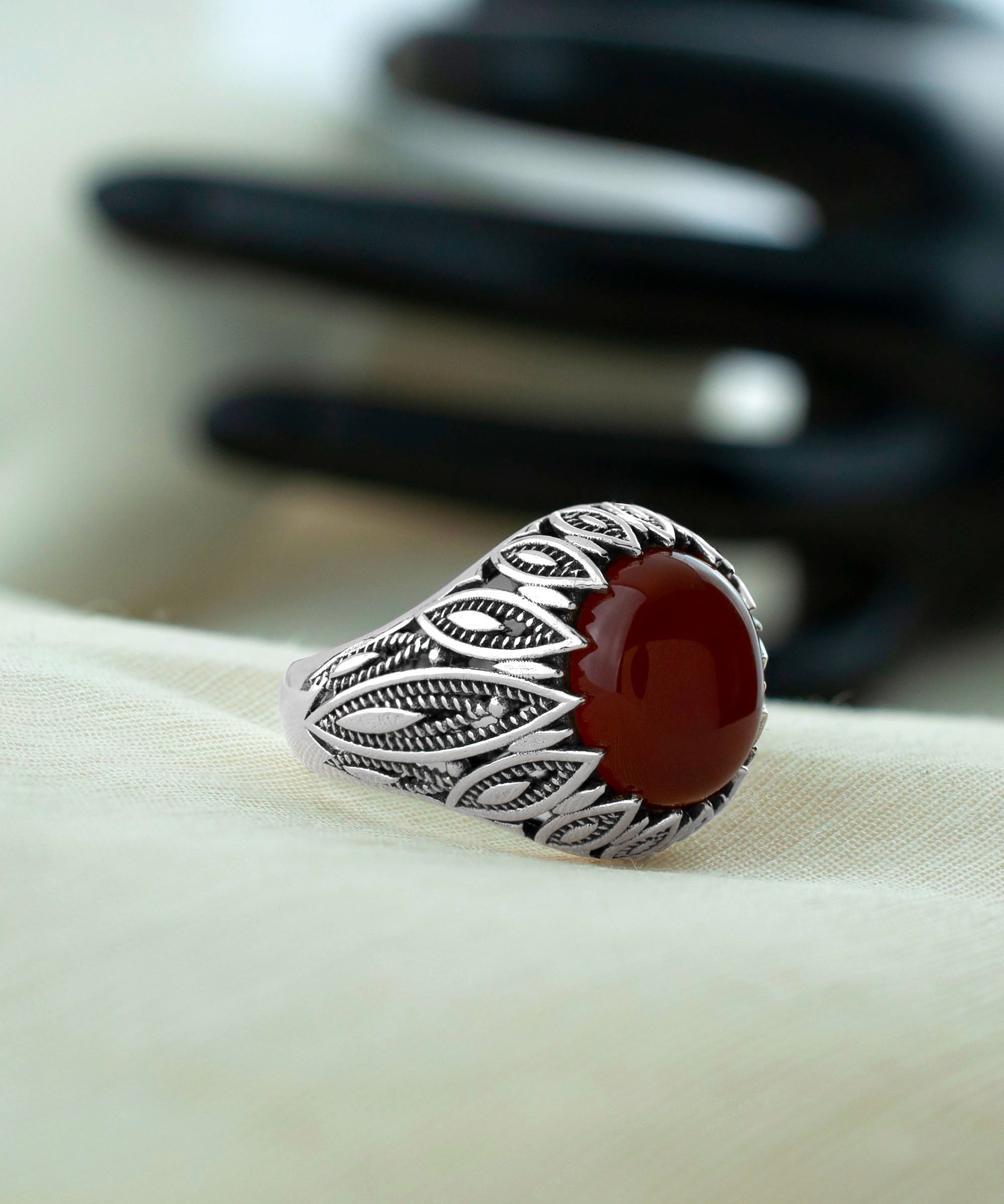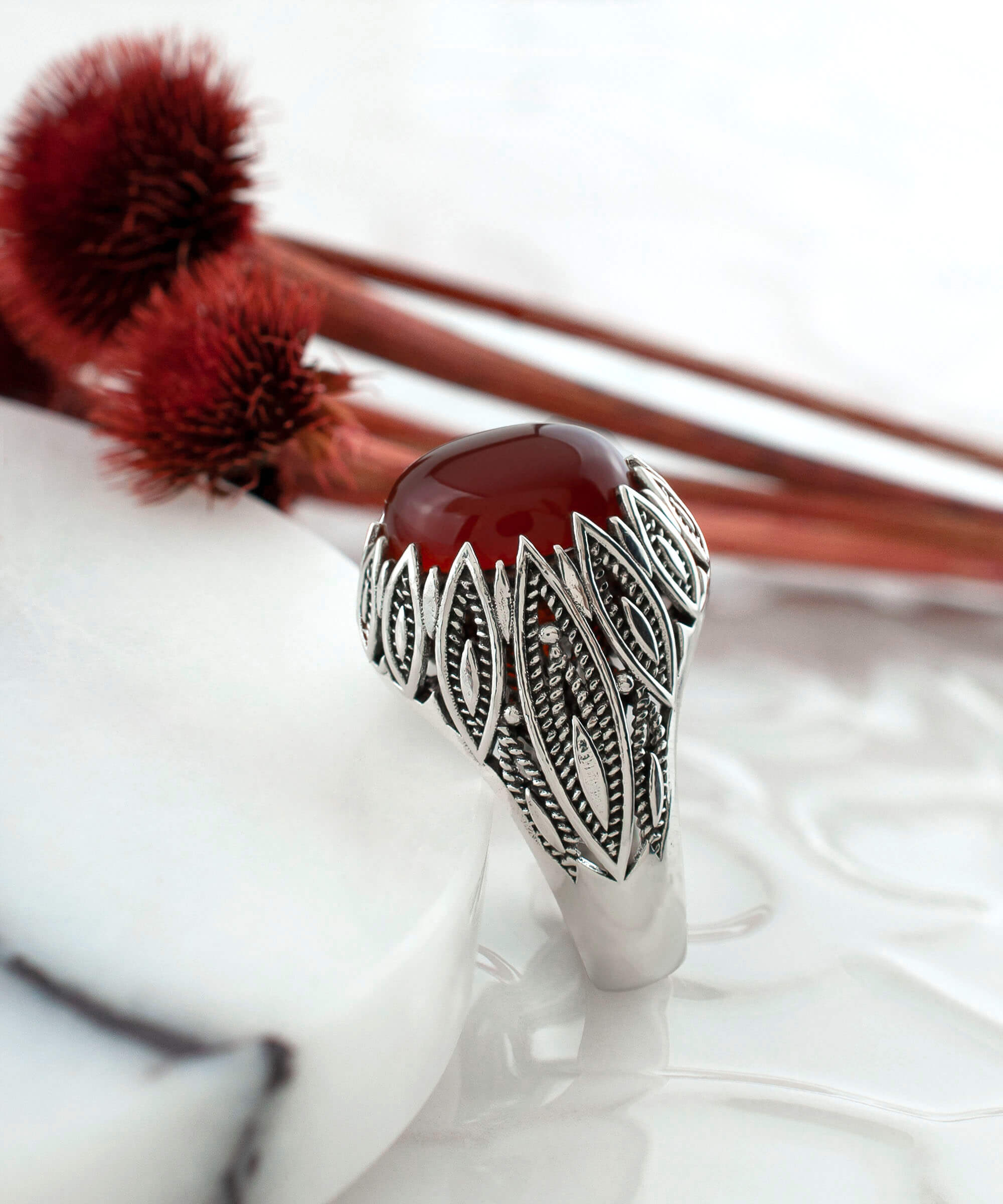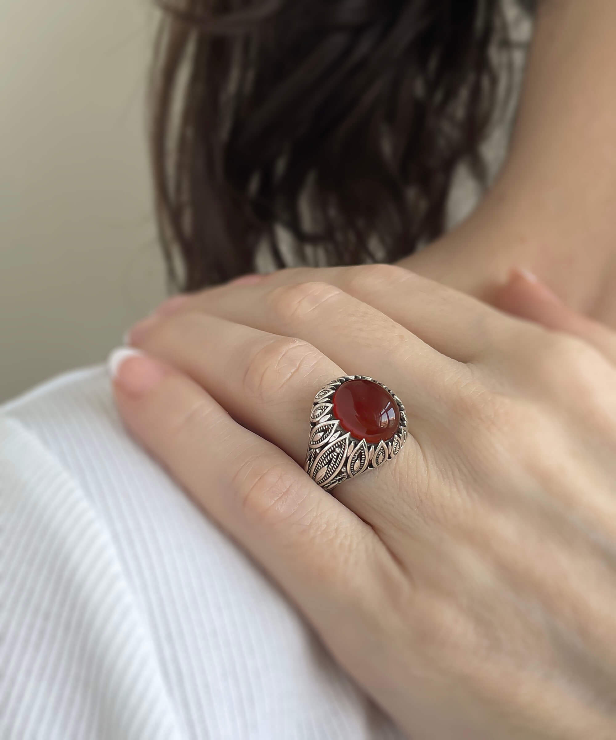 This statement ring is versatile enough to be worn on various occasions. Whether you're dressing up for a formal event or looking for a stylish accessory for everyday wear, this ring is an excellent choice. Its elegant design makes it suitable for weddings, anniversaries, or even casual outings. The Carnelian gemstone is believed to promote confidence and creativity, making it not just a beautiful piece of jewelry but also a meaningful one.