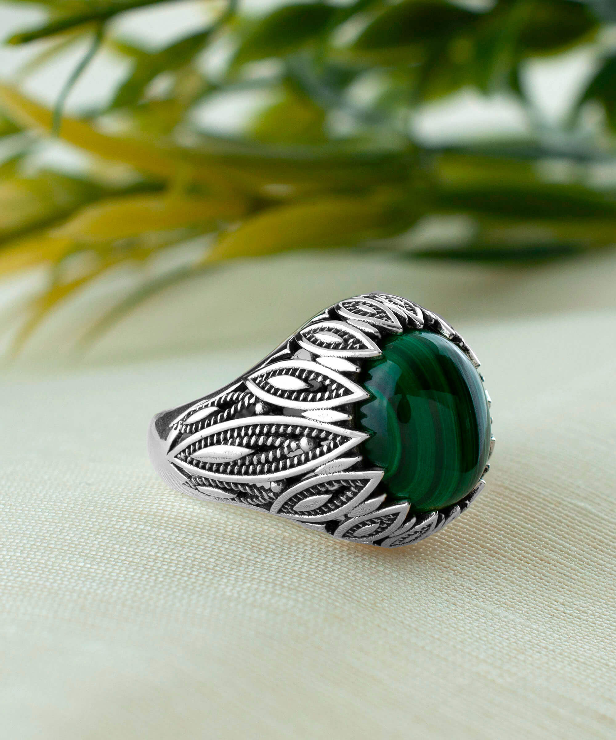 The natural Malachite gemstone featured in this ring is a cabochon oval-cut measuring 10X12 mm. Malachite is not only beautiful but is also believed to have healing properties, making it a meaningful addition to your jewelry collection. Its vibrant green color is perfect for adding a pop of color to any outfit, whether you're dressing up for a formal event or adding flair to your casual attire.