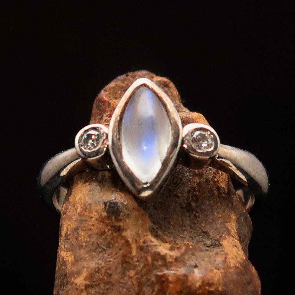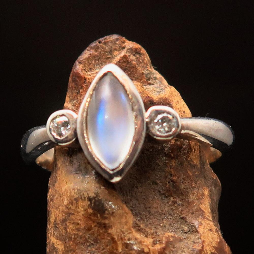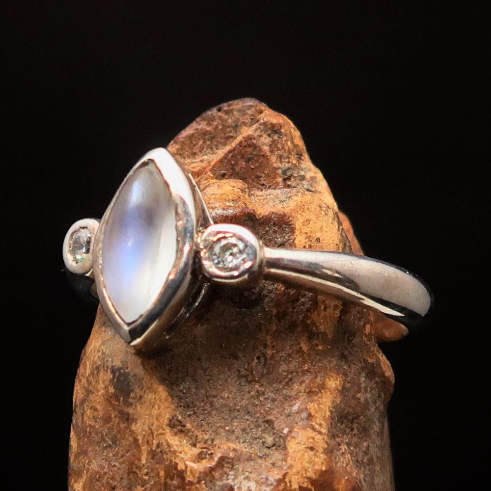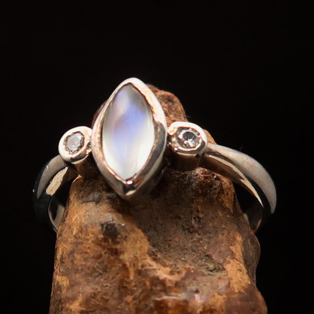 At the heart of this ring lies a captivating marquise shaped Moonstone, measuring 8 mm x 5 mm. Moonstone is known for its unique optical phenomenon called adularescence, which gives it a shimmering glow that changes with the angle of light. This enchanting stone is believed to bring good fortune and enhance intuition, making it a meaningful addition to your jewelry collection.