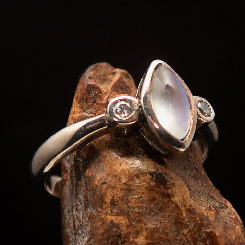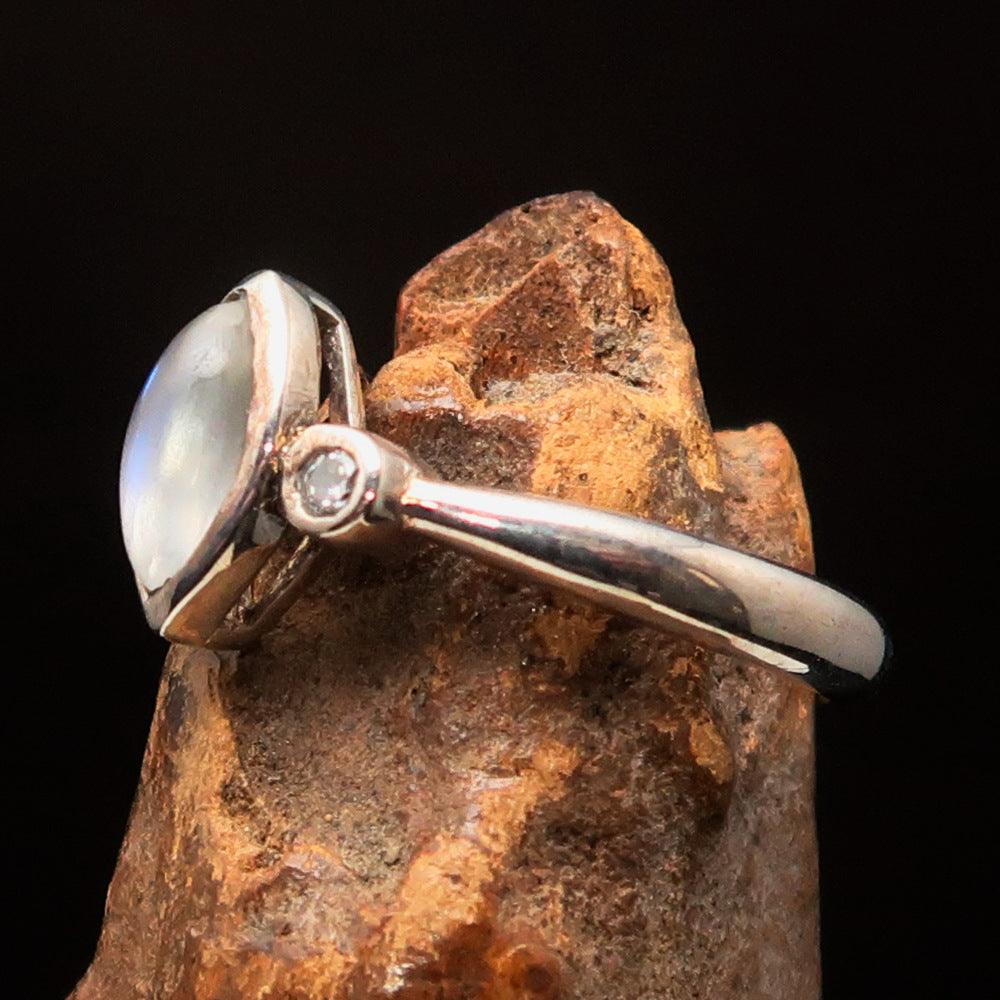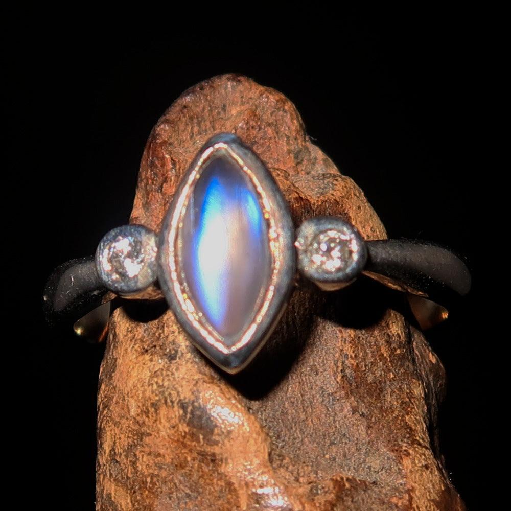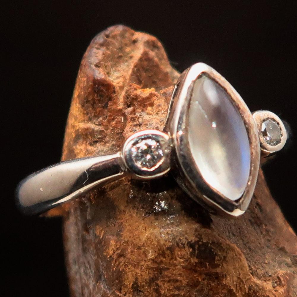 At the heart of this ring lies a captivating marquise shaped Moonstone, measuring 8 mm x 5 mm. Moonstone is known for its unique optical phenomenon called adularescence, which gives it a shimmering glow that changes with the angle of light. This enchanting stone is believed to bring good fortune and enhance intuition, making it a meaningful addition to your jewelry collection.