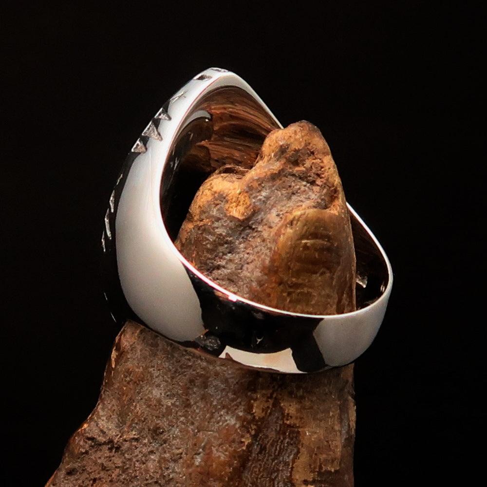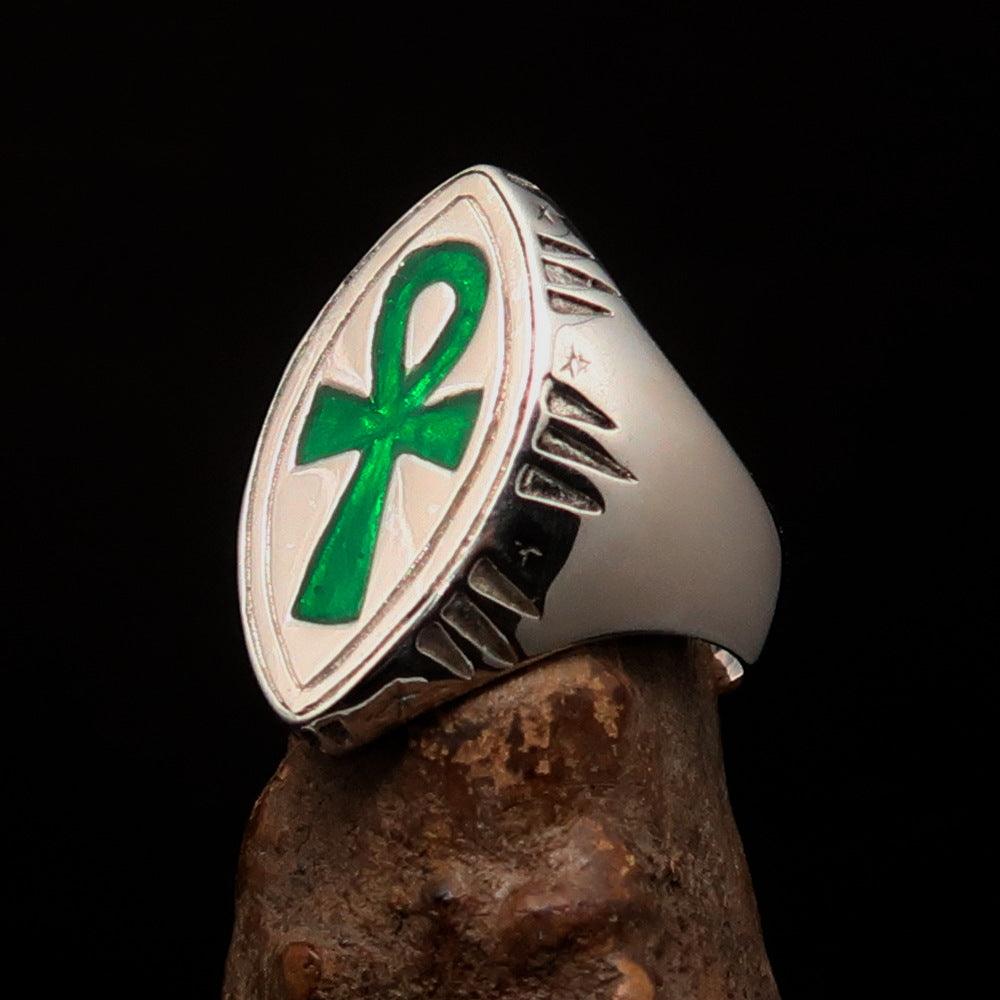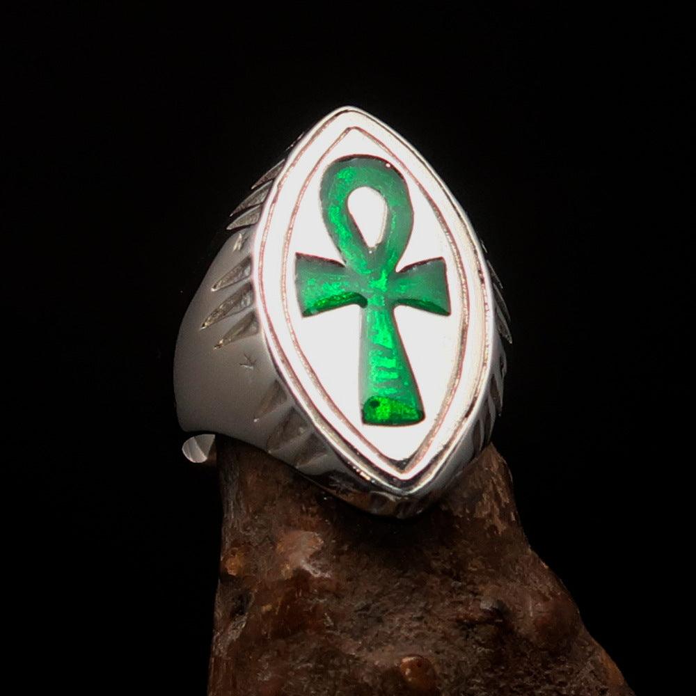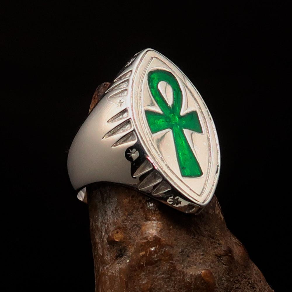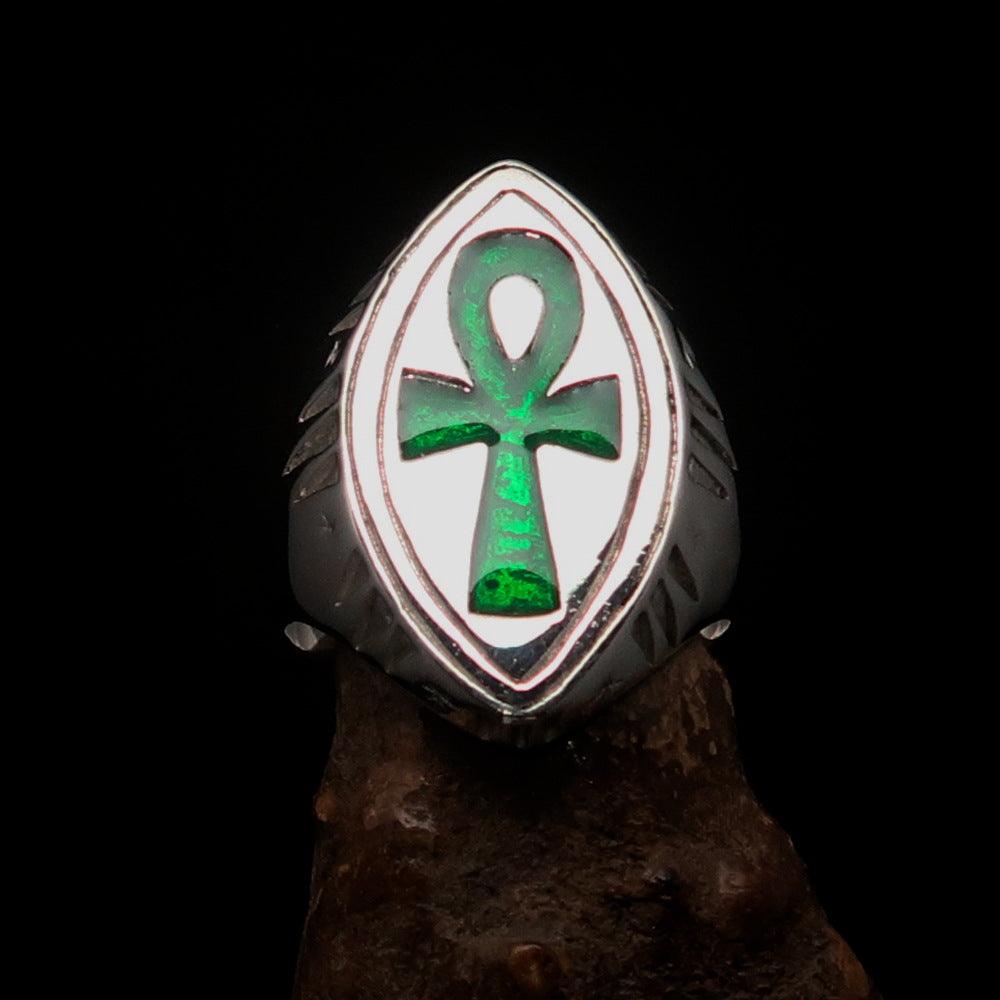 Green marquise shaped Egyptian Ankh Cross Men's Ring made of high polished sterling silver with enamel finish.