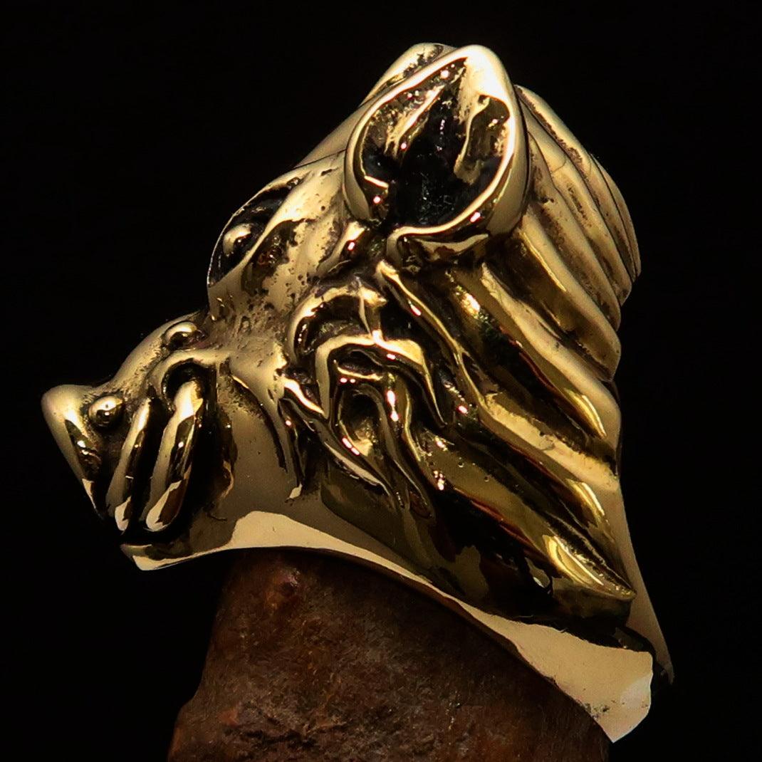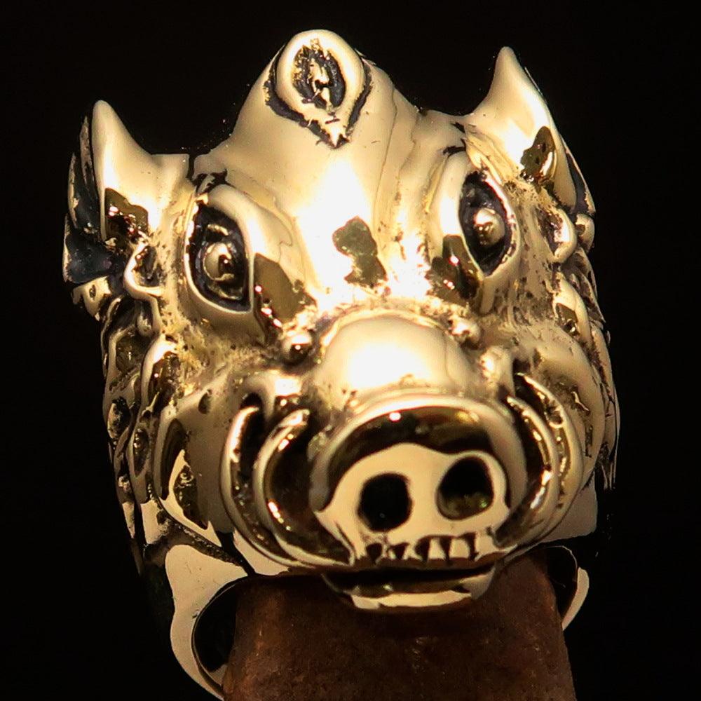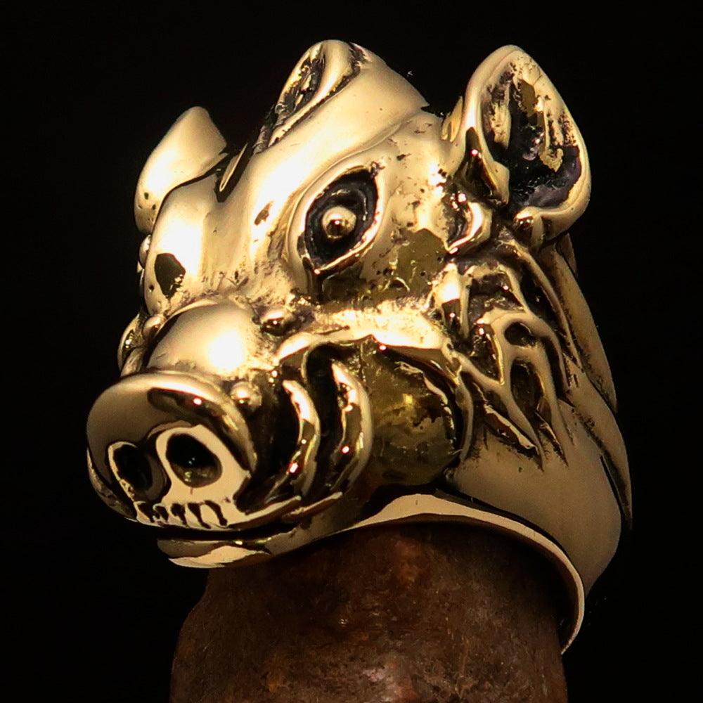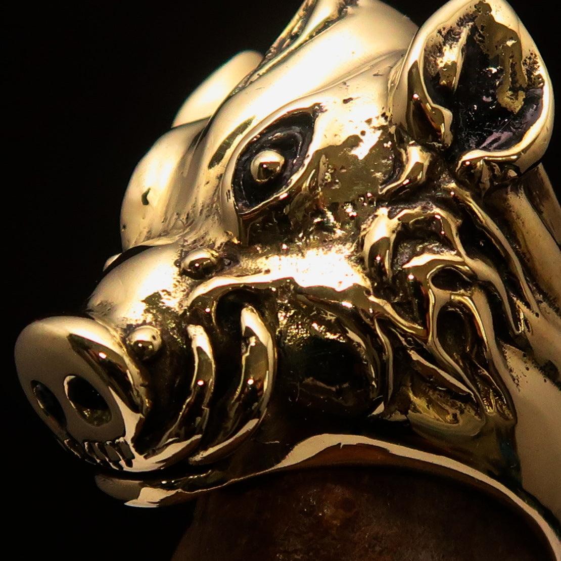 Heavy crafted biker ring featuring a detailed boar design in antiqued brass, showcasing vintage charm and bold aesthetics.