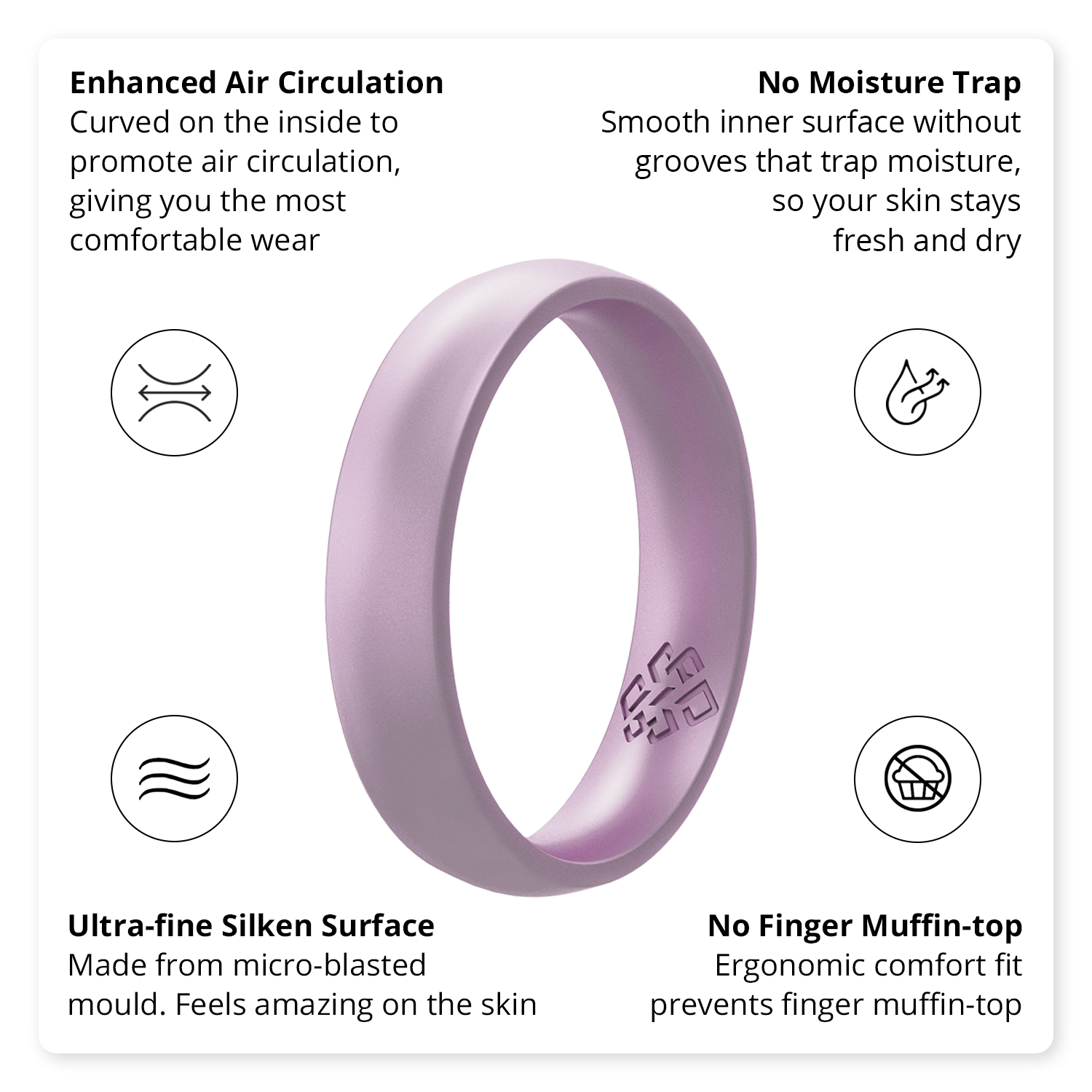One of the standout features of the Lavender Purple silicone ring is its bevel comfort fit design. Unlike standard rings, this silicone ring has a curved inner surface that enhances airflow, ensuring that your finger remains comfortable throughout the day. This innovative design prevents the common issue of 'finger muffin-top,' allowing for a snug yet comfortable fit that won't pinch or constrict your finger.