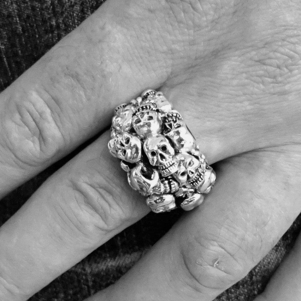 The ring boasts a high polished and antiqued finish, giving it a vintage look that complements its edgy design. Each skull is meticulously detailed, making this ring not just an accessory, but a conversation starter. Whether you're a biker, a fan of gothic fashion, or simply someone who appreciates unique jewelry, this ring is designed to impress.