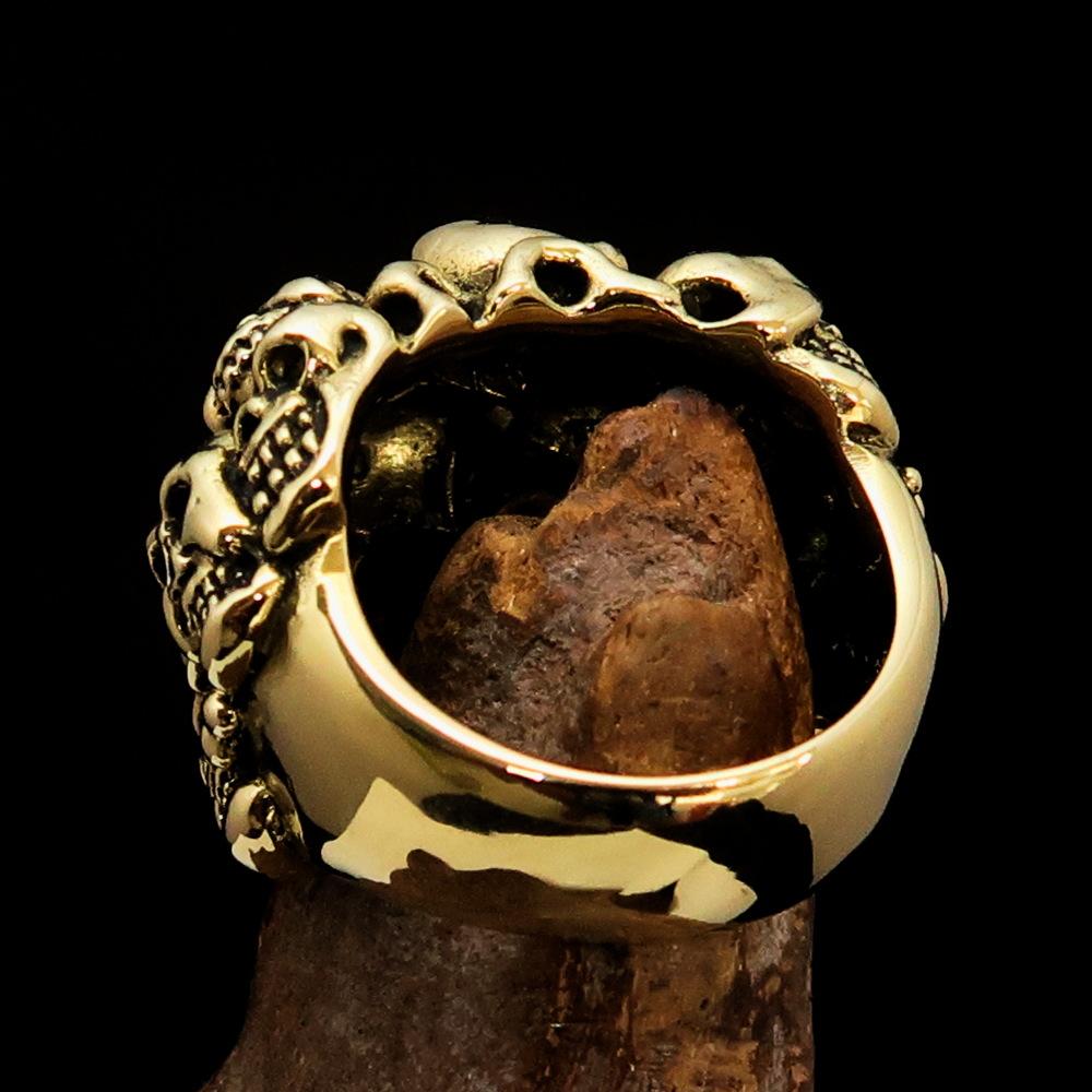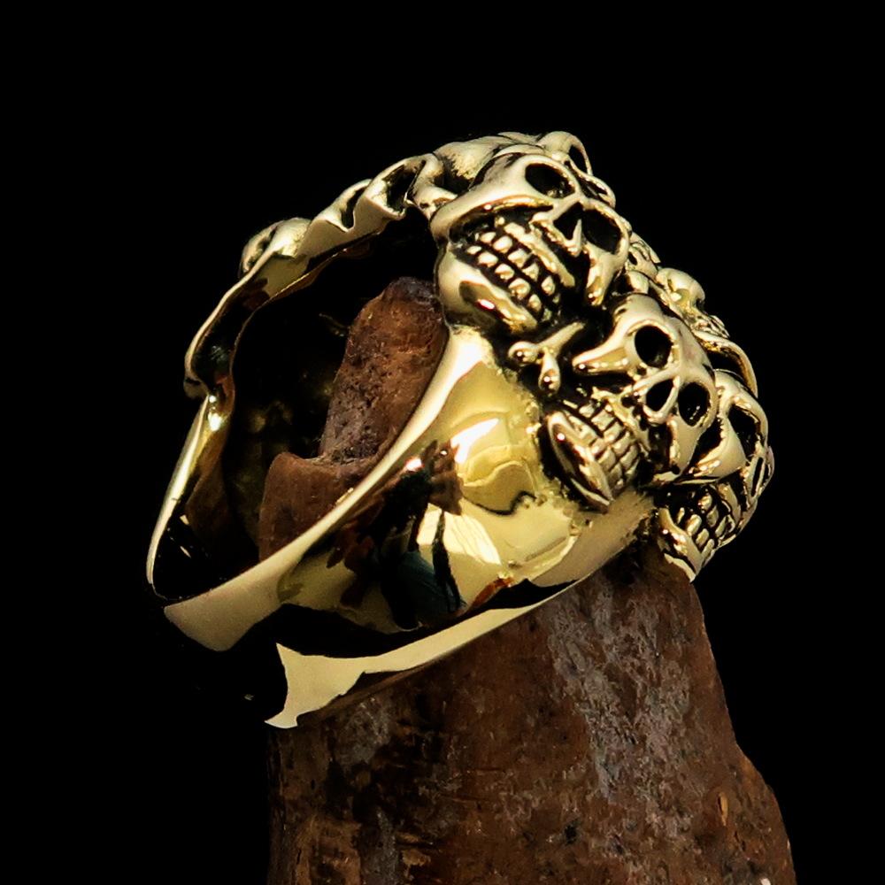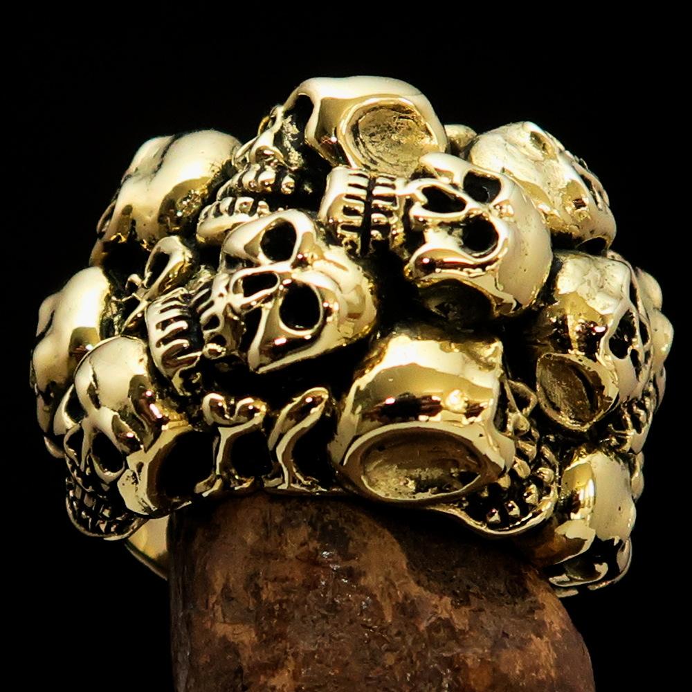 Introducing the Men's Brass Costume Biker Ring, a striking piece of jewelry that showcases a unique design featuring 13 intricately crafted skulls. This ring is perfect for those who want to make a bold statement at graveyard parties or any occasion where you want to stand out. Made from solid brass, this ring combines durability with style, ensuring it will last through many adventures.