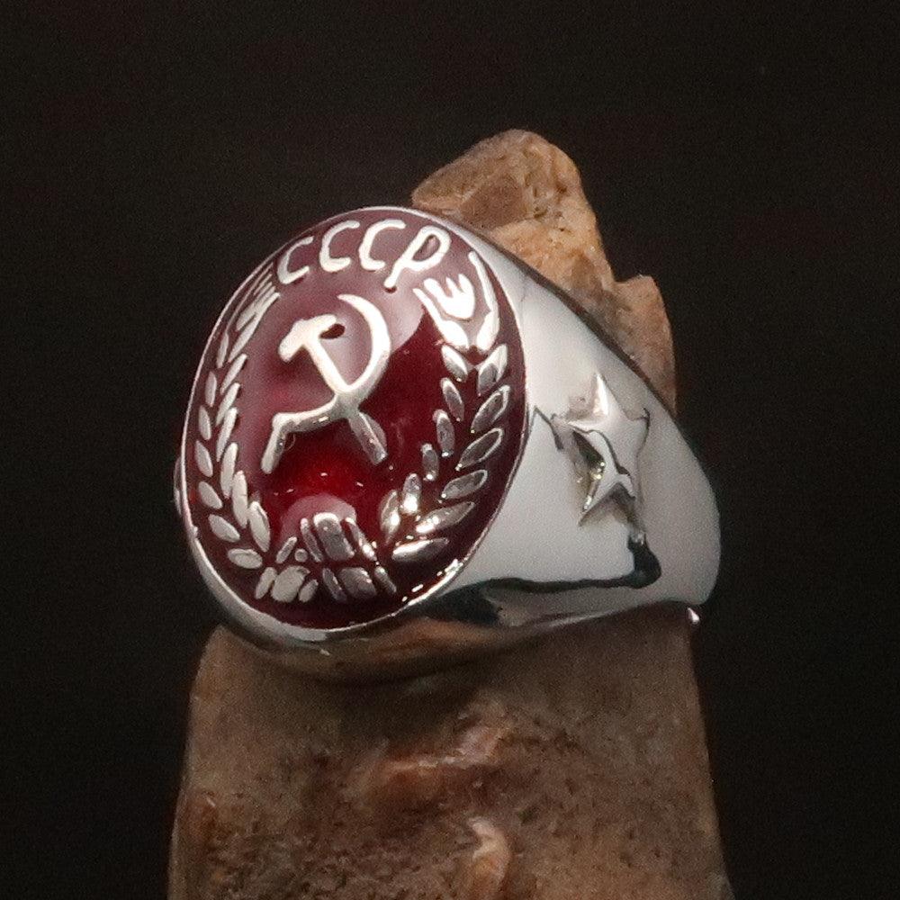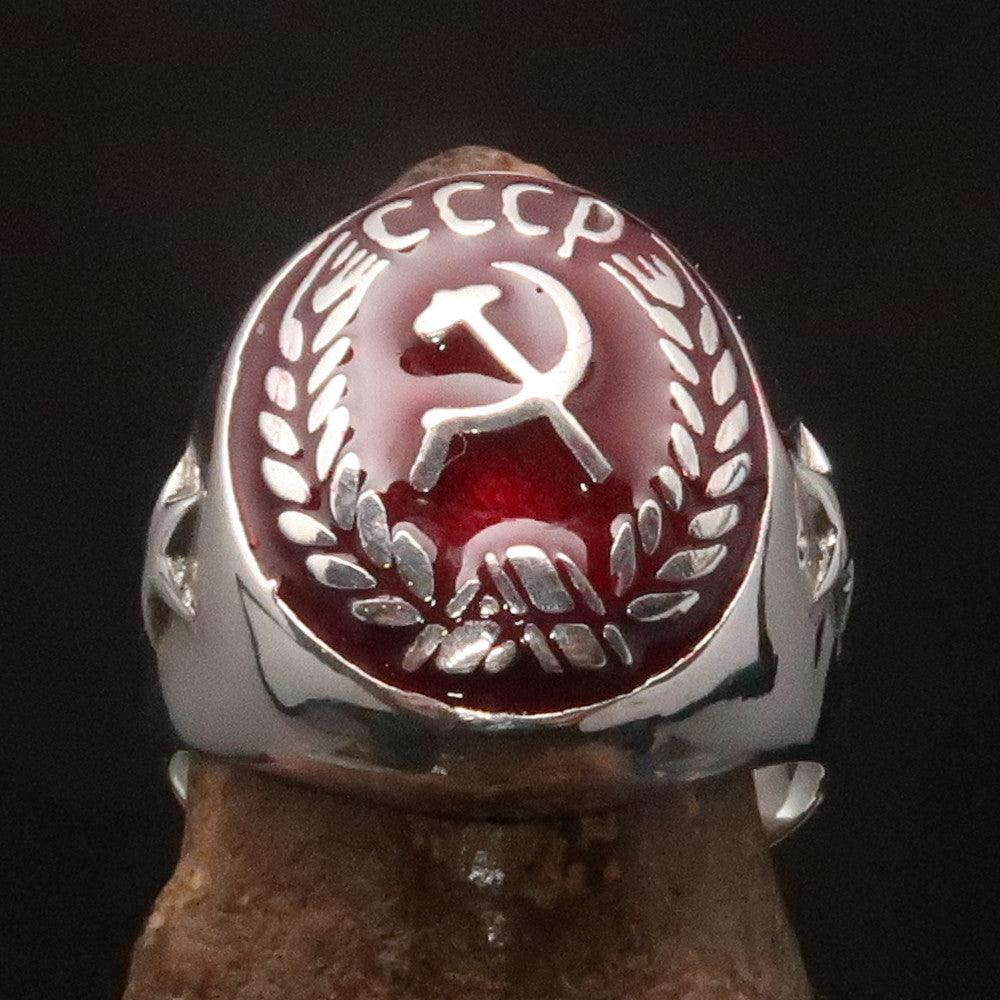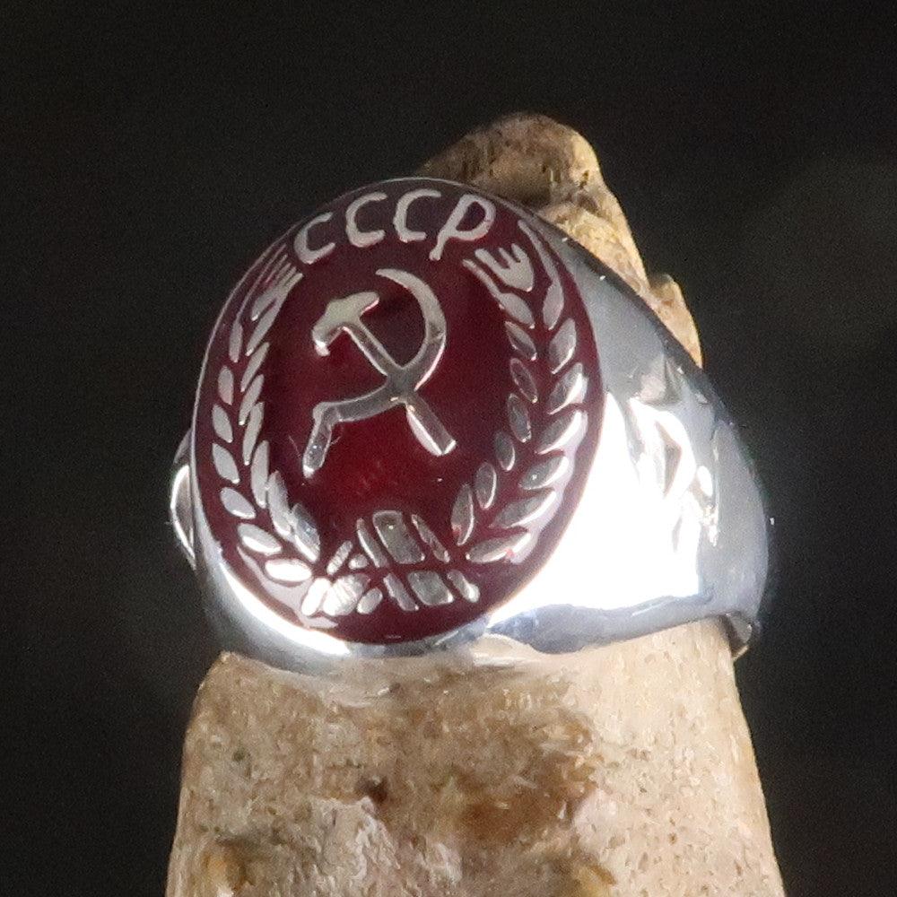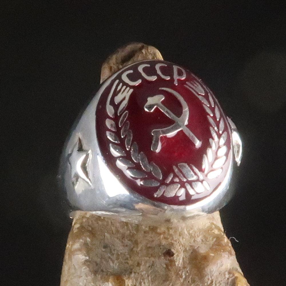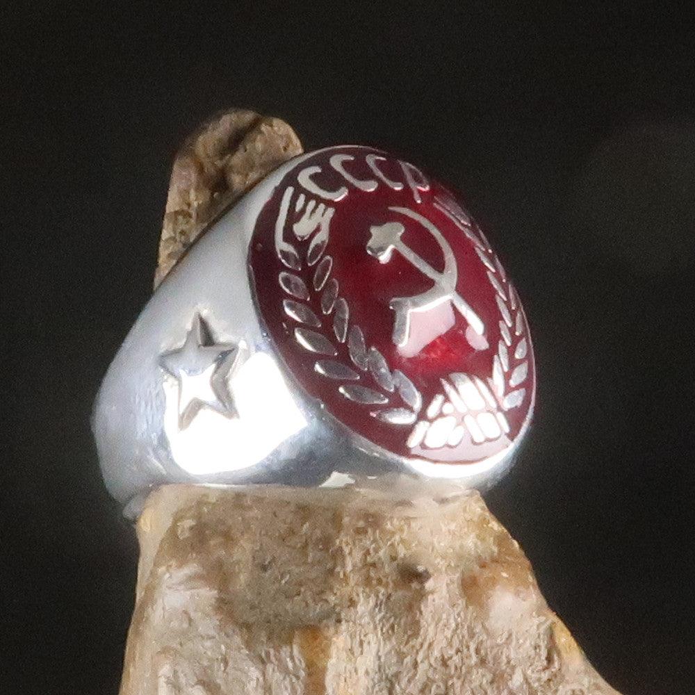 Introducing the Men's Communist Ring, a striking piece that embodies strength and unity. Crafted from solid sterling silver, this ring showcases the iconic Hammer and Sickle crest of the CCCP, a powerful symbol of communism. The bold red enamel accents enhance the design, making it not just a ring, but a statement piece that reflects your beliefs and style.