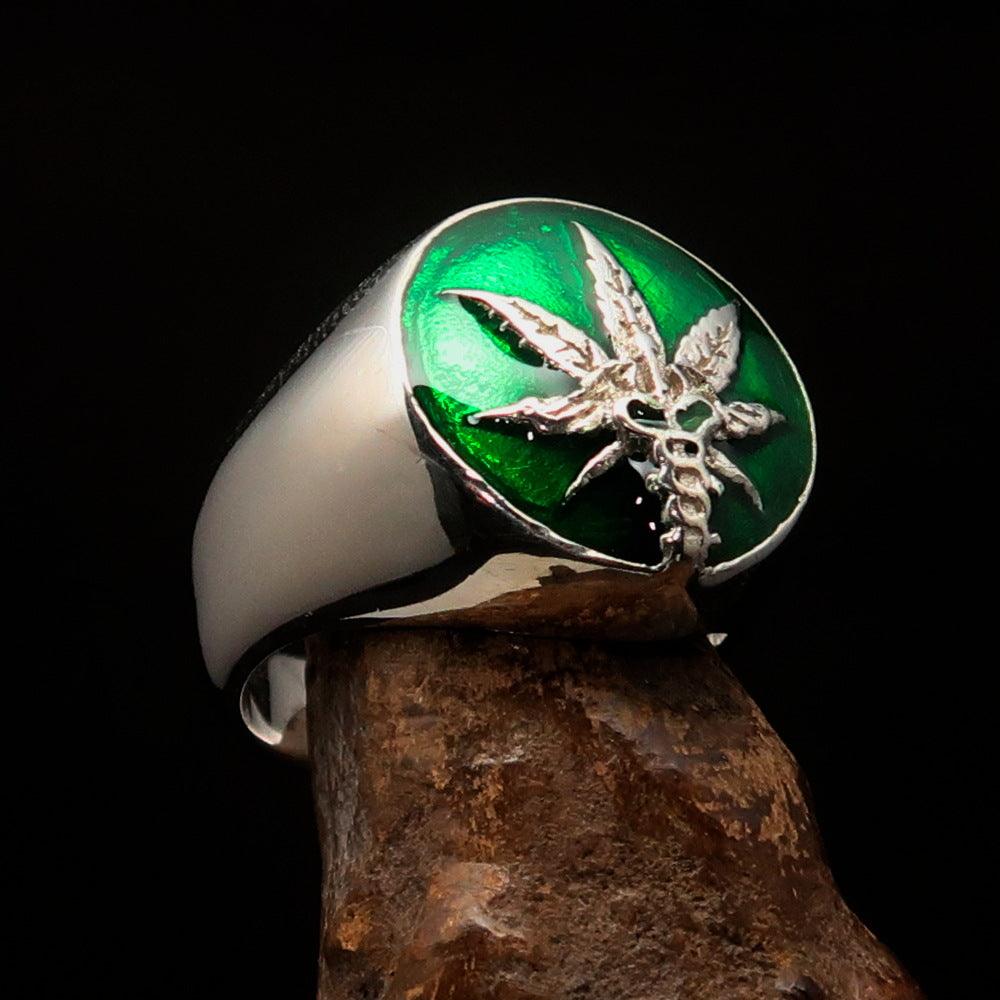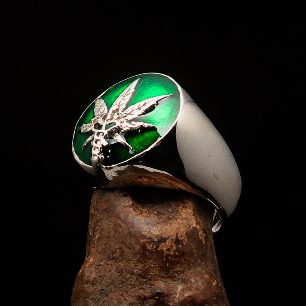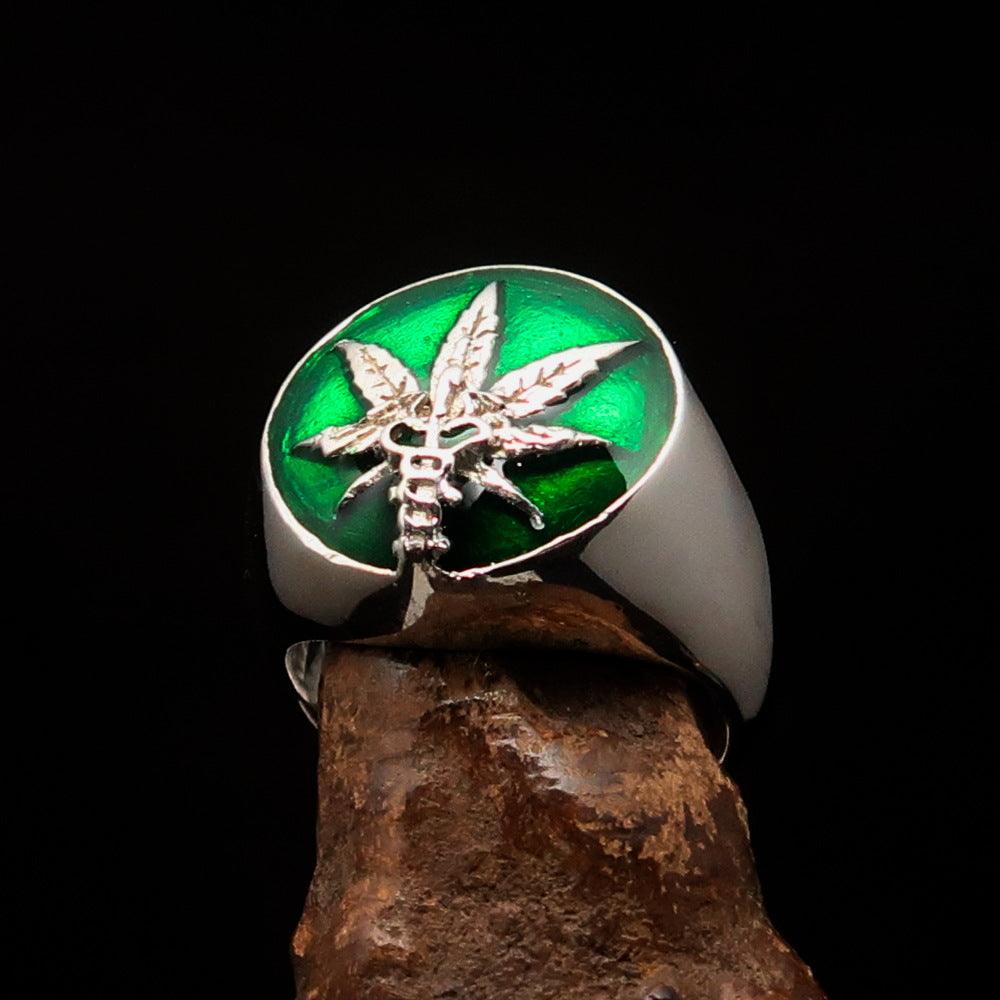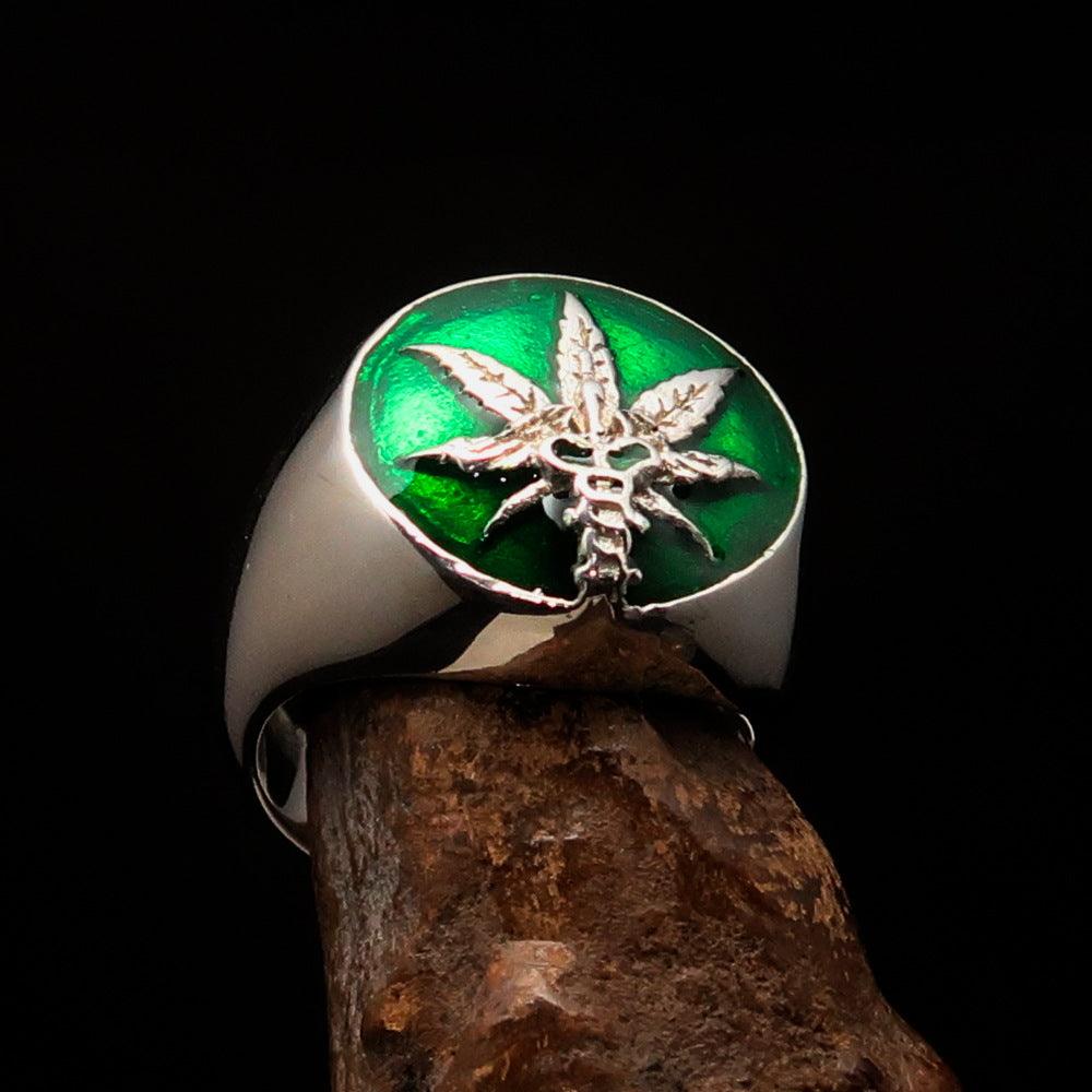 Introducing our Men's Ring featuring a striking Cannabis Leaf design, a perfect blend of style and symbolism. Crafted from solid sterling silver, this ring is not only durable but also showcases a high-polished finish that gleams beautifully in any light. The vibrant green enamel adds a pop of color, making it a standout piece for any cannabis enthusiast or someone who appreciates unique jewelry.
