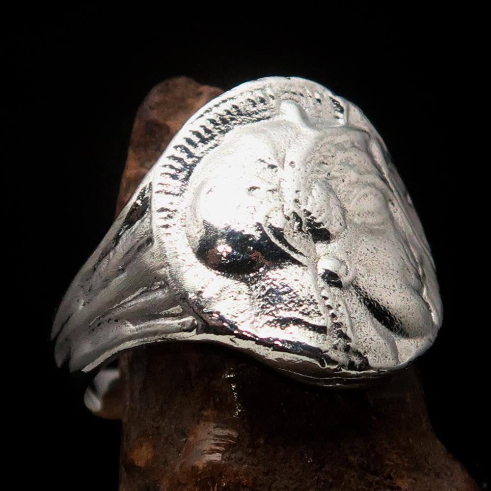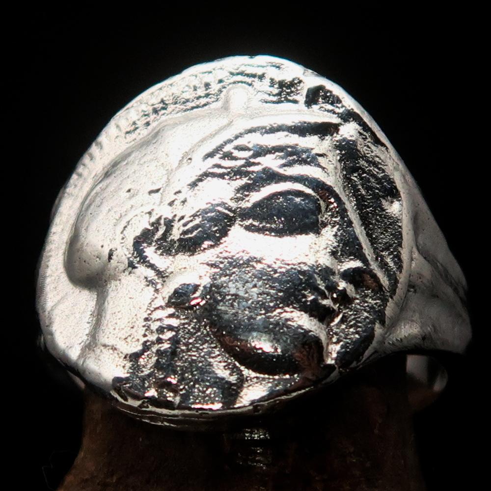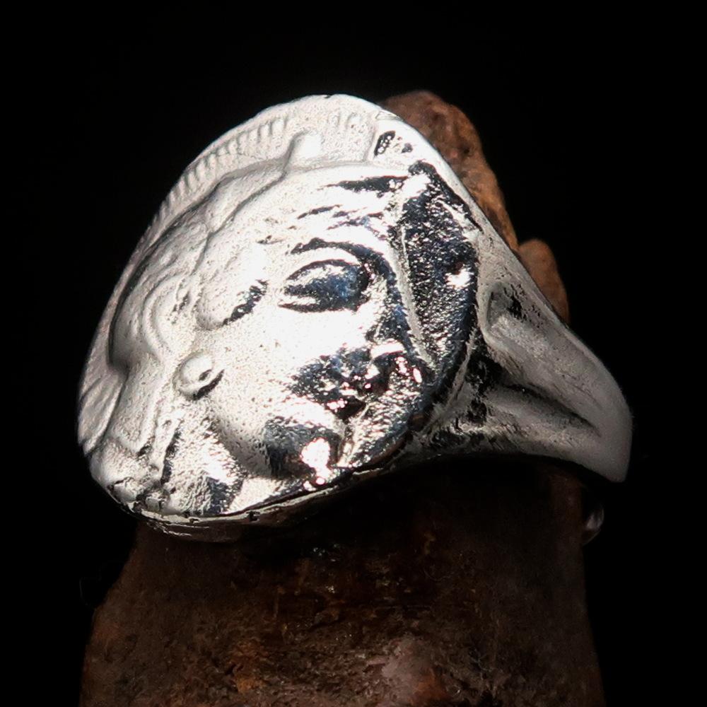 Introducing the exquisite Men's Sterling Silver Ancient Greek Drachma Coin Ring, a stunning piece inspired by the legendary Alexander the Great. This ring is crafted from solid sterling silver, ensuring durability and a timeless appeal. The high polished finish adds a touch of elegance, making it suitable for both casual and formal occasions.