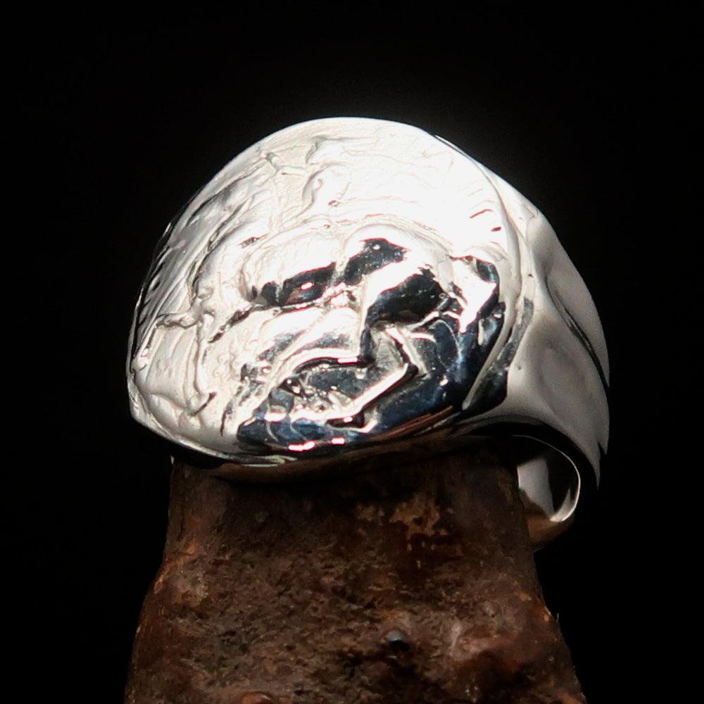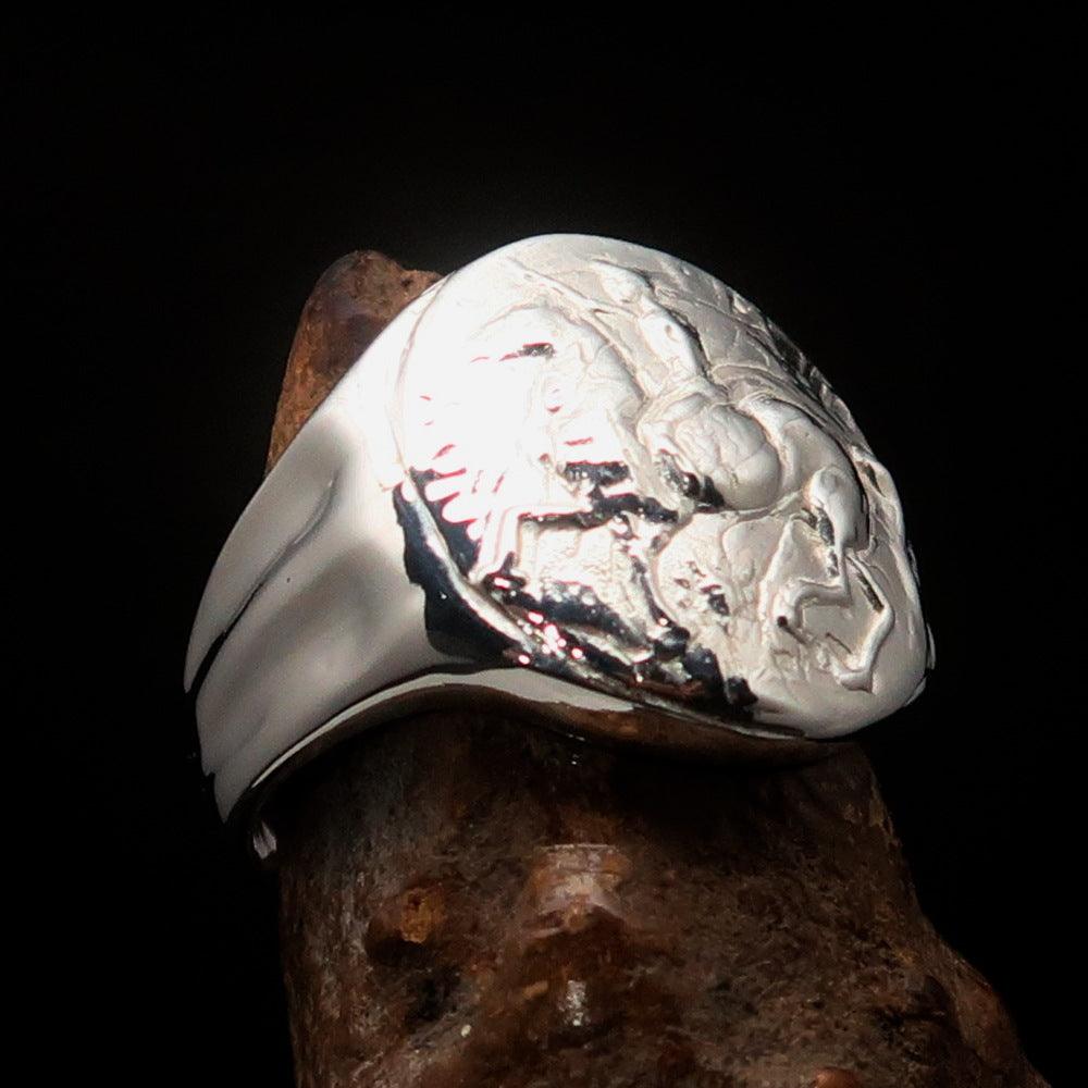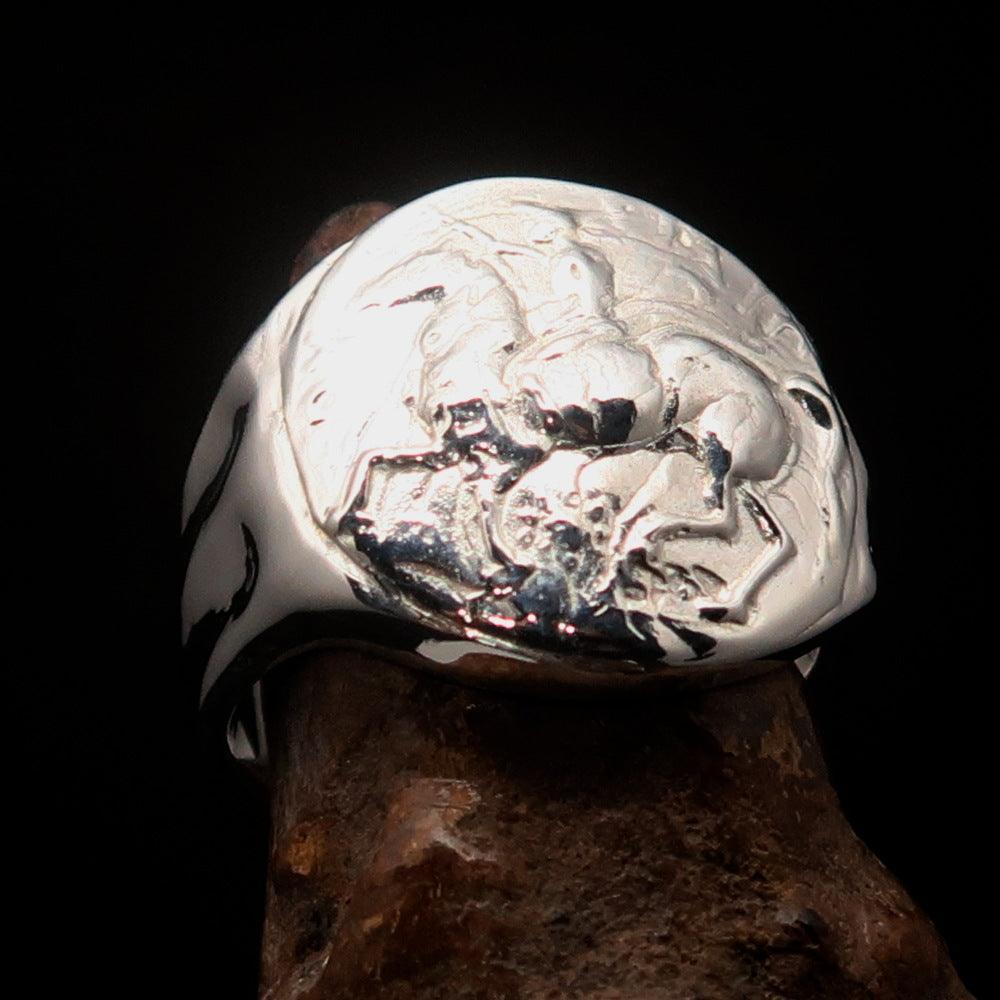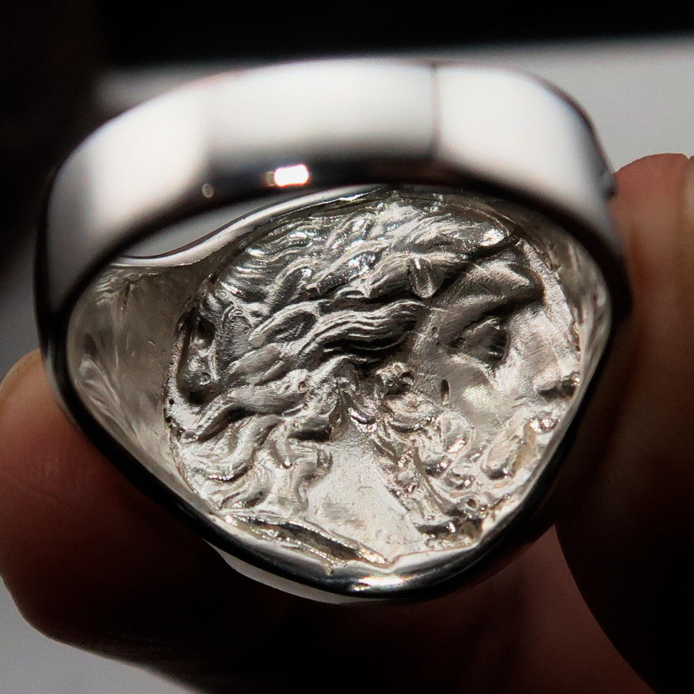 Introducing the exquisite Men's Sterling Silver Ancient Greek Tetradrachm Horseman Ring, a remarkable piece that pays homage to the legendary Alexander the Great. Crafted from solid sterling silver, this ring features a high polished finish that enhances its beauty and elegance. The ring is hallmarked 925, ensuring its authenticity and quality, and is adorned with the RCRN logo, a mark of craftsmanship.
