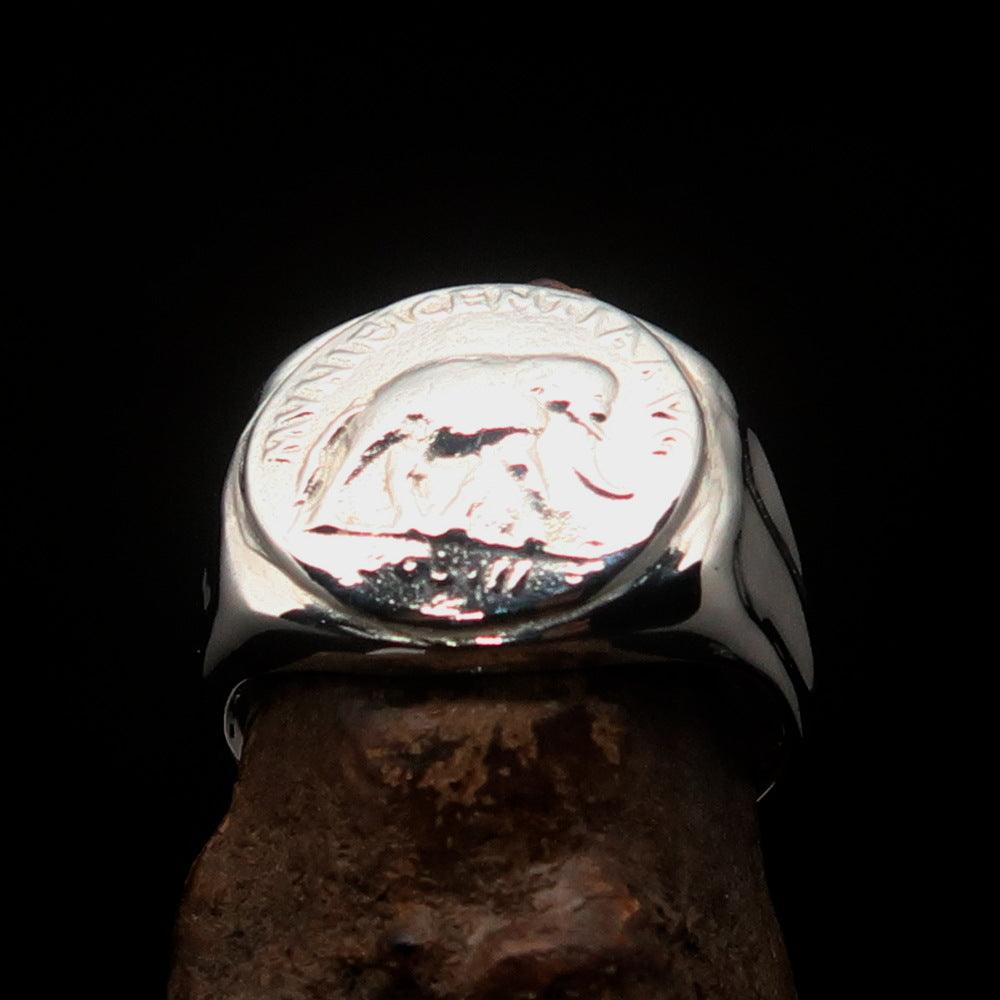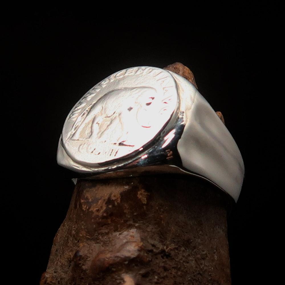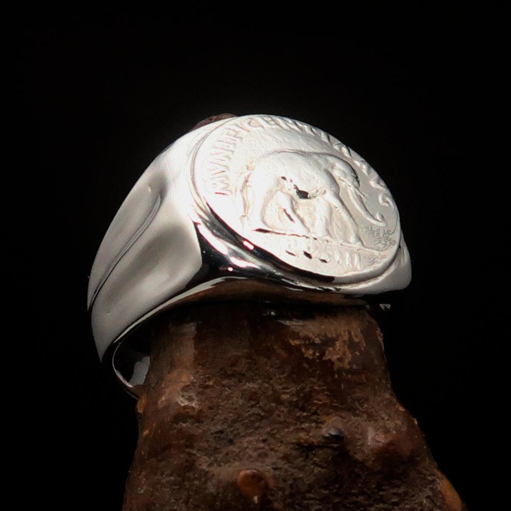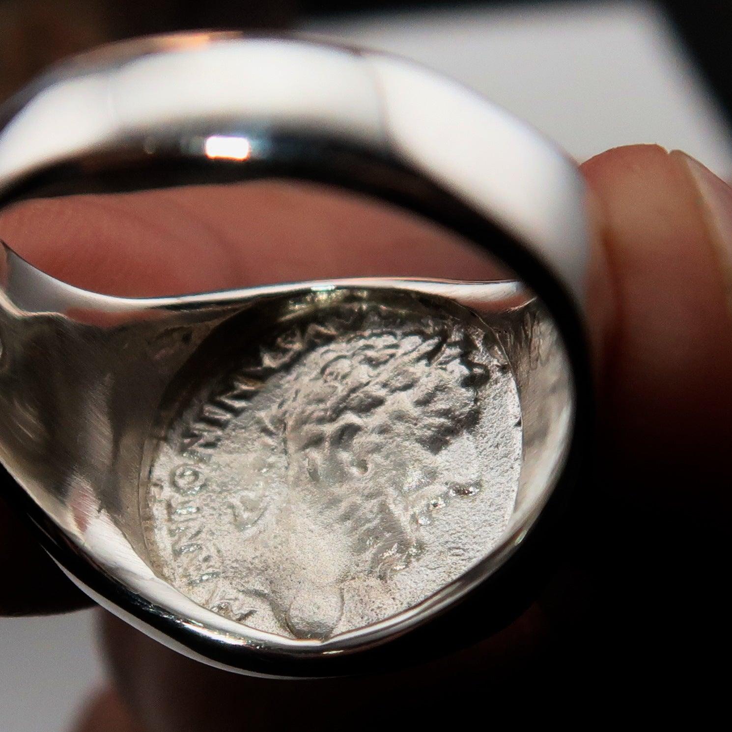 Introducing the exquisite Men's Sterling Silver Ancient Roman Coin Elephant Ring, a remarkable piece that combines historical significance with modern craftsmanship. This stunning ring features a high-polished design showcasing the iconic image of Antonius Pius, a revered Roman Emperor. Made from solid sterling silver, this ring is not only a fashion statement but also a piece of history that you can wear.