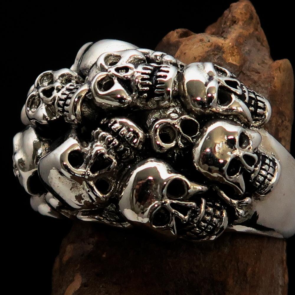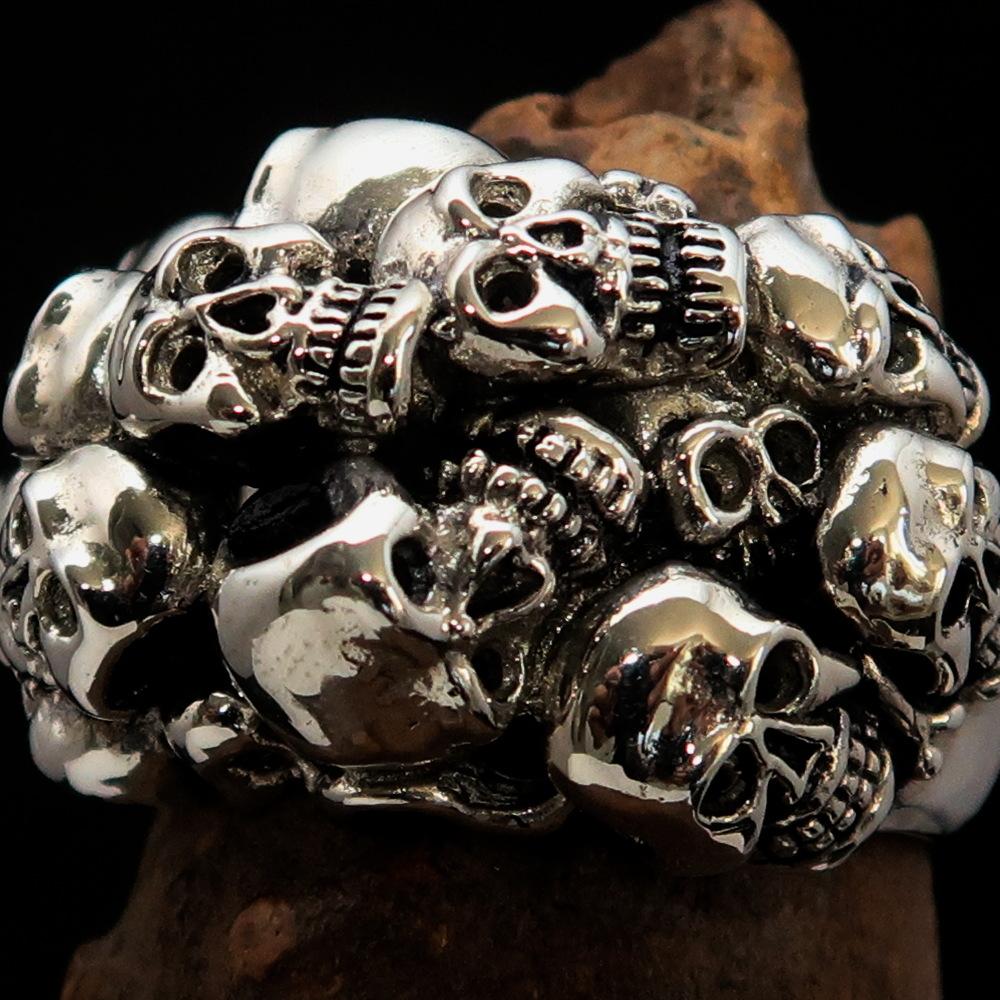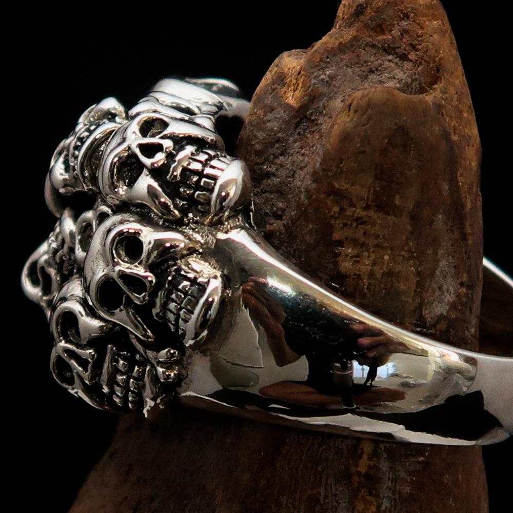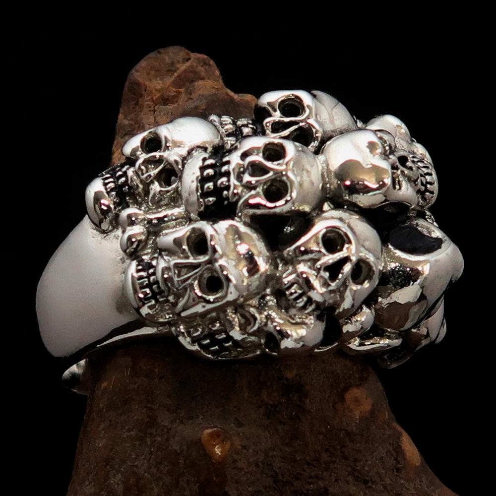 Introducing our stunning Men's Sterling Silver Biker Ring, a unique piece that showcases 13 intricately designed skulls, perfect for those who appreciate bold and edgy jewelry. Made from solid sterling silver, this ring is not only a statement piece but also a durable accessory that can withstand daily wear. The high polished and antiqued finish adds depth and character, making it an eye-catching addition to any outfit.