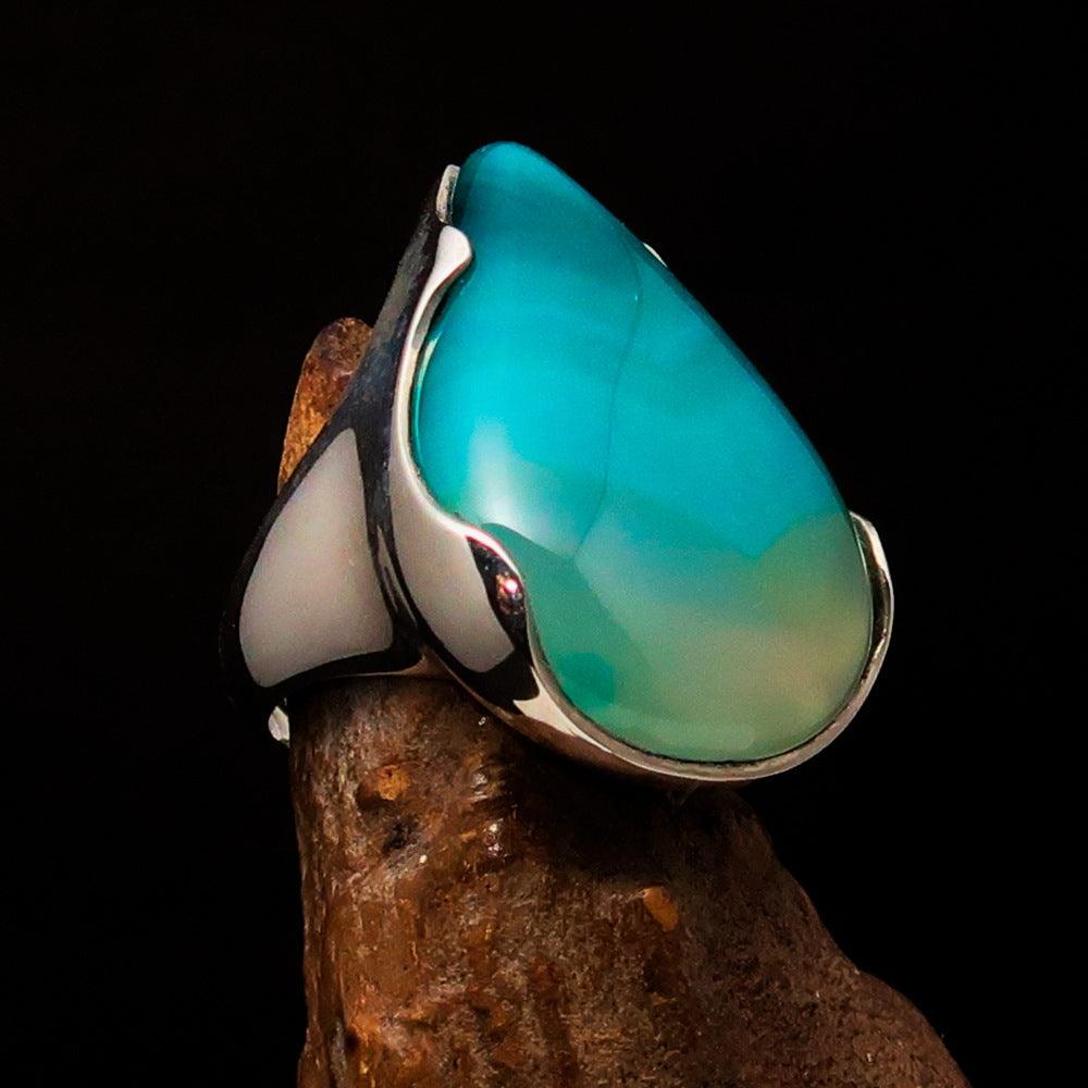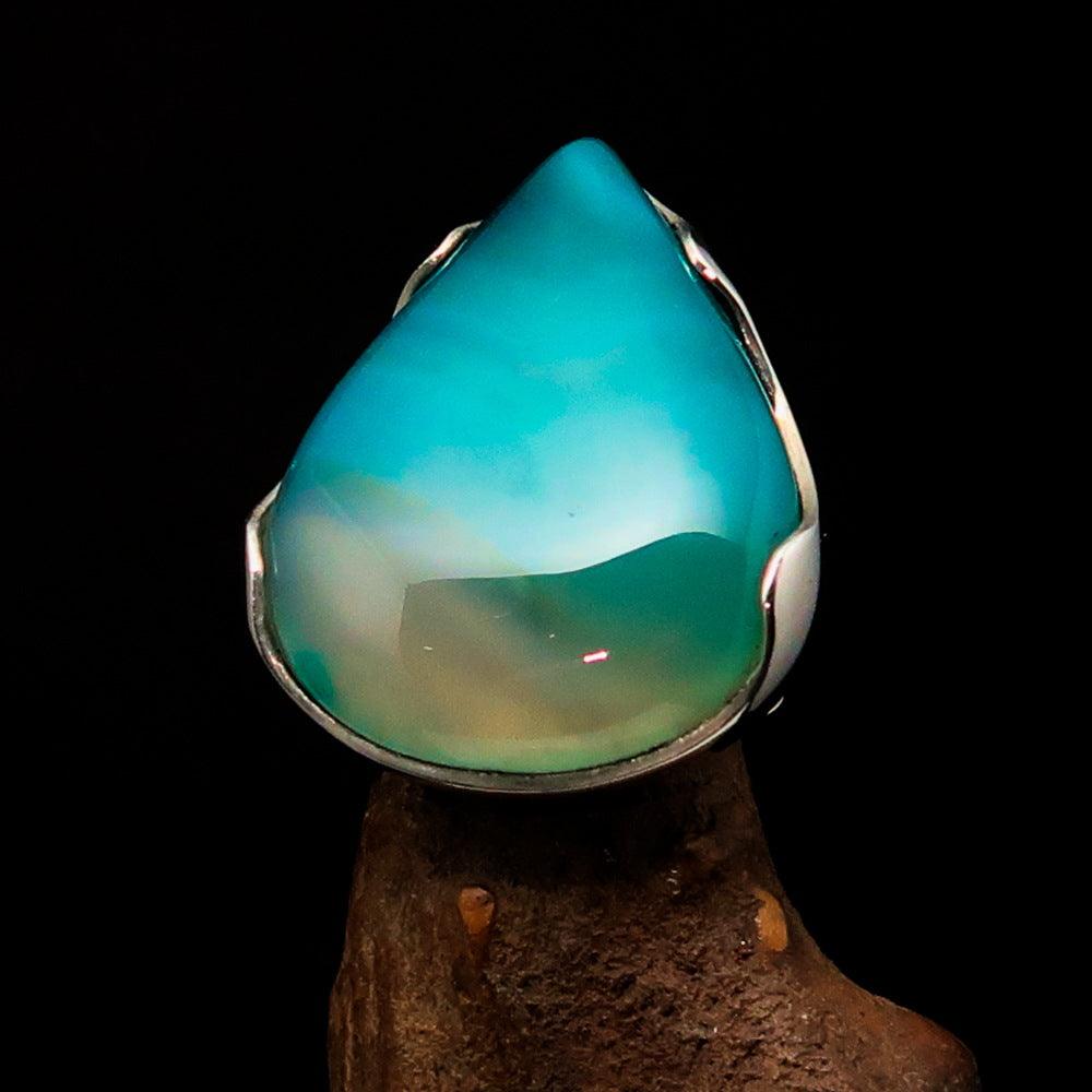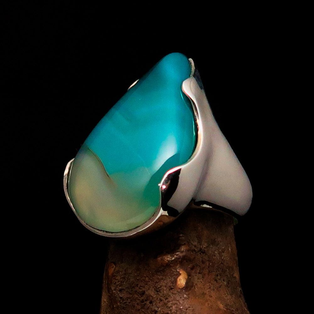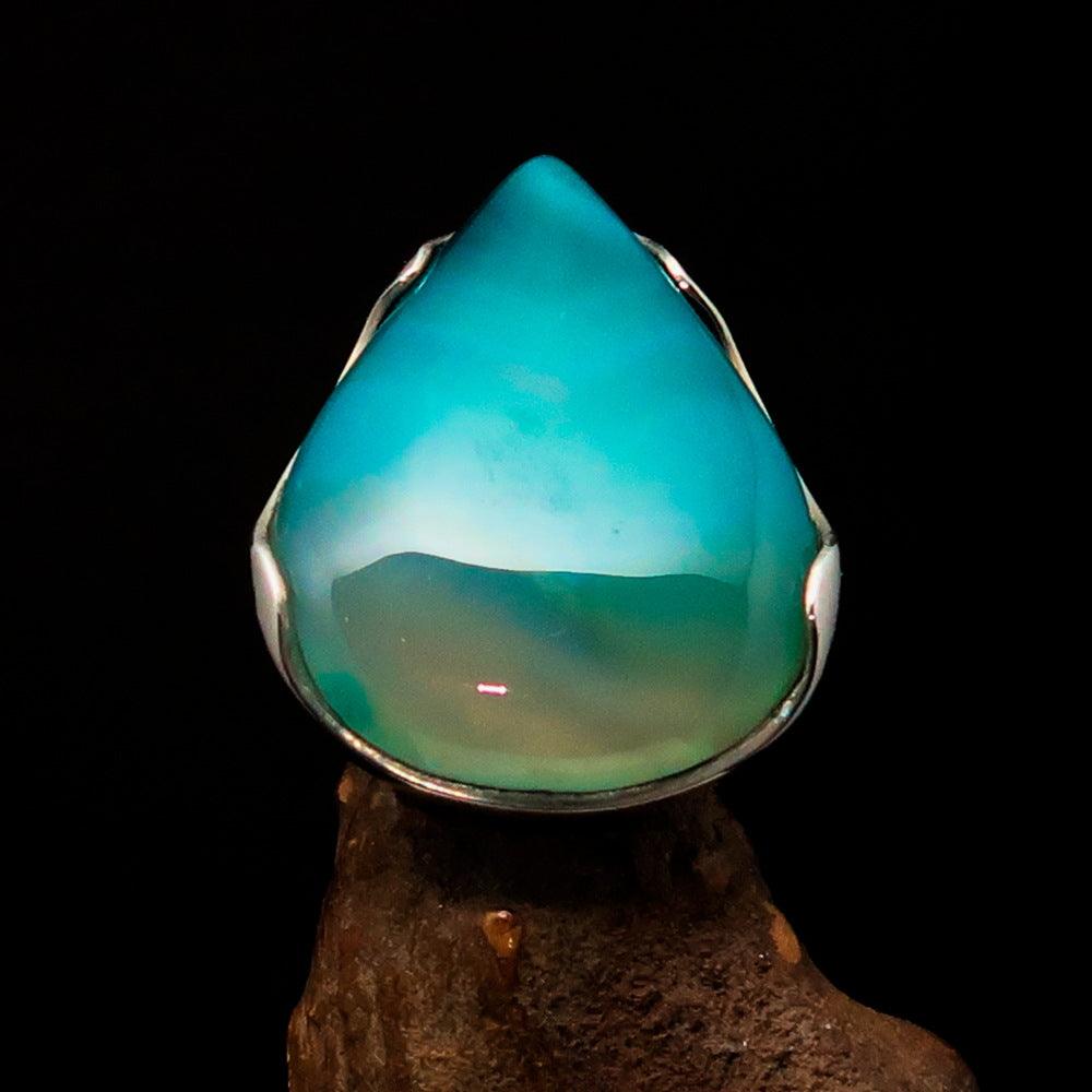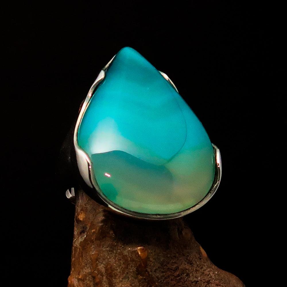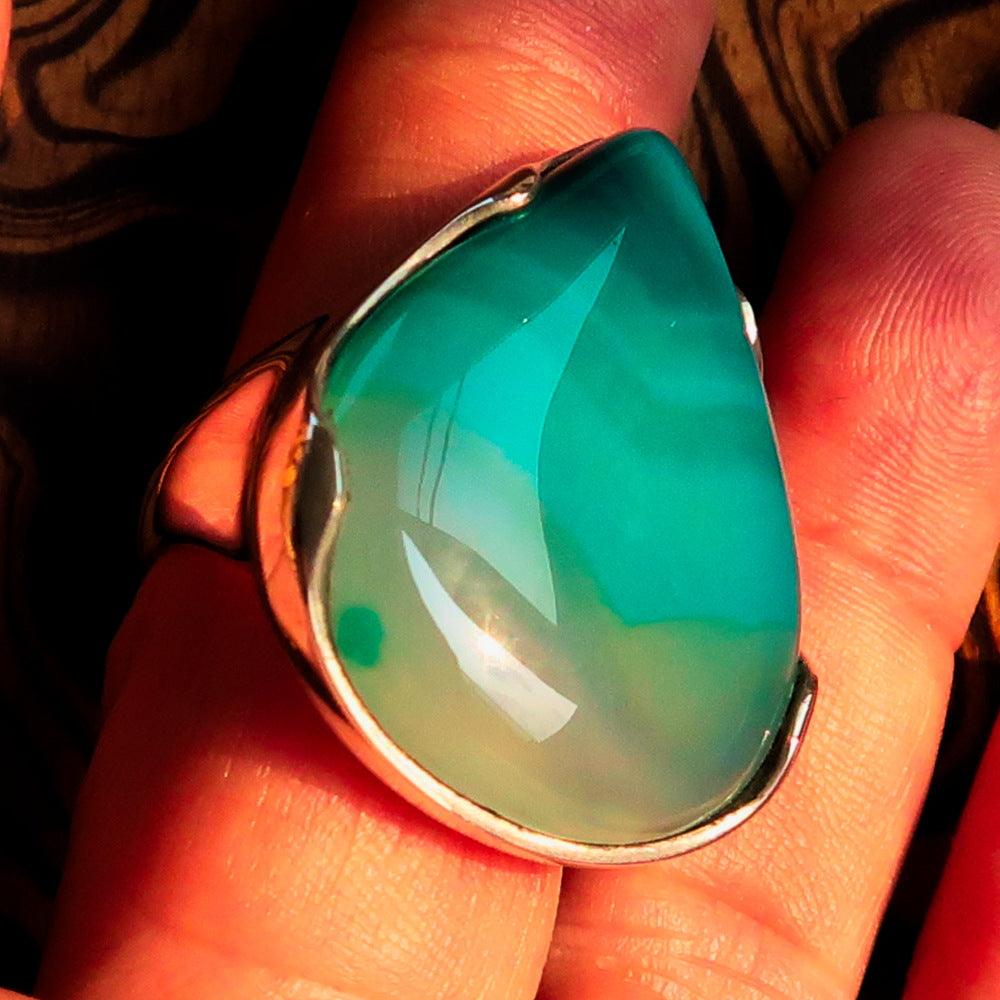 The pear-shaped green Agate cabochon is the centerpiece of this ring, providing a vibrant pop of color. Agate is known for its grounding properties and is believed to promote emotional balance. The unique color and shape of the stone make each ring one-of-a-kind, ensuring that you will own a piece that is truly special.