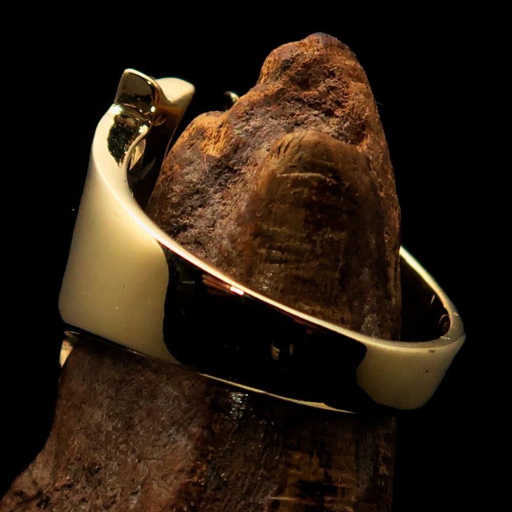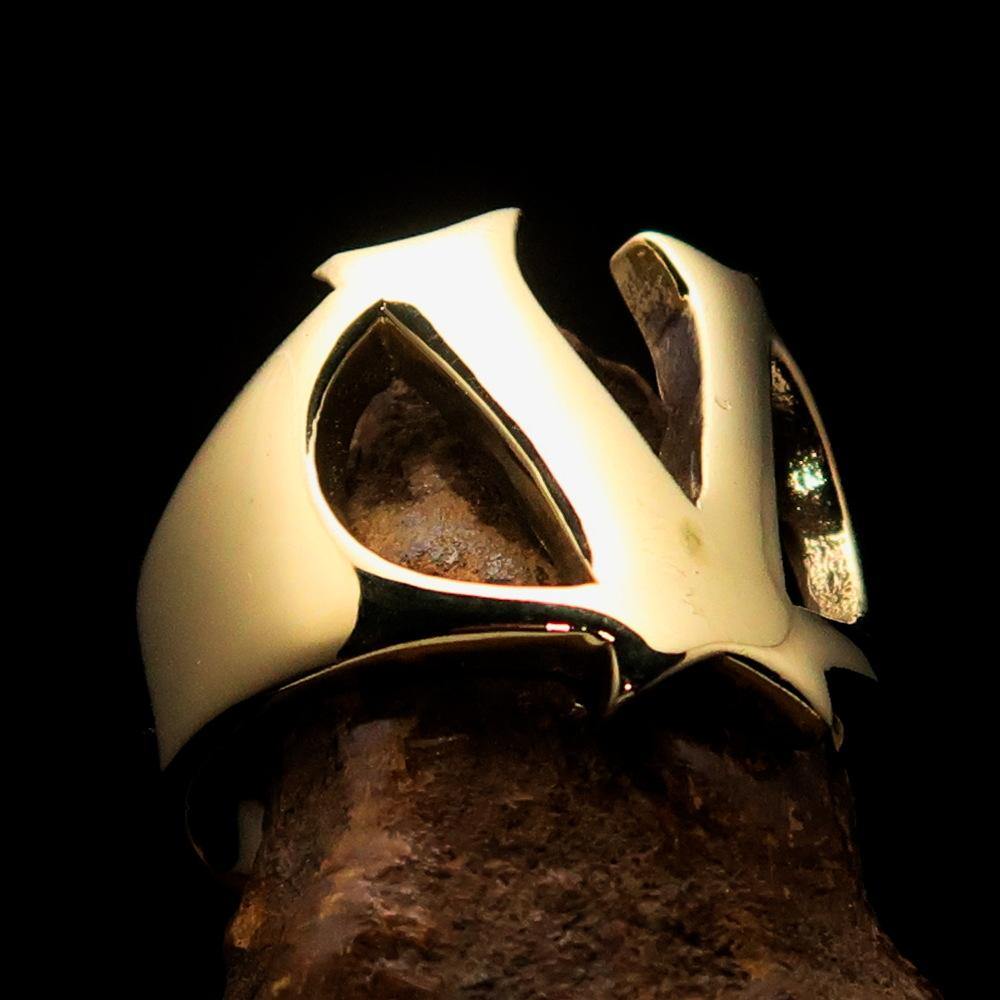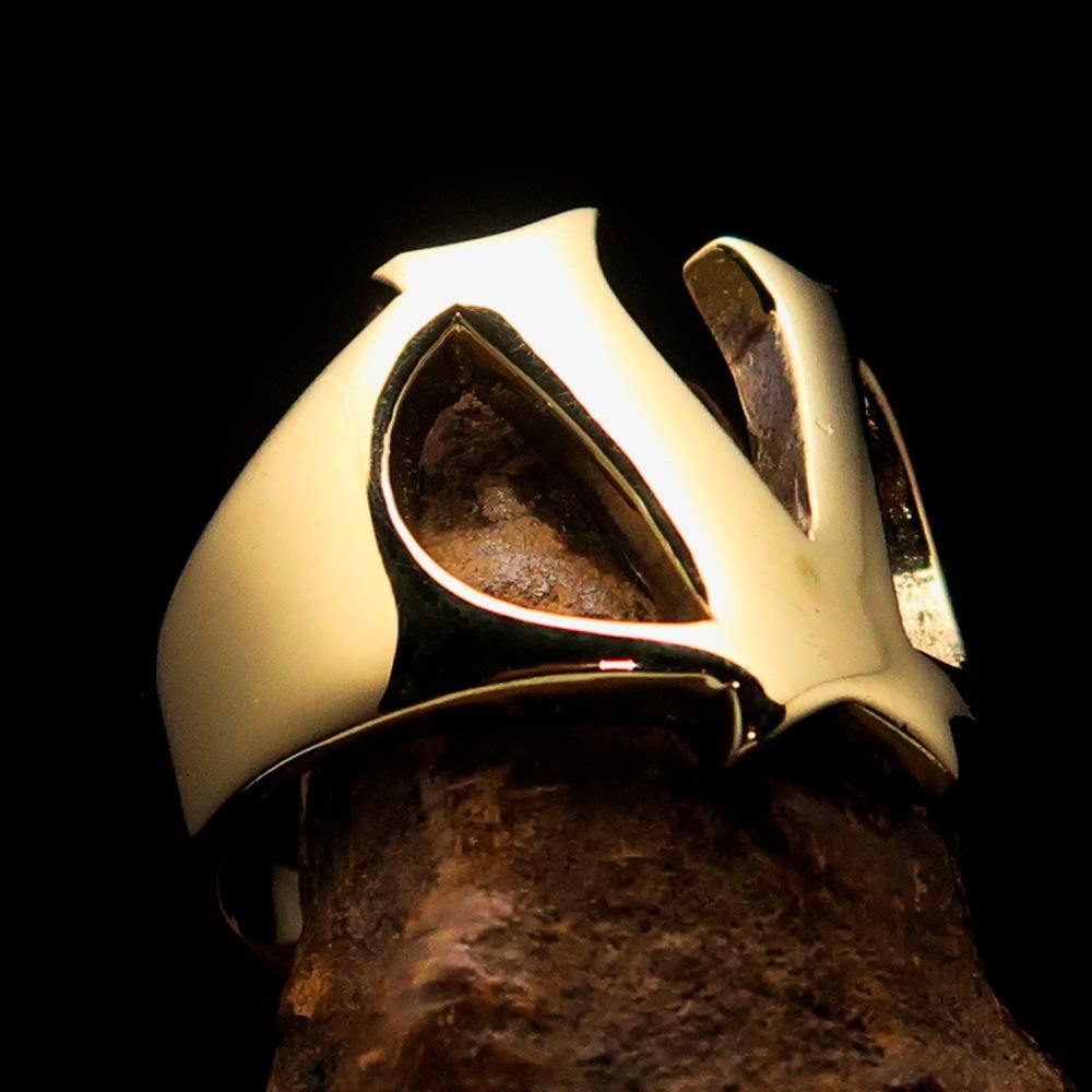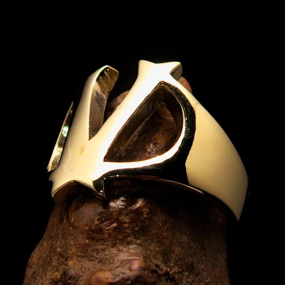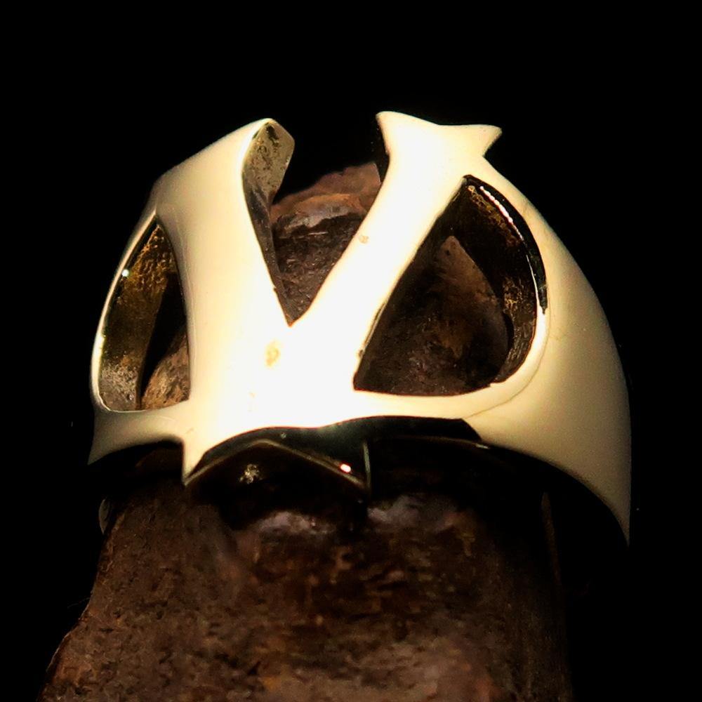 Mirror polished men's brass initial ring featuring a bold letter V, showcasing its shiny finish and elegant design.