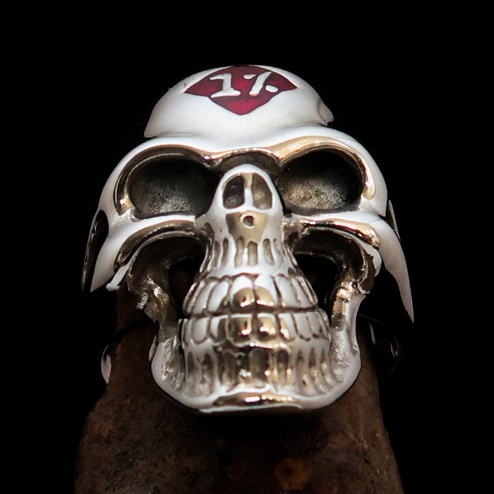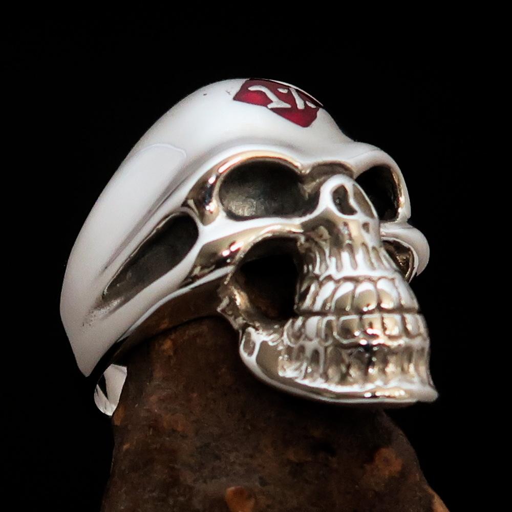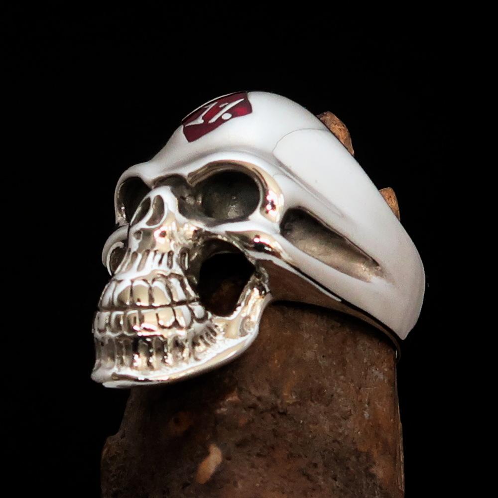 Mirror polished Men's Sterling Silver Outlaw Biker Ring featuring a skull design with red enamel accents, showcasing its high-quality craftsmanship.