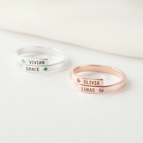 A shiny dainty personalized ring with names and sparkly birthstones of your choice. This ring is a unique gift for coming up Mother's Day.