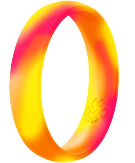Vibrant neon orange, yellow, and pink swirl silicone ring with a sleek bevel design, showcasing its breathable and comfortable fit.