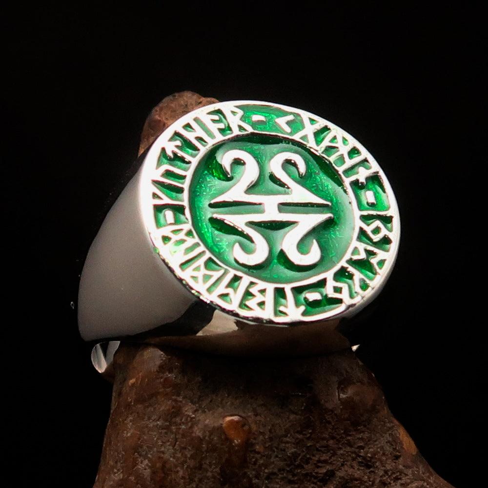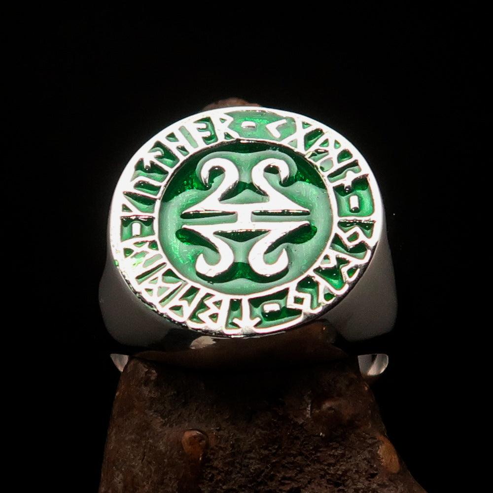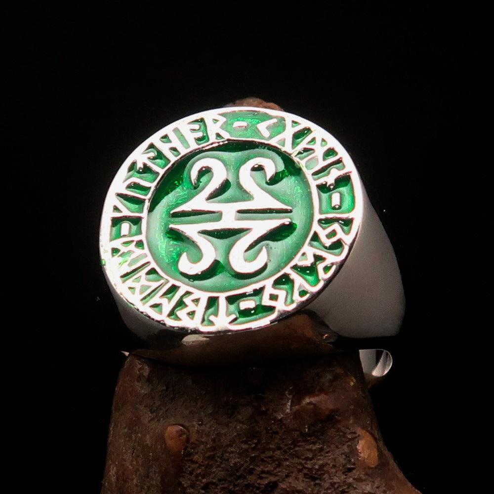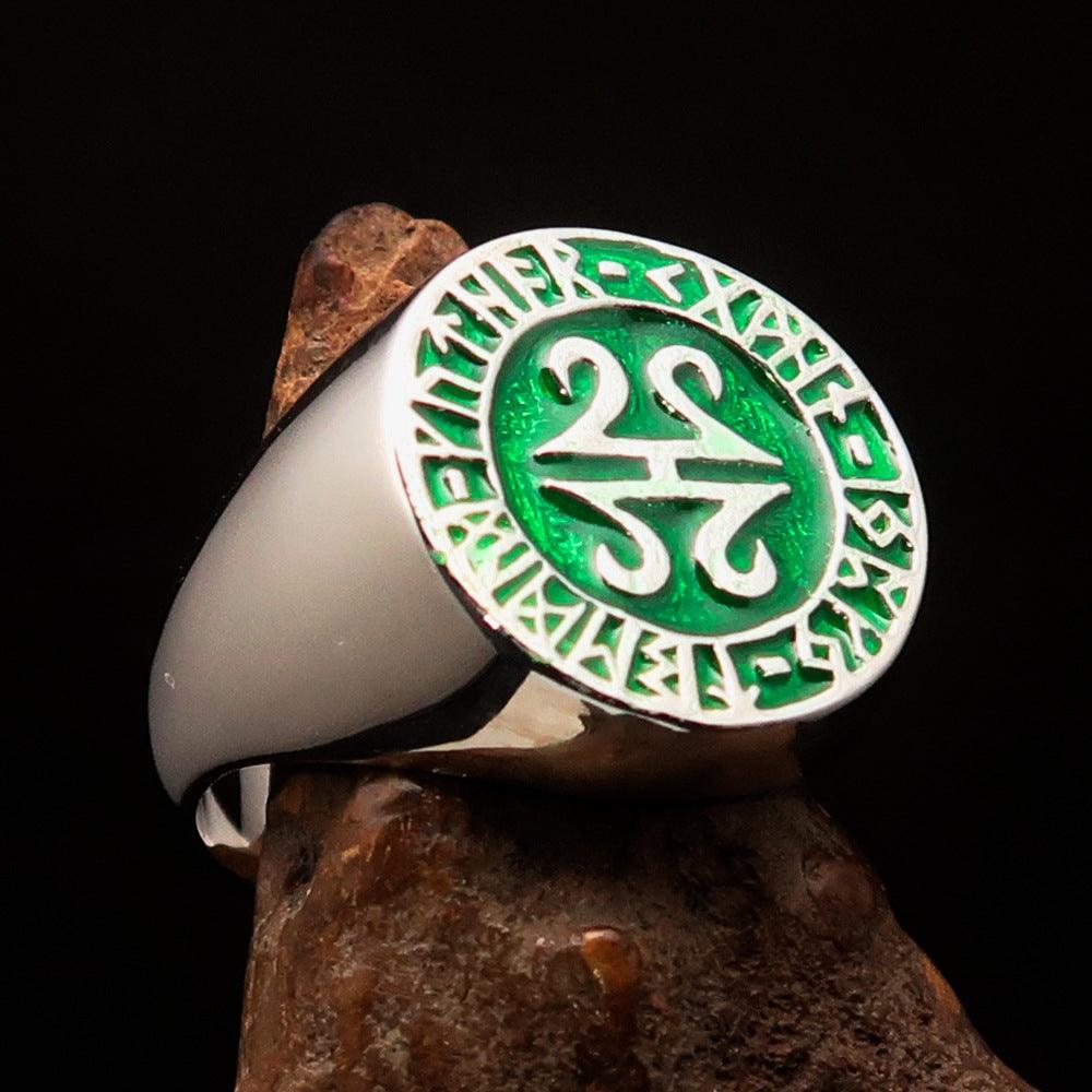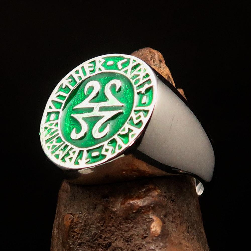 Introducing the Men's Ancient Green Viking Runes Ring, a beautifully crafted piece of jewelry that combines history and style. Made from solid sterling silver, this ring is not only durable but also showcases a unique design inspired by ancient Viking runes. The vibrant green enamel adds a touch of color and elegance, making it a perfect accessory for any occasion.