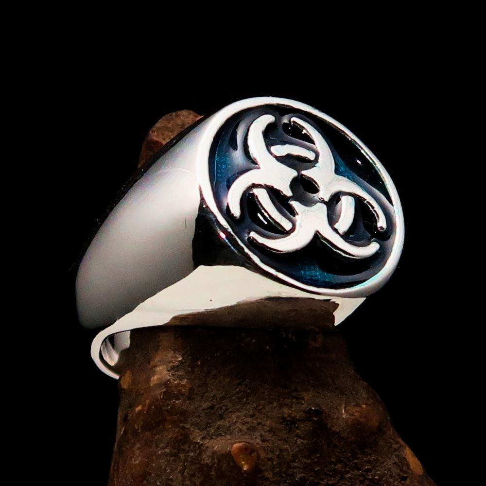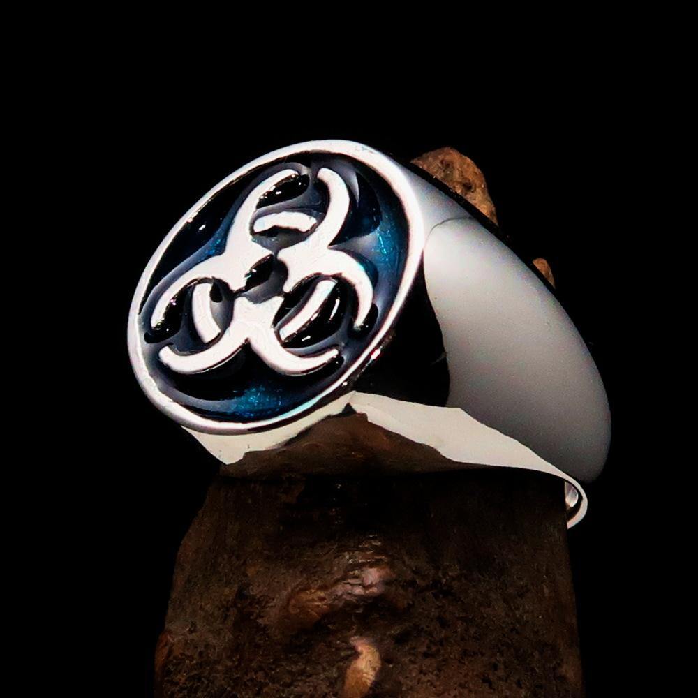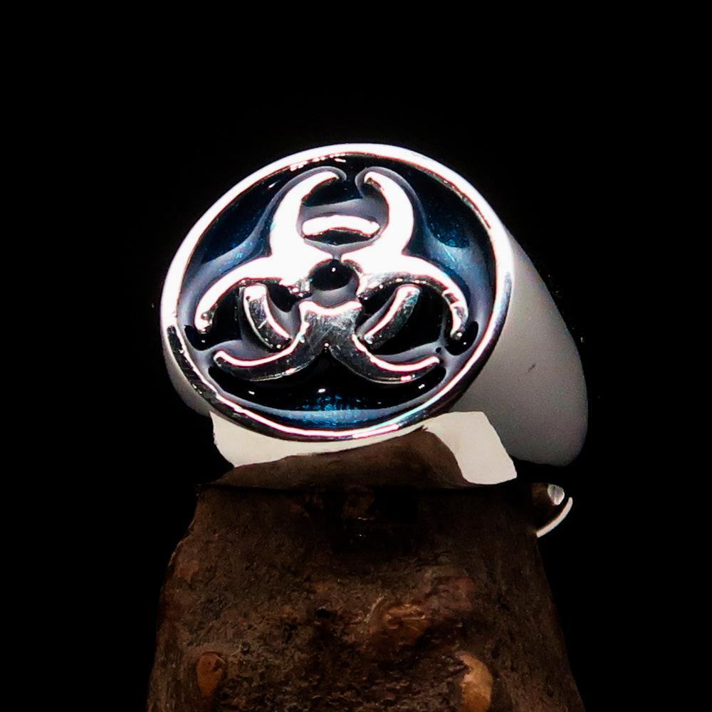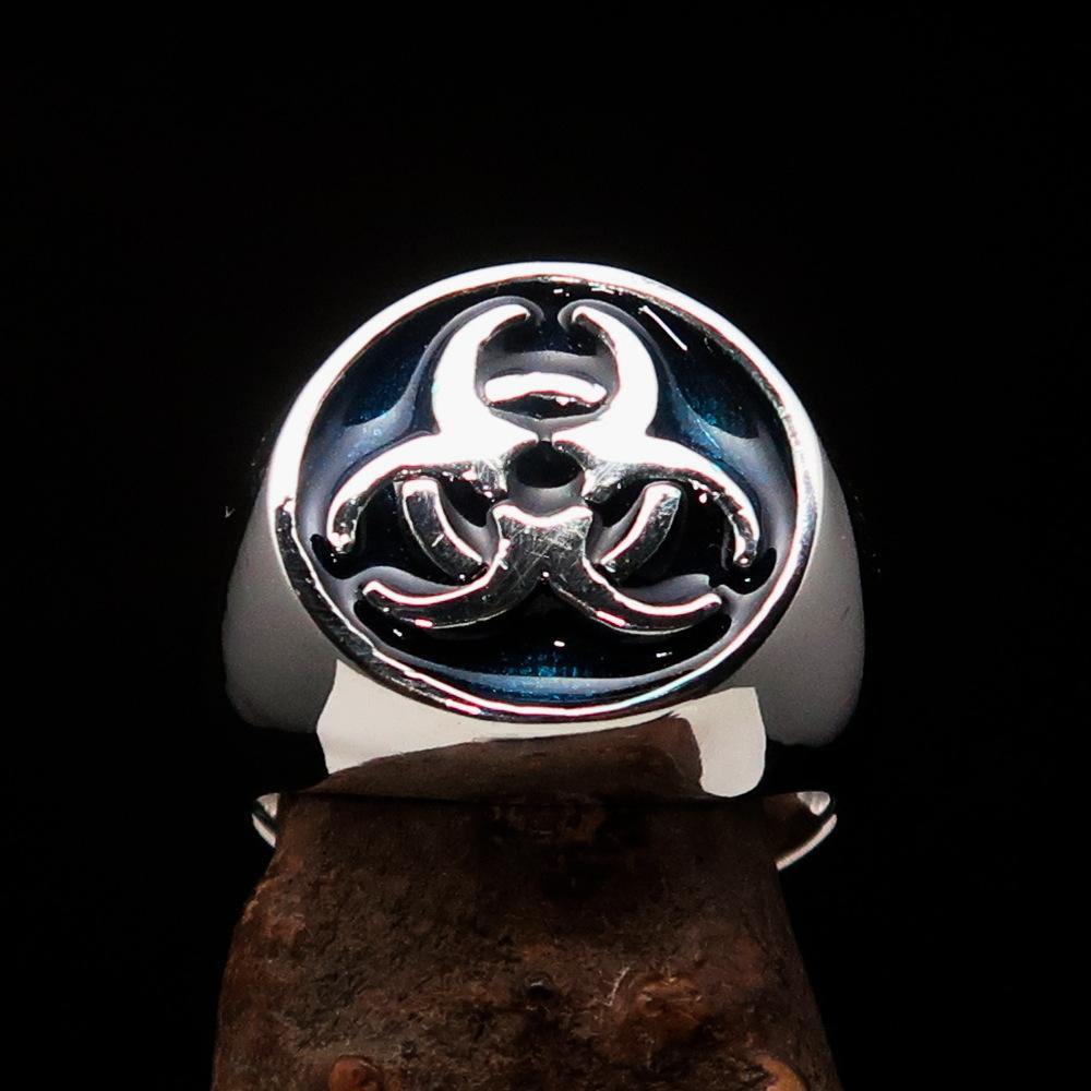 Introducing our stunning Men's Biohazard Ring, a unique piece of jewelry that combines style and edginess. Crafted from solid sterling silver, this ring features a striking blue toxic waste symbol that is sure to catch the eye. The high-polished finish, complemented by an enamel coating, gives it a sleek and modern look, making it a perfect accessory for those who want to stand out.