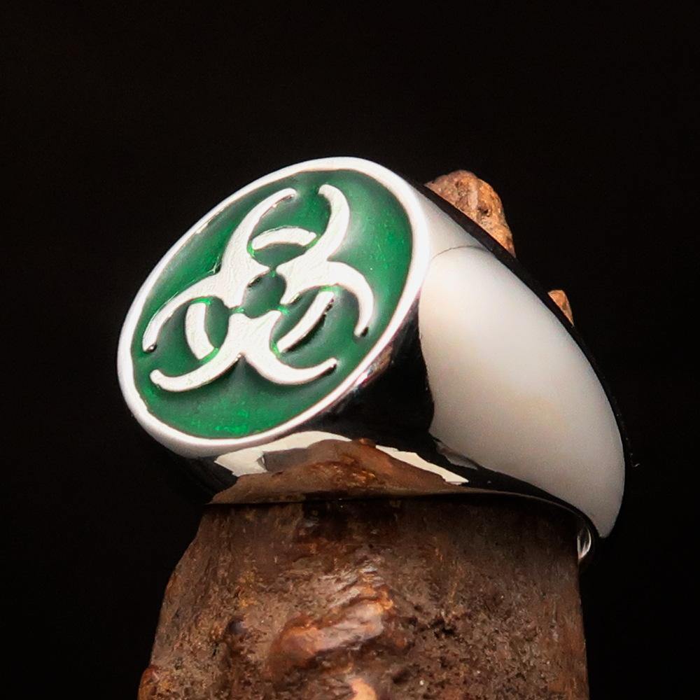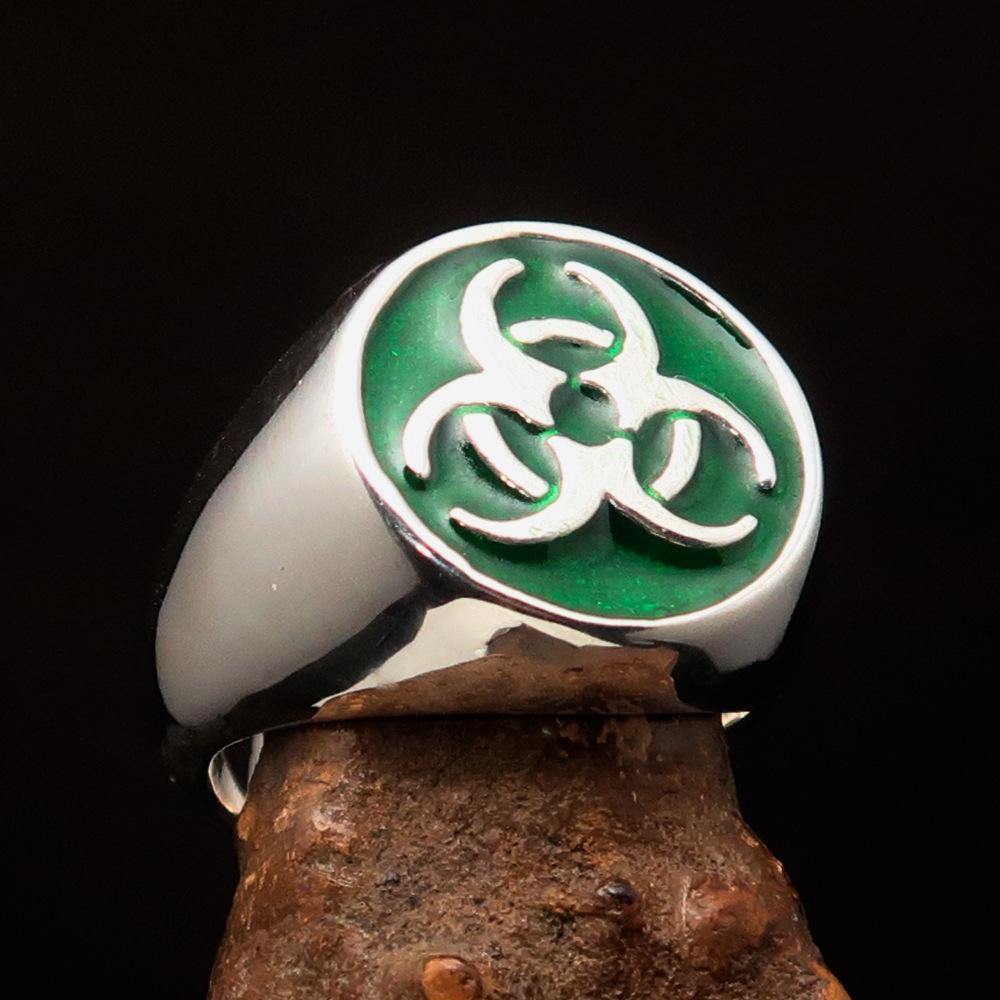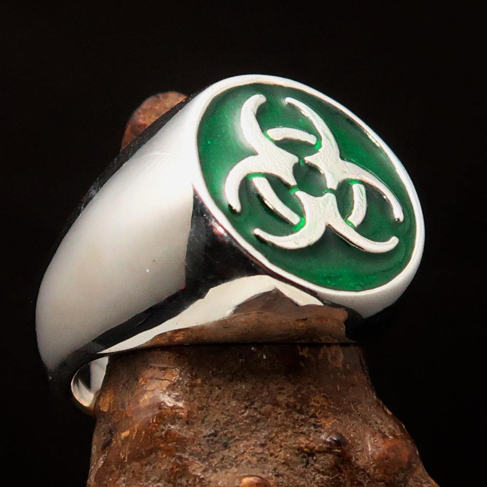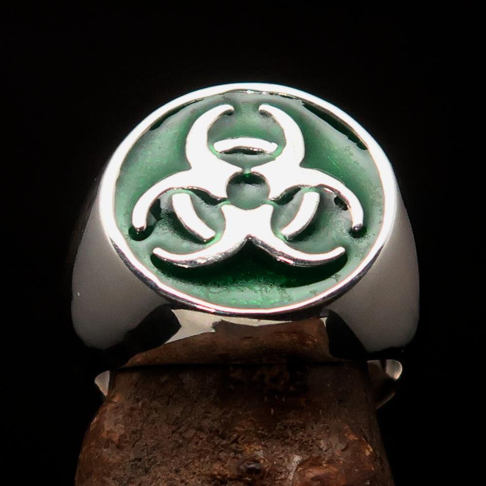 Men's Biohazard Ring made of solid sterling silver featuring a green Toxic Waste Symbol, high polished with enamel finish.