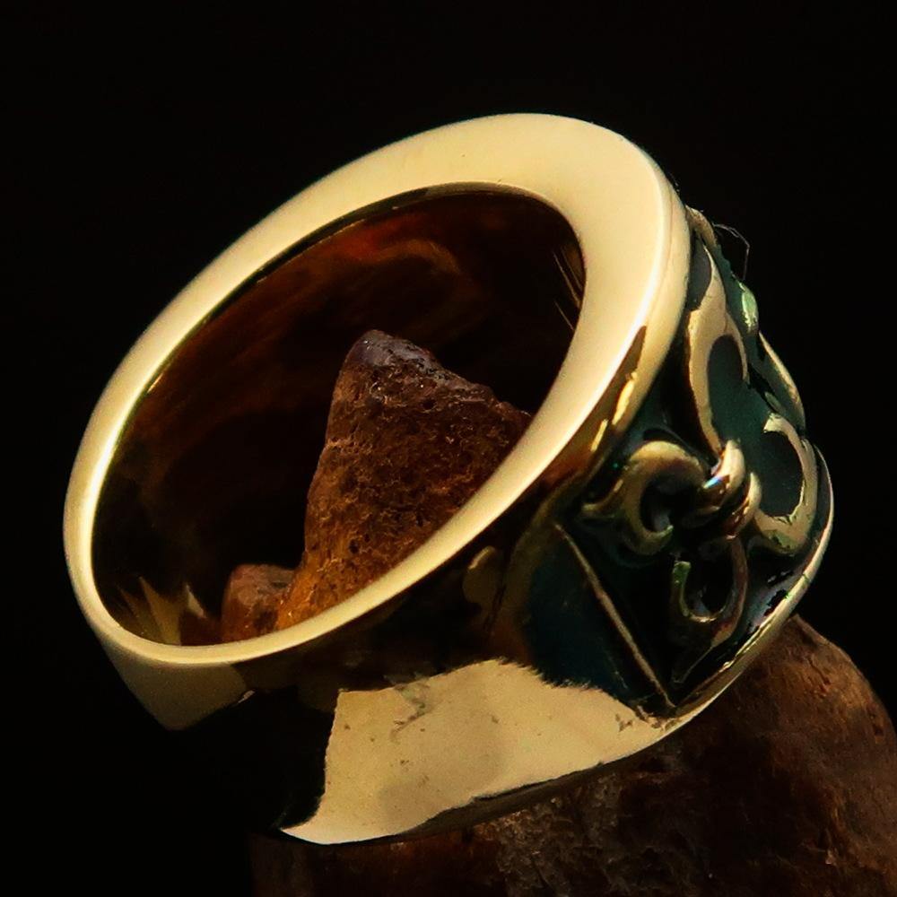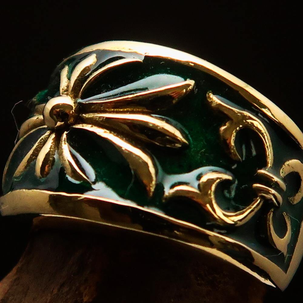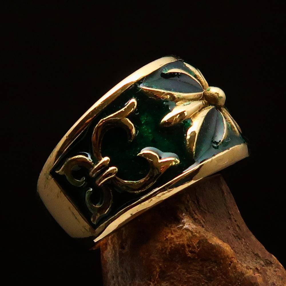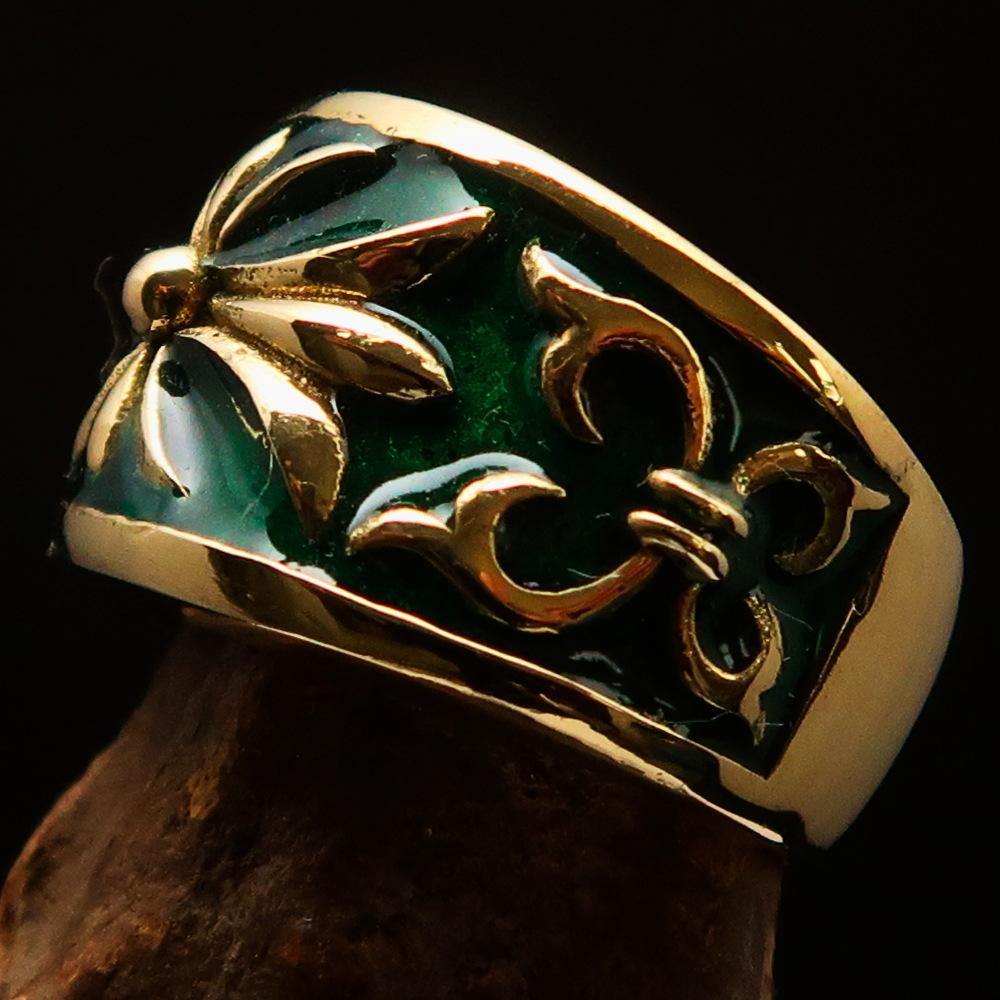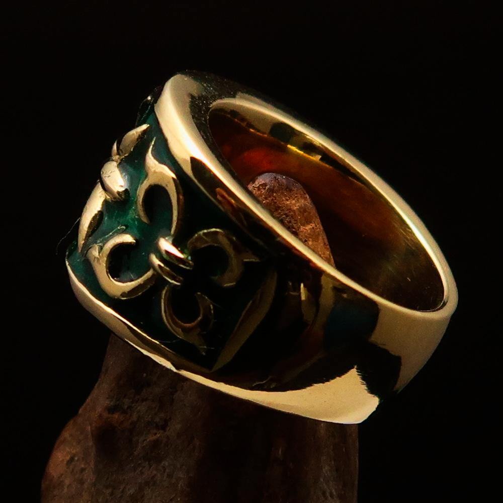 Introducing the exquisite Men's Fleur de Lis Band Ring, a stunning piece crafted from solid brass and adorned with a vibrant green enamel finish. This ring is not just a piece of jewelry; it is a statement of style and sophistication that can elevate any outfit. With its high polished surface, this ring reflects light beautifully, making it an eye-catching accessory for both casual and formal occasions.
