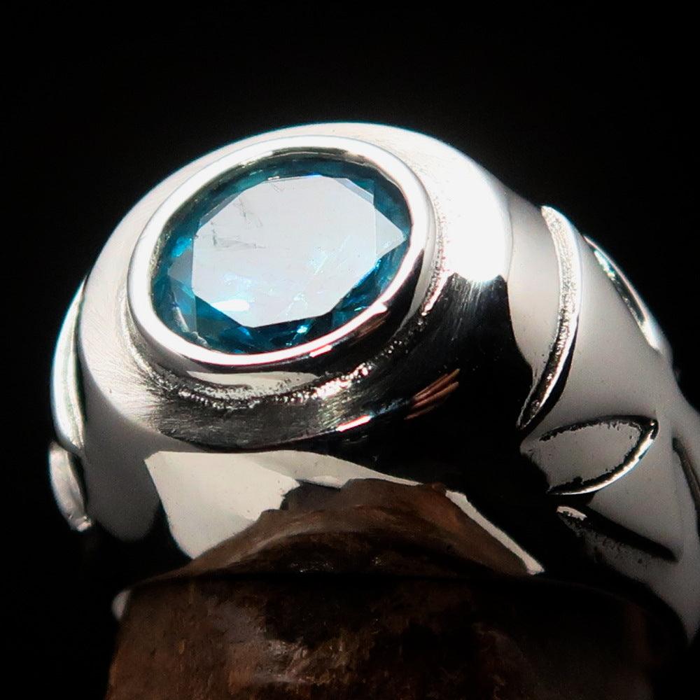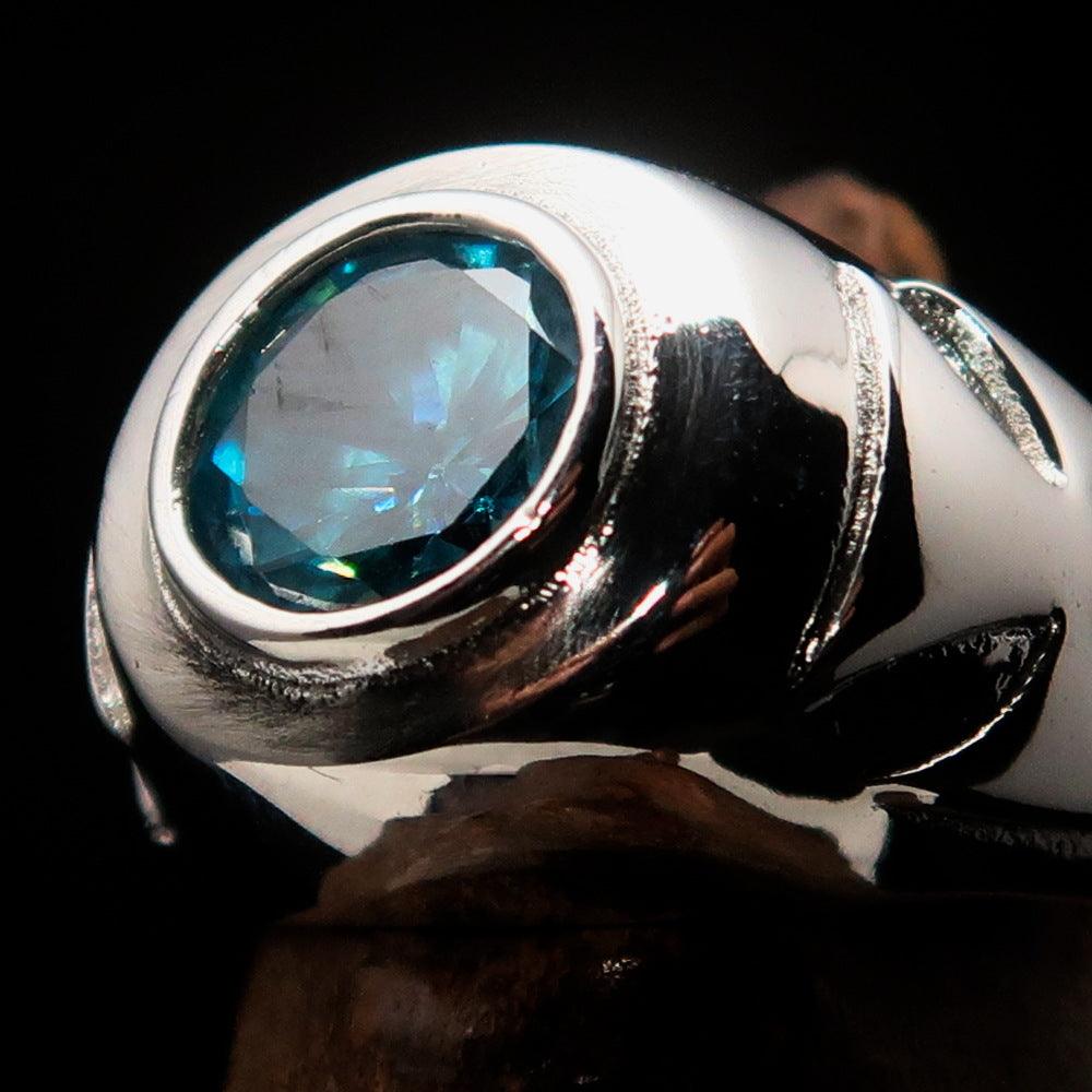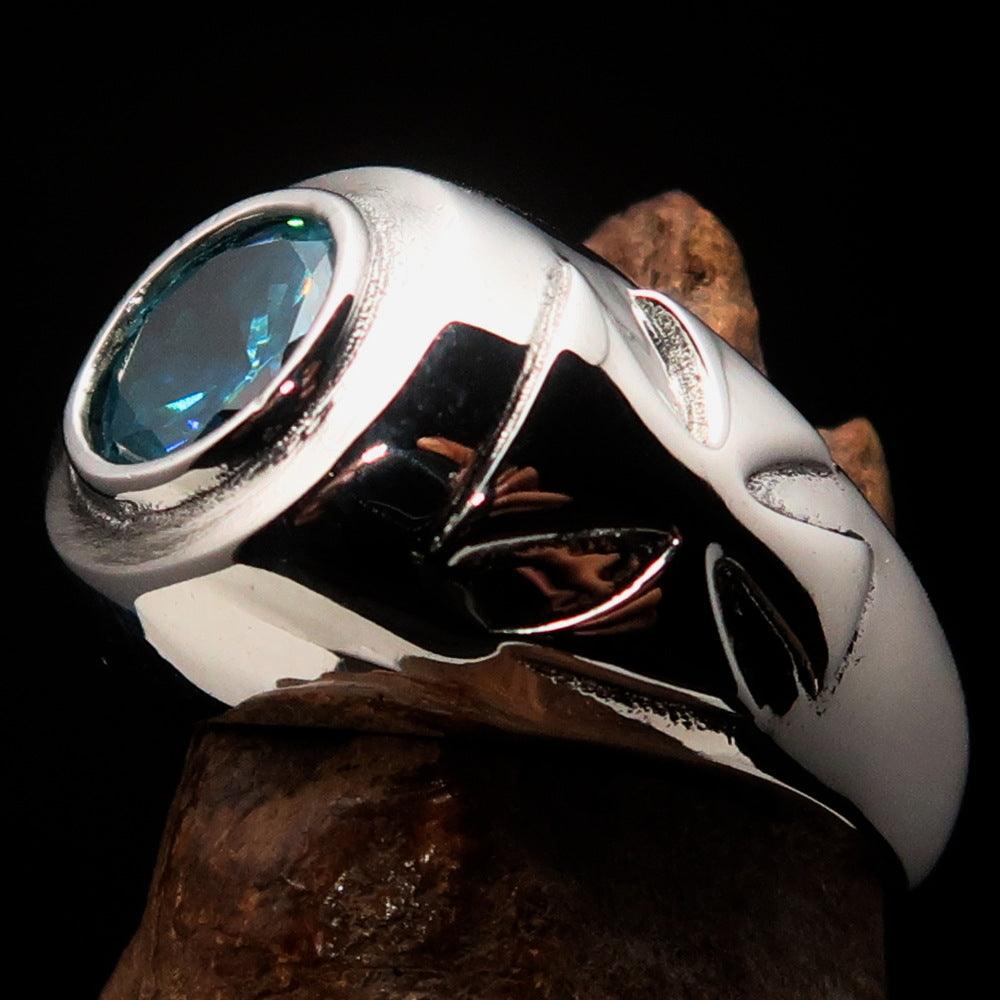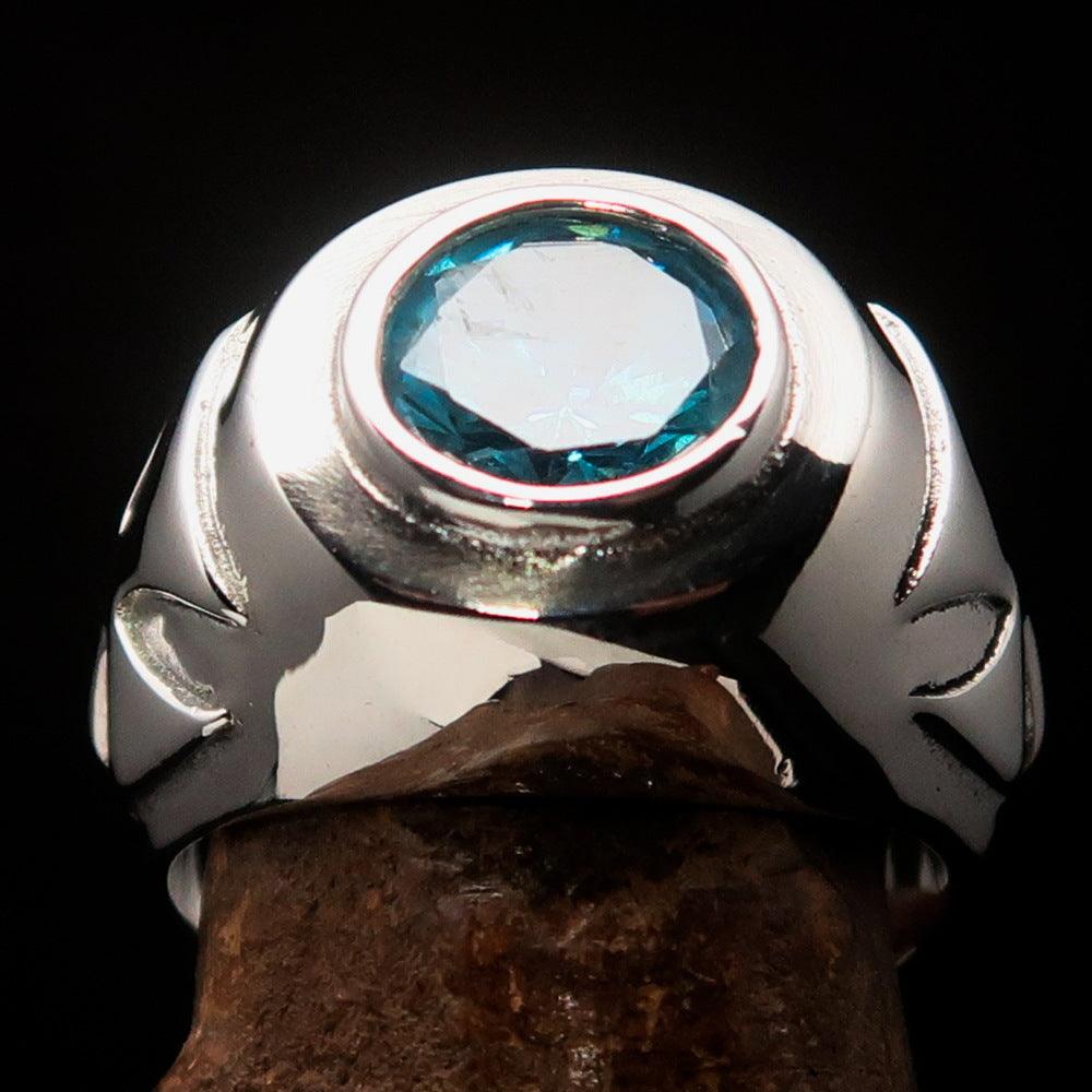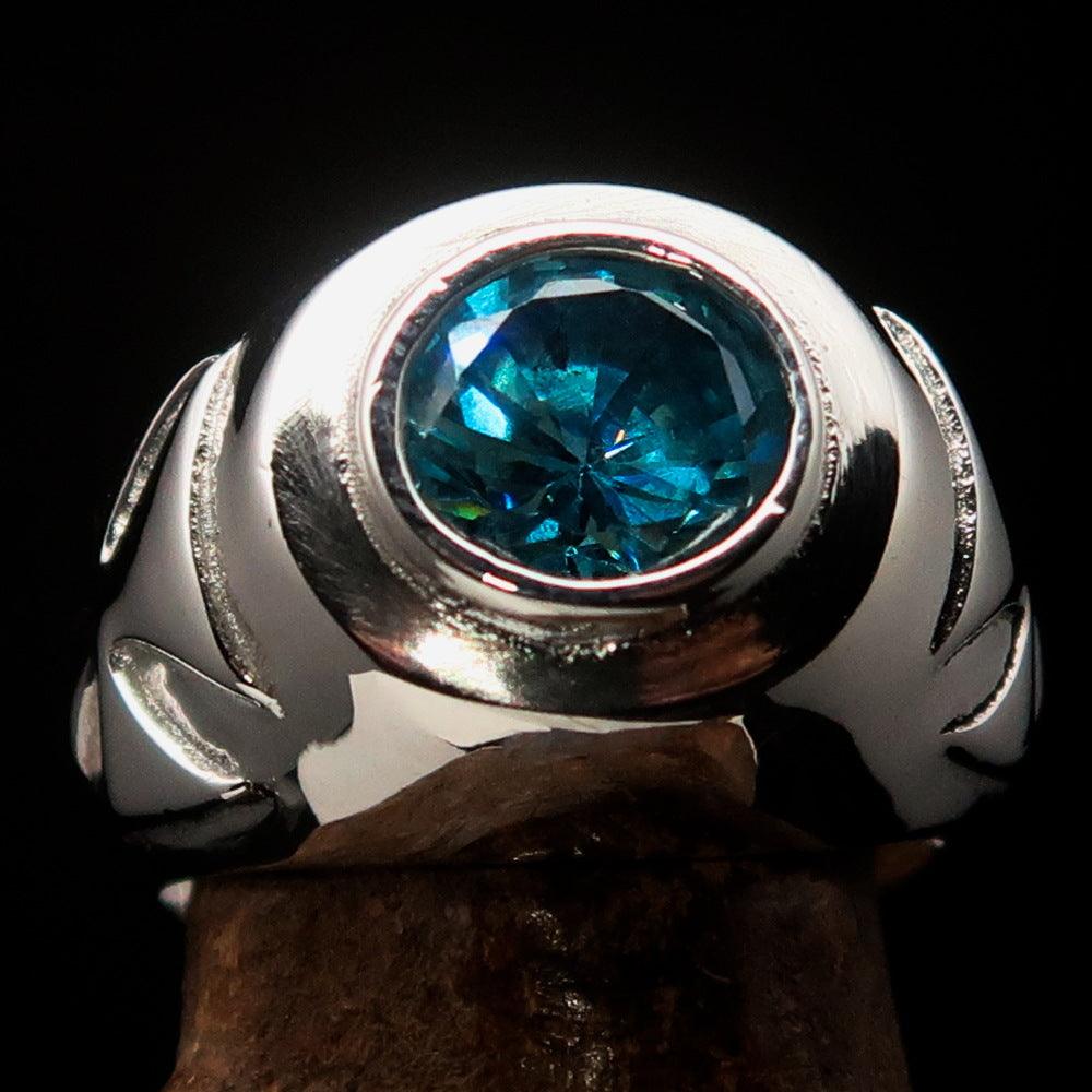 The ring measures 16 mm wide, providing a bold yet comfortable fit for everyday wear. The centerpiece features a 10 mm round blue Cubic Zirconia stone that sparkles brilliantly, catching the light from every angle. Whether you are dressing up for a special occasion or looking for a unique accessory for daily wear, this ring is the perfect choice.