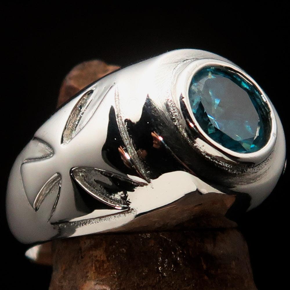 Introducing the exquisite Men's Solitaire Iron Cross Ring, a perfect blend of style and craftsmanship. This ring is made from solid sterling silver and features a striking blue Cubic Zirconia (CZ) stone that adds a touch of elegance to any outfit. The high-polished finish enhances the ring's overall appeal, making it a standout piece in any jewelry collection.