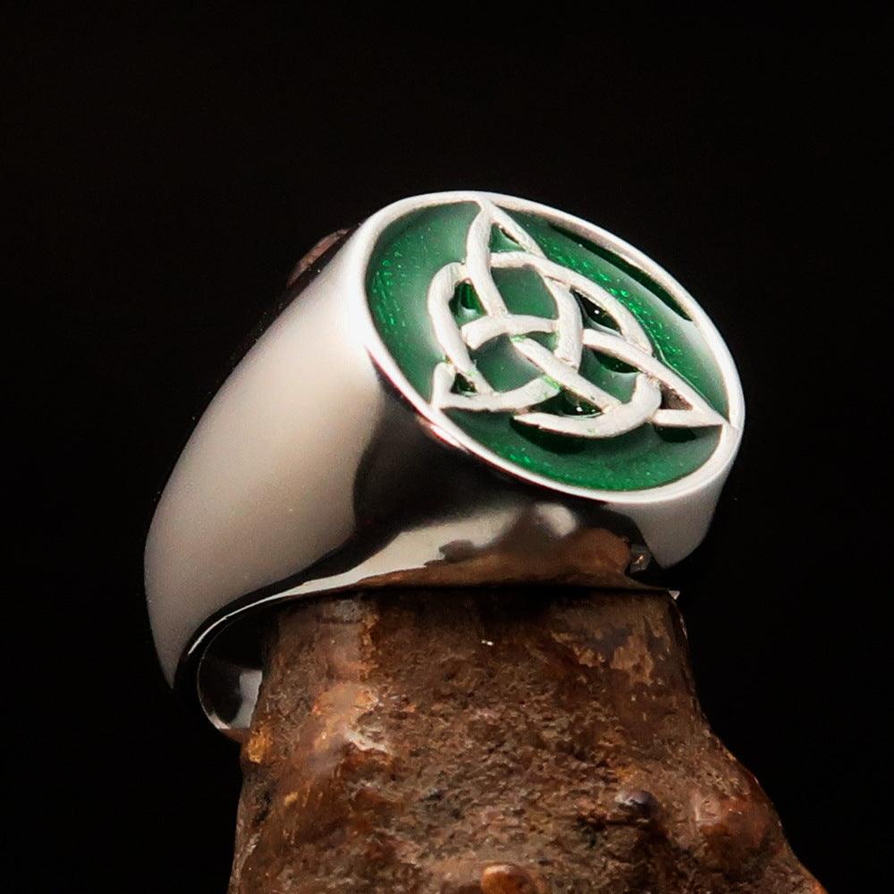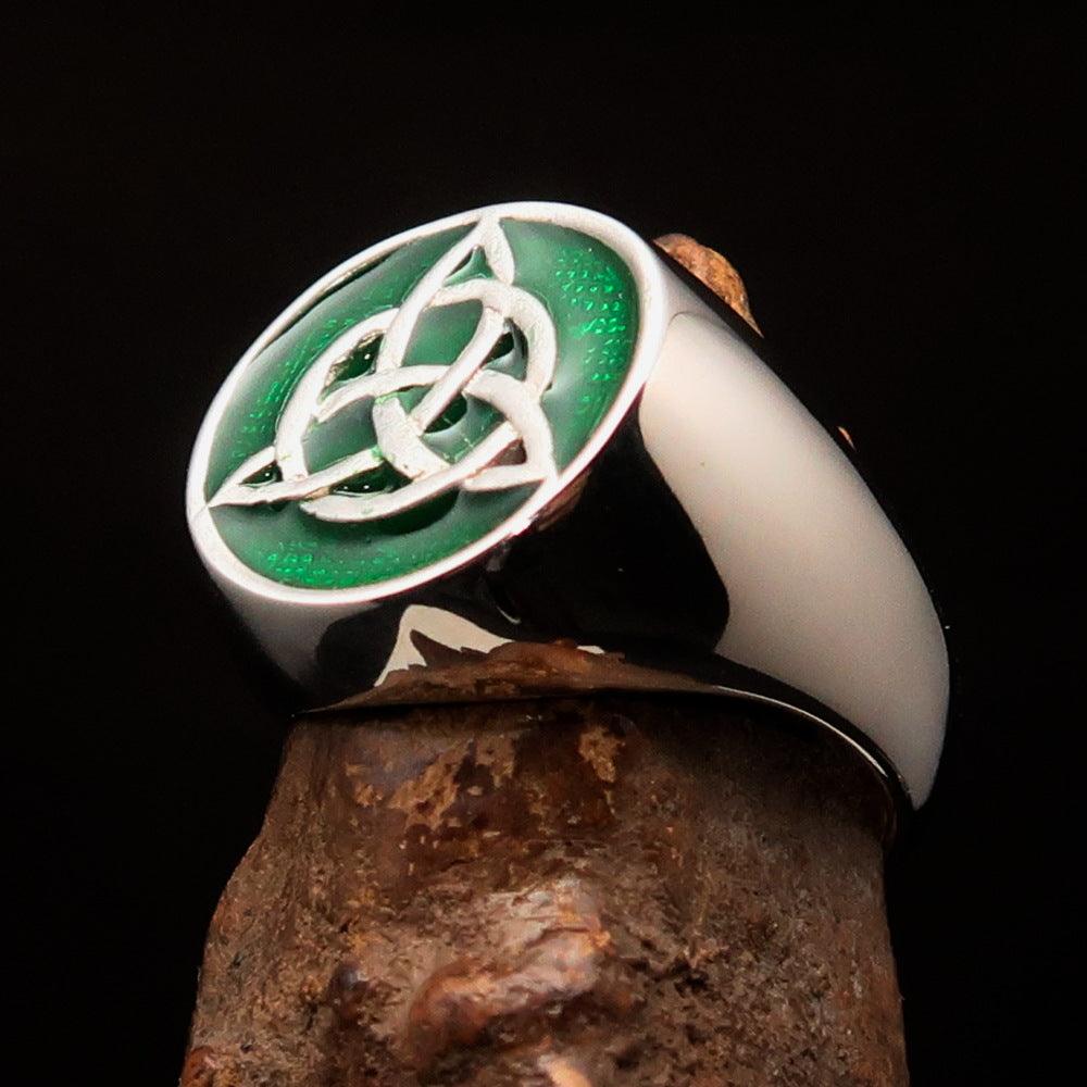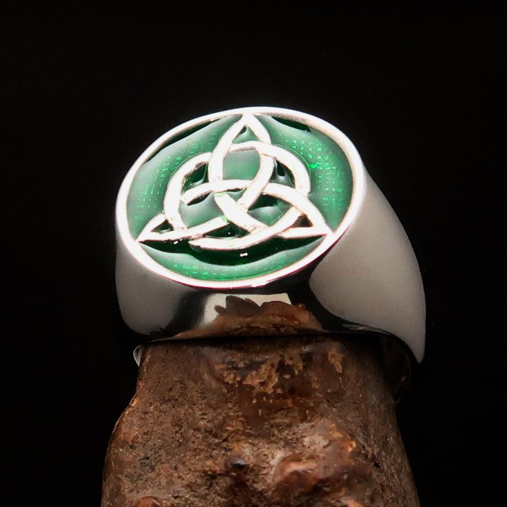 Introducing the beautifully crafted Men's Triquetra Ring, a stunning piece of jewelry that showcases the intricate design of the Celtic Triskelion Knot. Made from solid sterling silver, this ring is not only a fashion statement but also a symbol of heritage and craftsmanship. The vibrant green enamel adds a unique touch, making it a perfect accessory for any occasion.