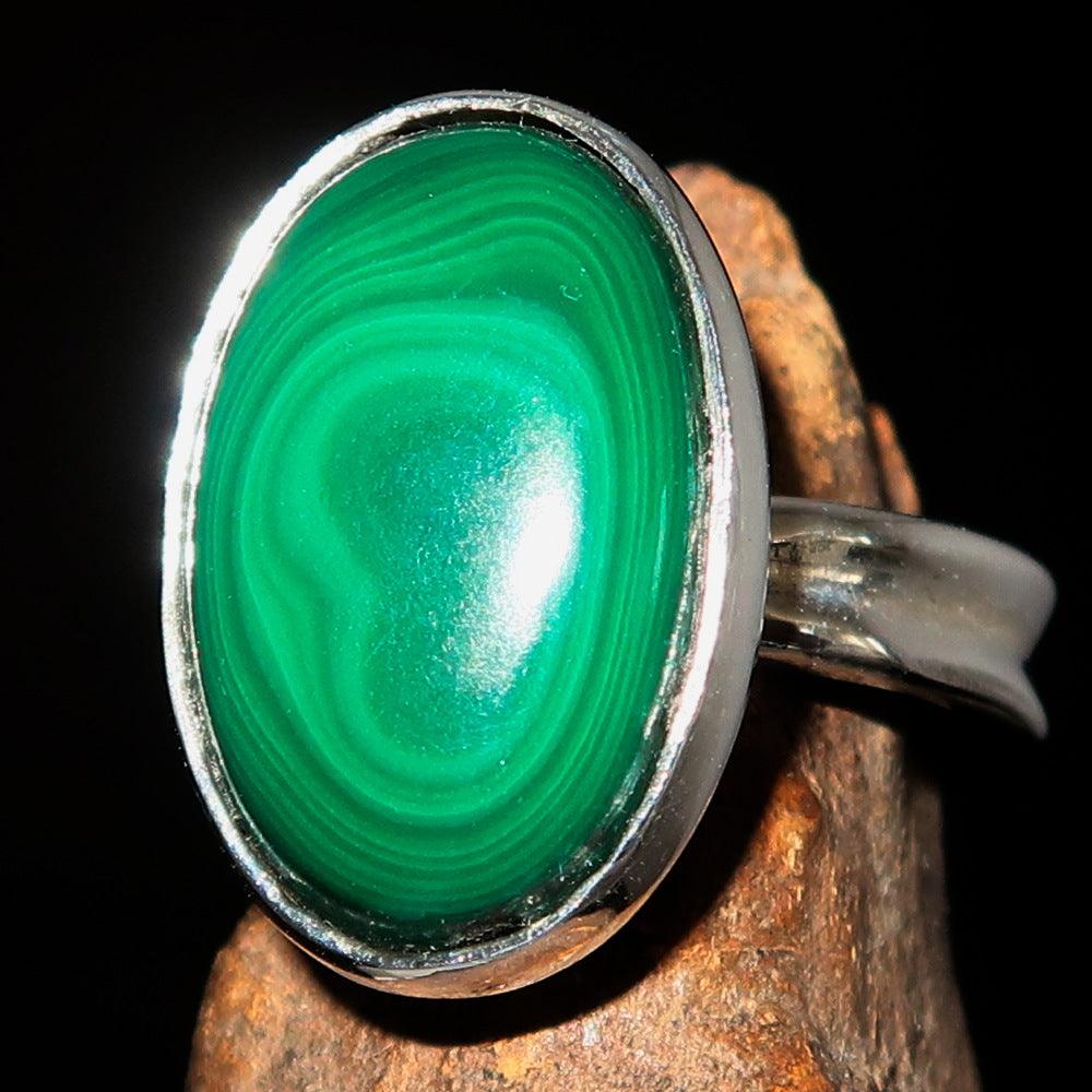 The oval shaped green Malachite stone is the centerpiece of this ring. Malachite is a beautiful gemstone that is often associated with healing properties and is believed to bring balance and harmony. Its rich green color and unique banding patterns make each ring truly one-of-a-kind. Wearing this ring not only adds a touch of elegance to your outfit but also connects you to the natural beauty of the earth.