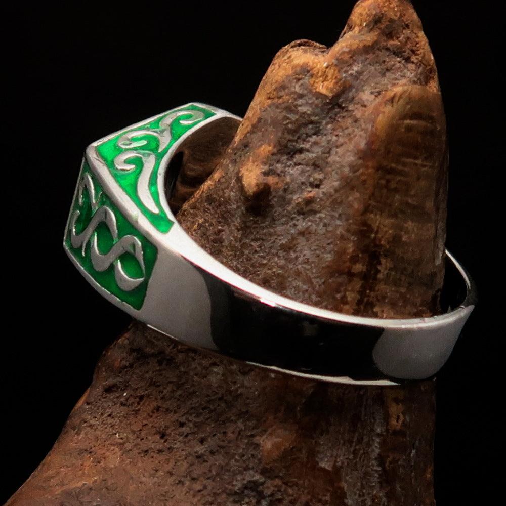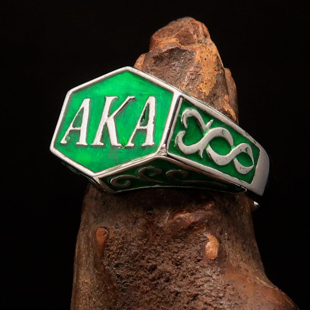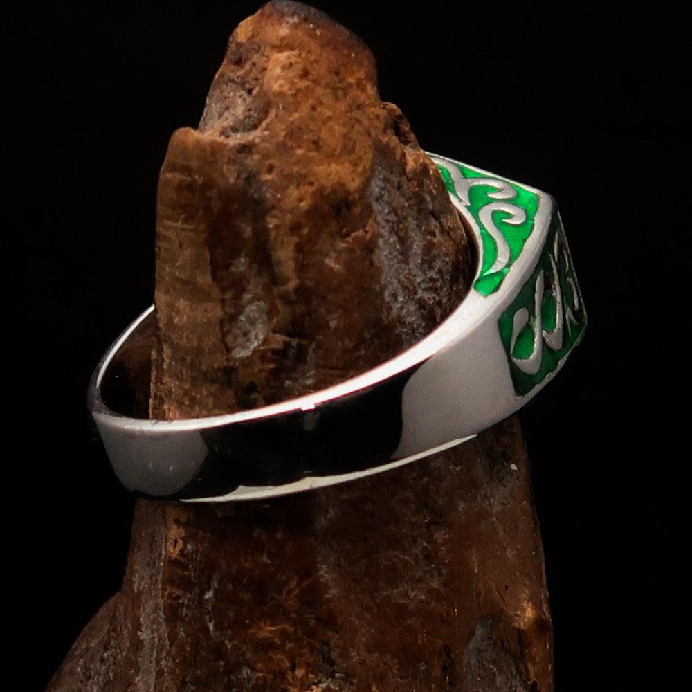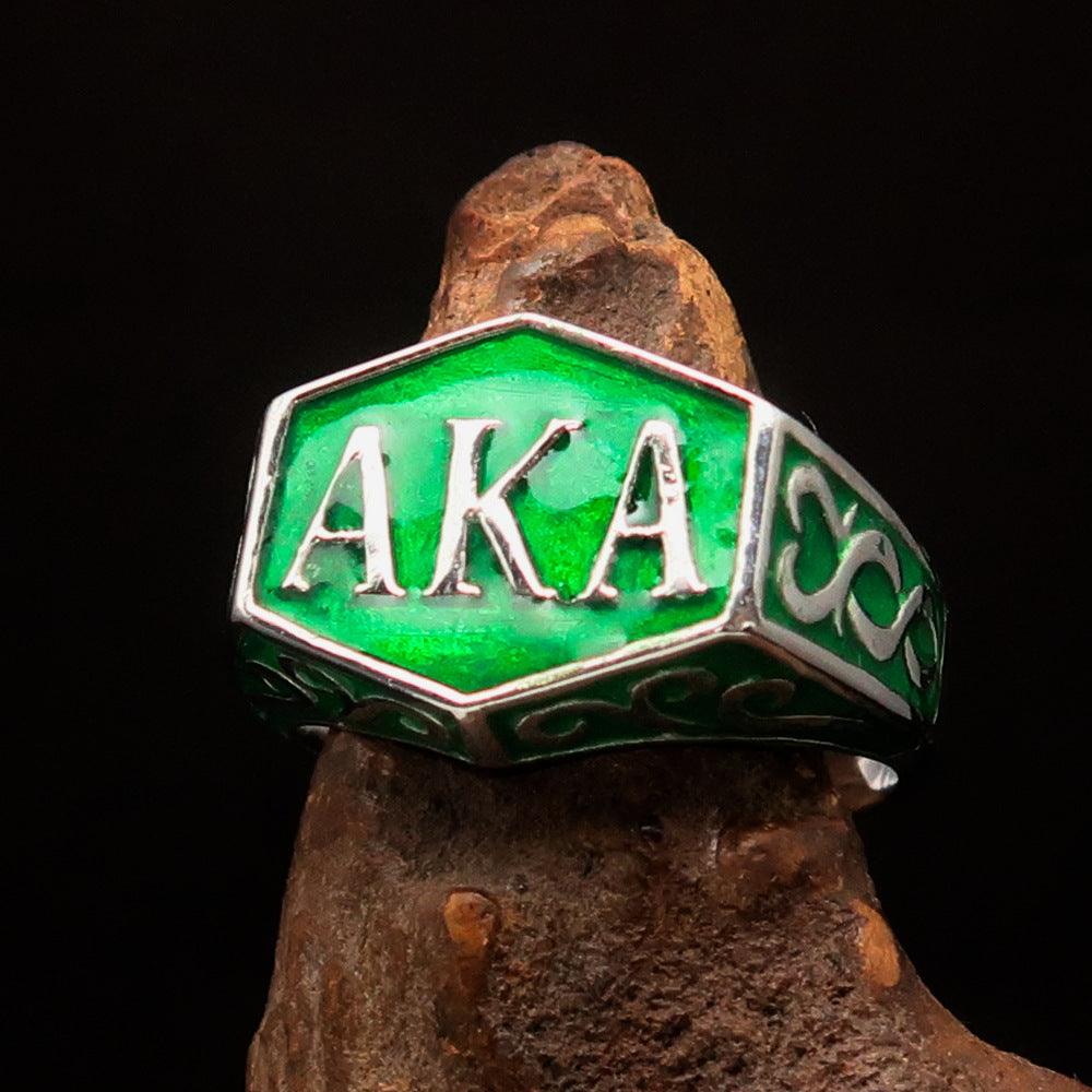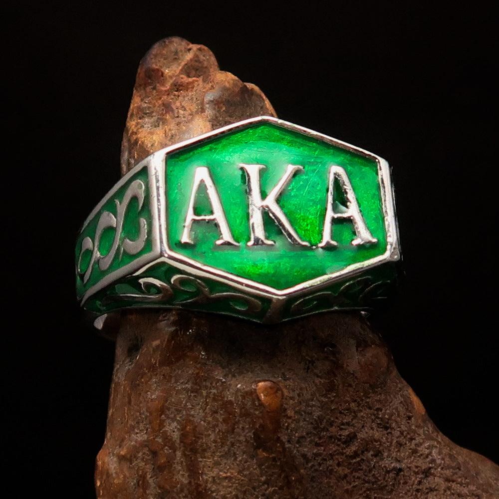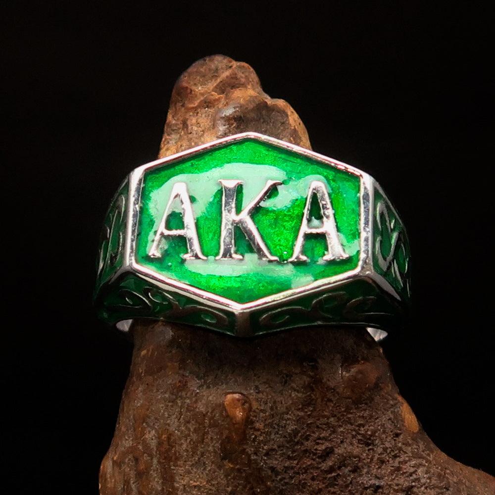 Introducing the Perfectly Crafted 'as known as' Synonym Men's Ring in a stunning green hue. This exquisite piece is made from solid sterling silver, ensuring durability and a luxurious appearance. The ring features a high-polished finish complemented by an elegant enamel coating, making it a standout accessory for any occasion.