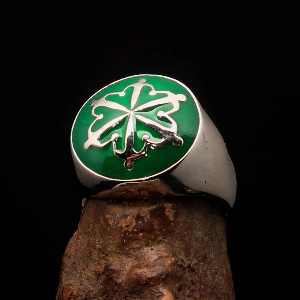 To maintain the beauty of your Sterling Silver Men's Green Unity Ring, it's essential to follow some simple care instructions. Avoid exposing the ring to harsh chemicals or abrasive materials that could damage the enamel or tarnish the silver. When not in use, store the ring in a soft pouch or jewelry box to prevent scratches. Regularly clean the ring with a soft cloth to keep it looking its best.