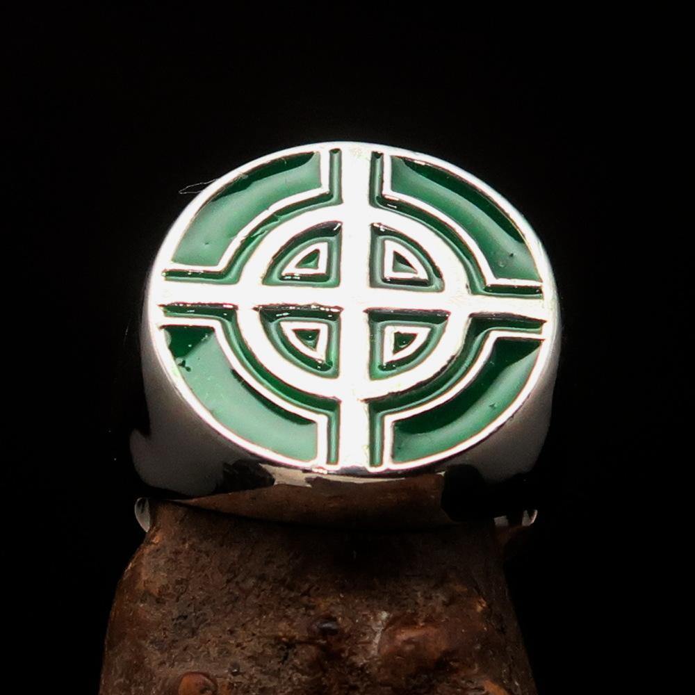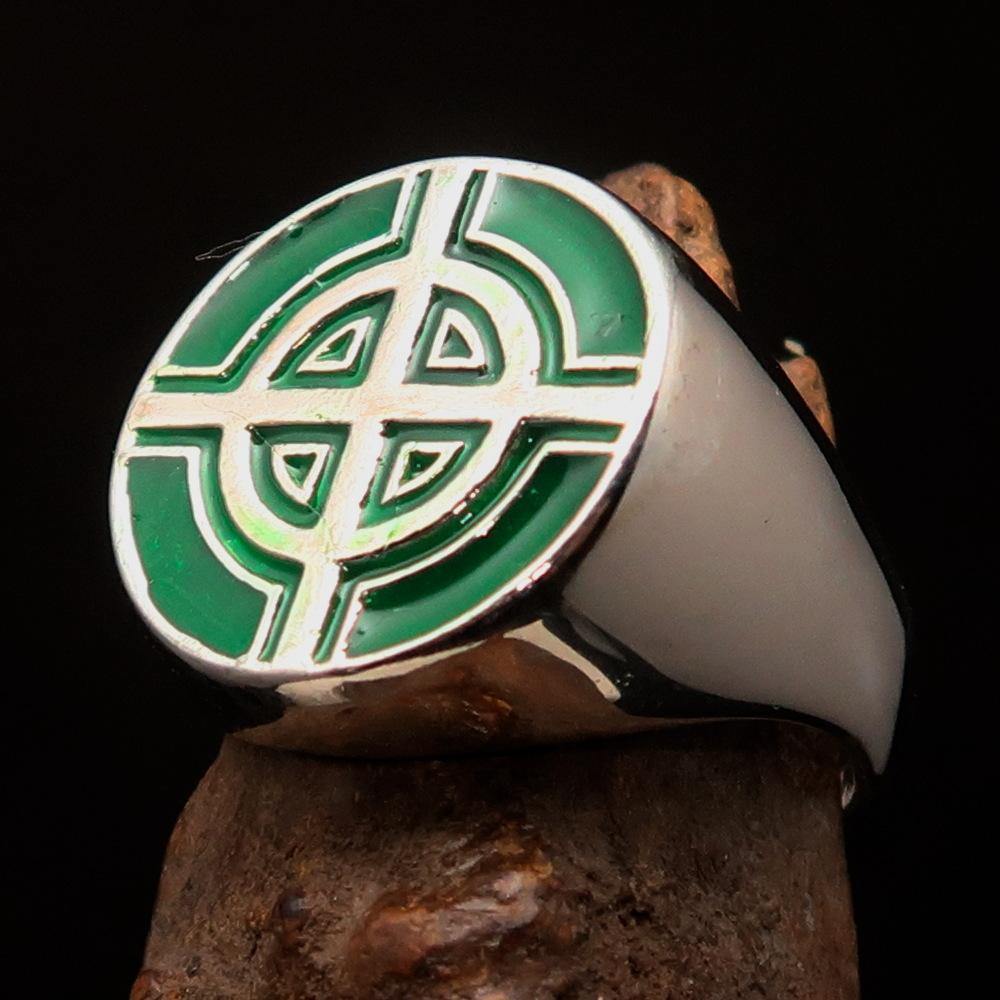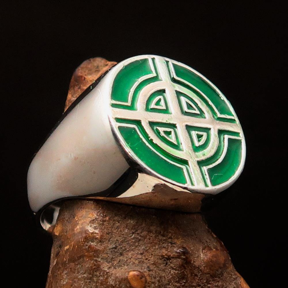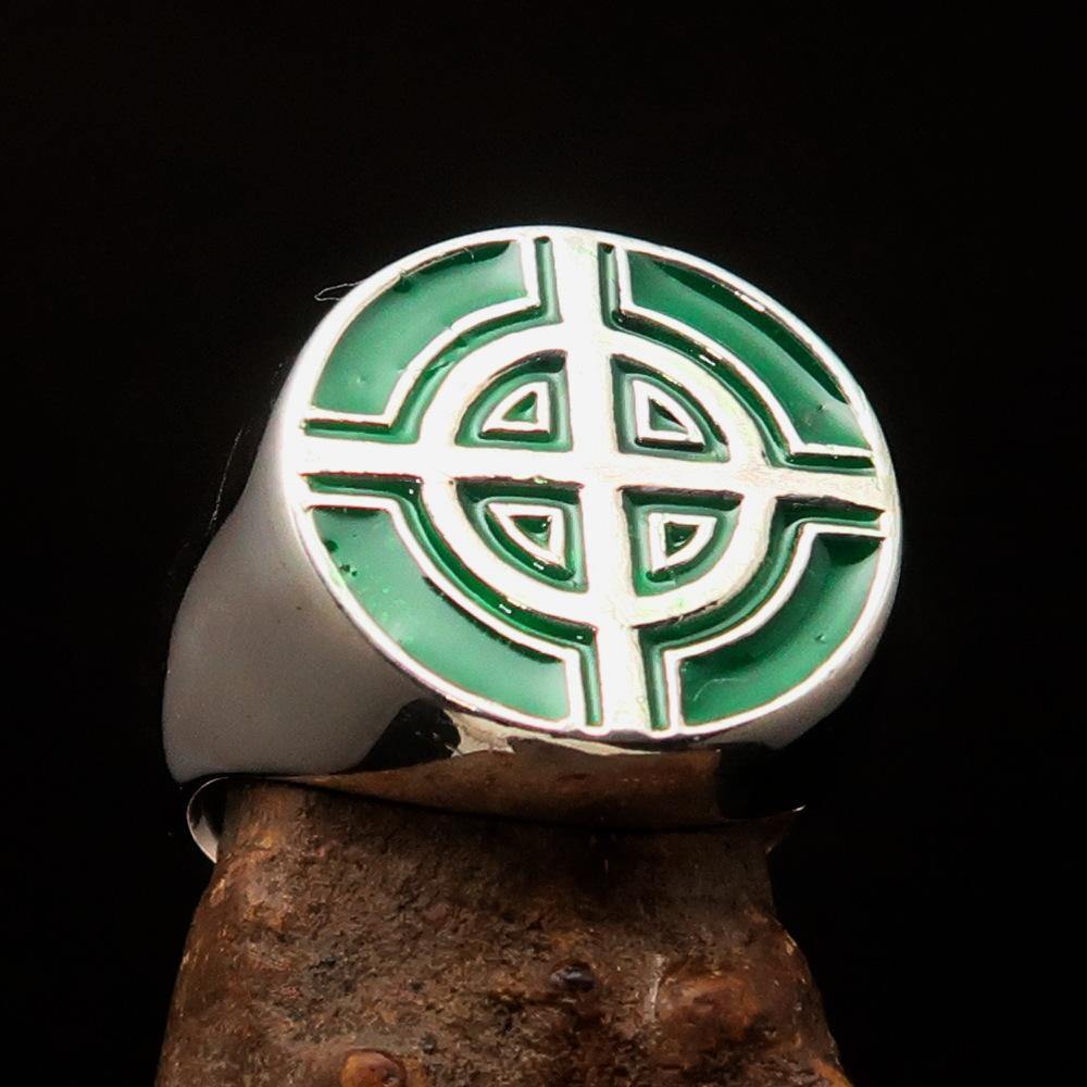 Introducing the Perfectly Crafted Men's Biker Ring Celtic Cross in Sterling Silver, a unique piece that combines style, durability, and symbolism. This ring is designed for those who appreciate the rugged elegance of biker jewelry while also valuing the rich heritage of Celtic designs. The high-polished finish and vibrant green enamel make this ring a standout accessory for any occasion.