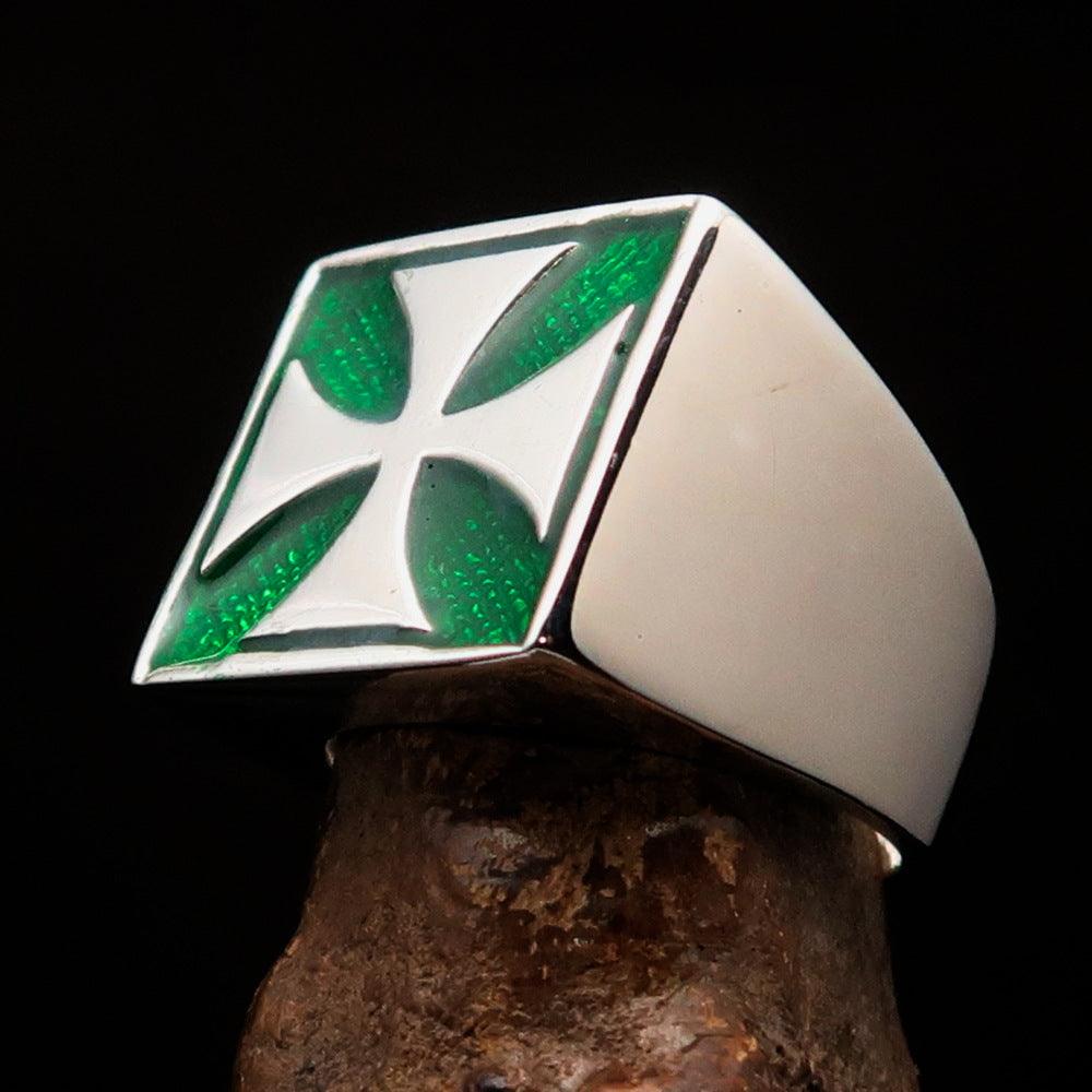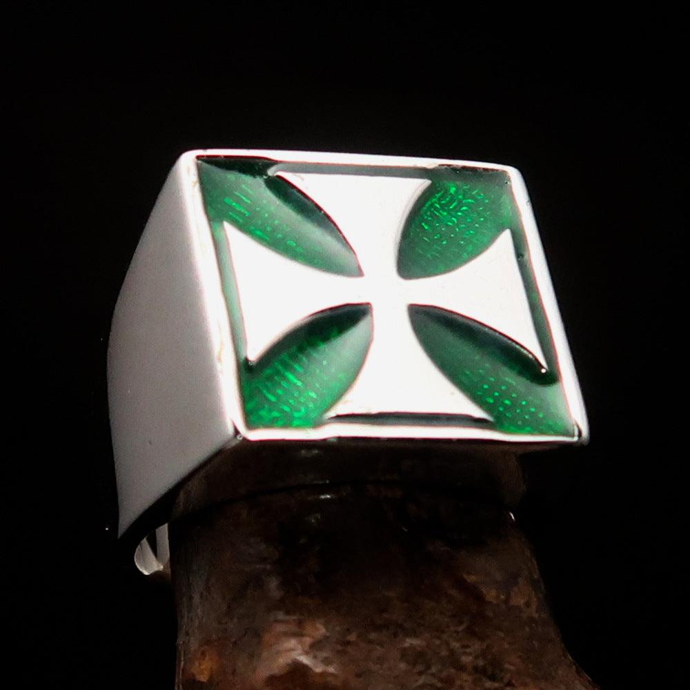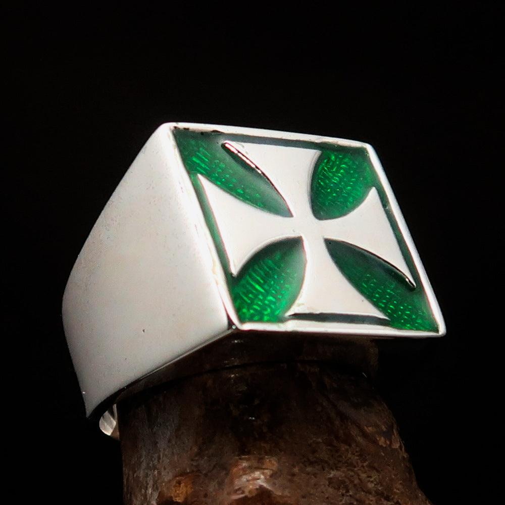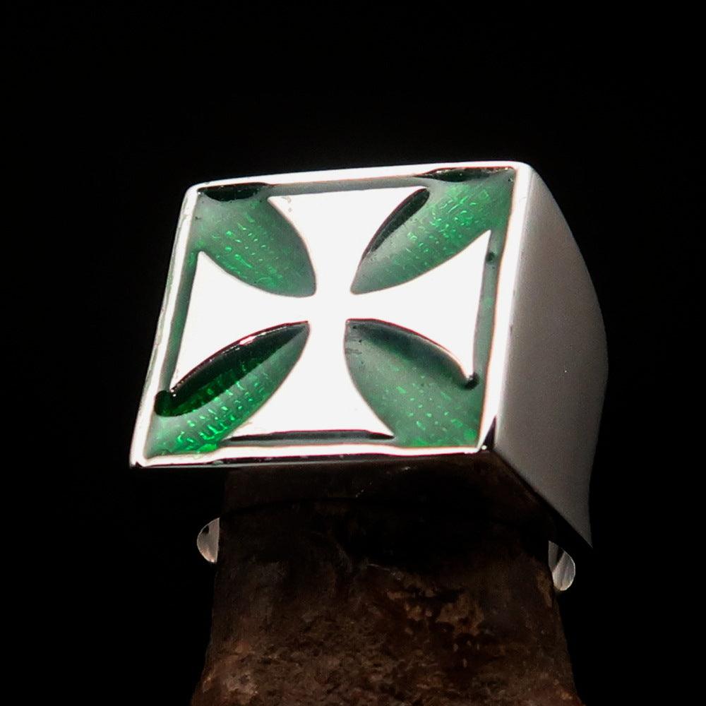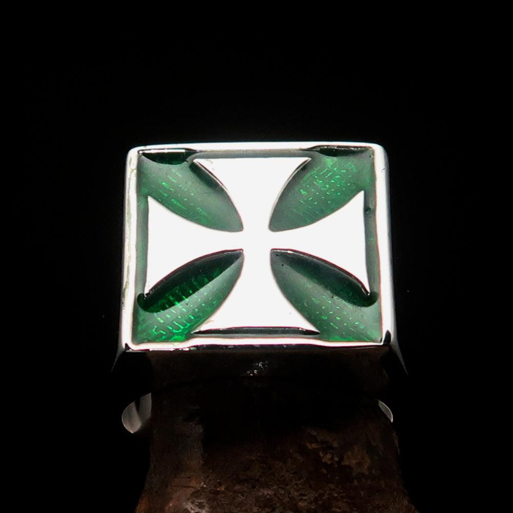 Men's Biker Ring made of Sterling Silver featuring a green Iron Cross design, polished finish, and hallmarked 925.