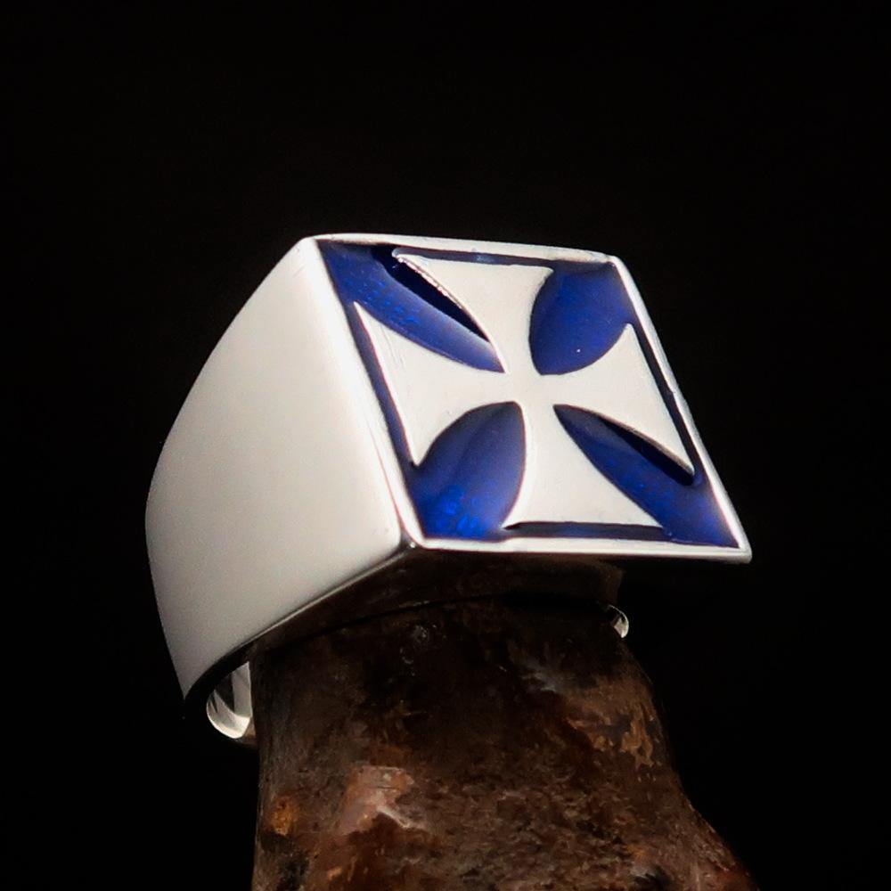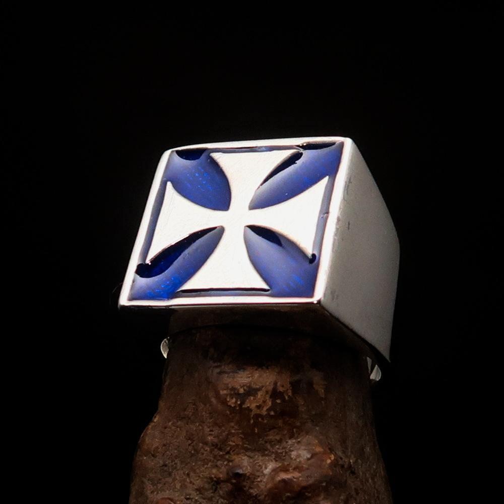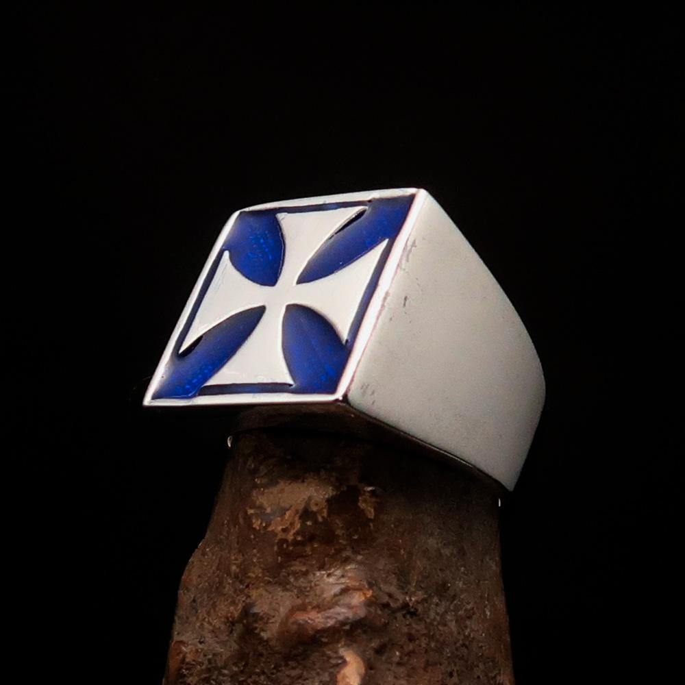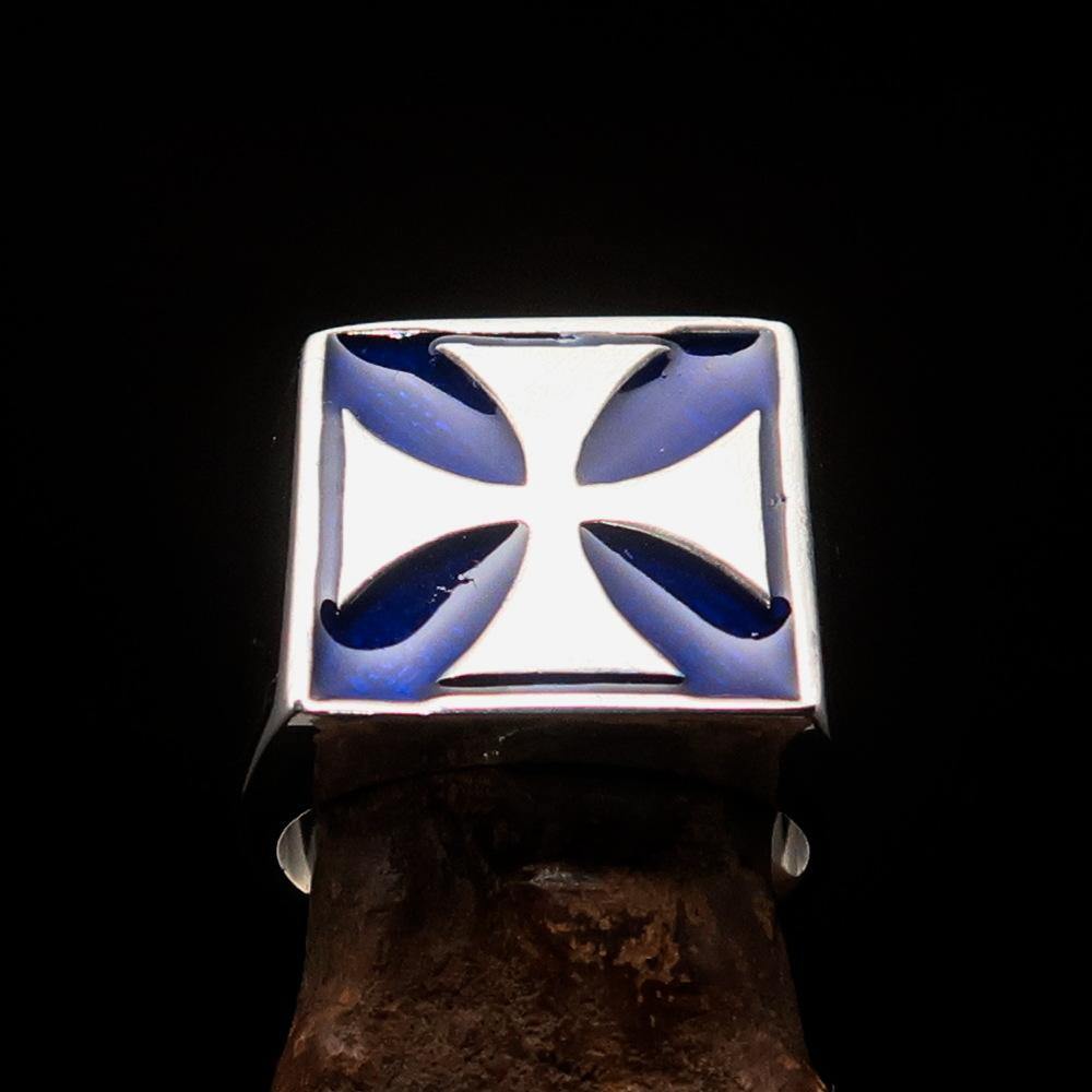 Men's Biker Ring featuring Iron Cross design in Sterling Silver with blue enamel finish, showcasing its polished surface and intricate details.
