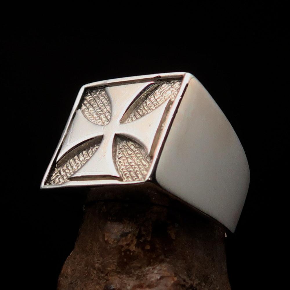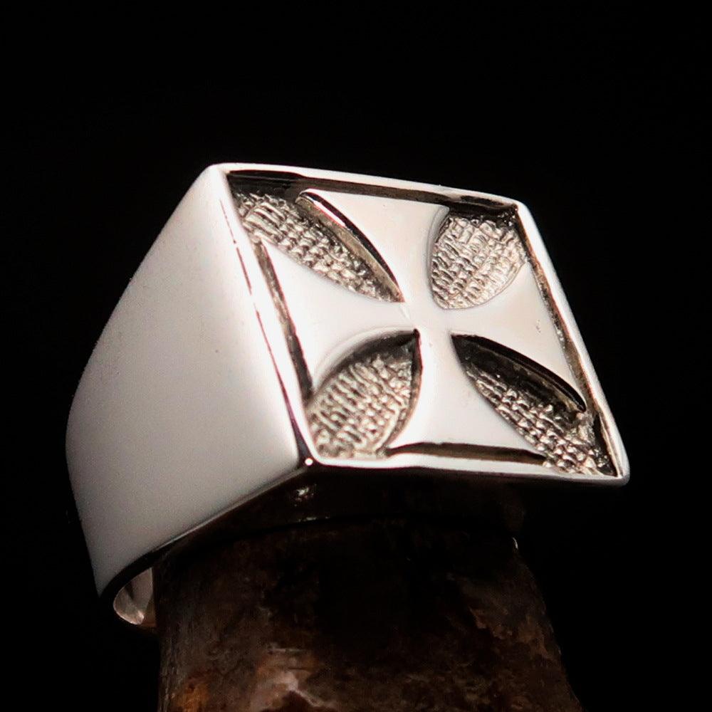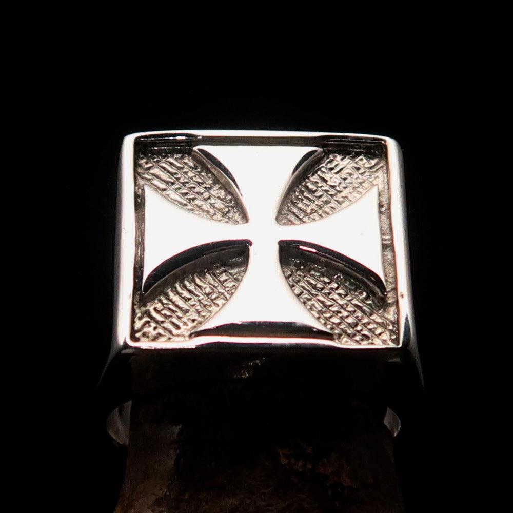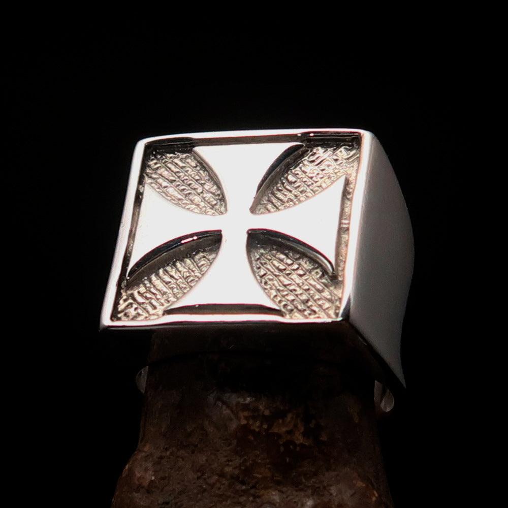 Men's Biker Ring Iron Cross in two-tone sterling silver with high polish and matte finish, showcasing its unique design and quality.