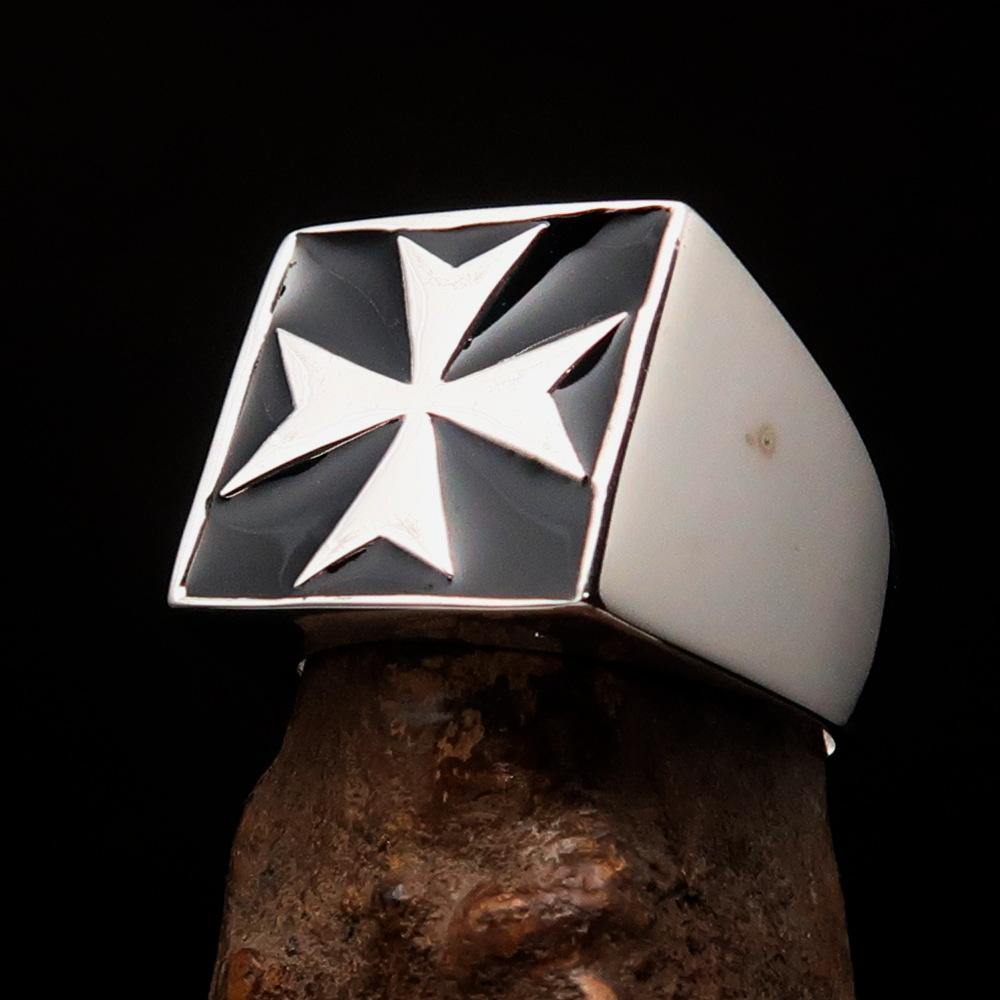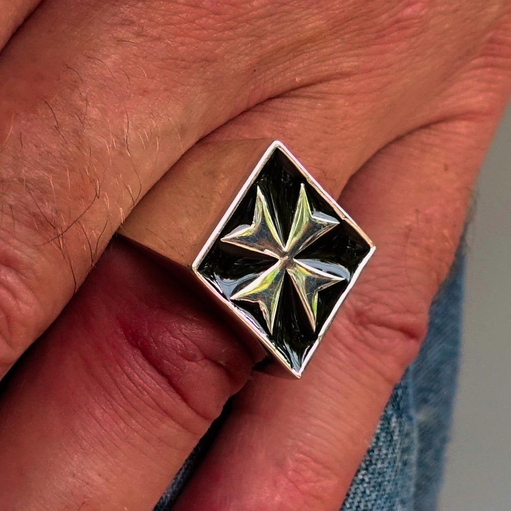 Introducing the Perfectly Crafted Men's Biker Ring Maltese Cross in Sterling Silver, a stunning piece that combines style and durability. This ring is designed for those who appreciate bold accessories that make a statement. Made from solid sterling silver, it features a high-polished finish that enhances its striking appearance. The black enamel detailing adds a unique touch, making it a perfect choice for bikers and fashion enthusiasts alike.