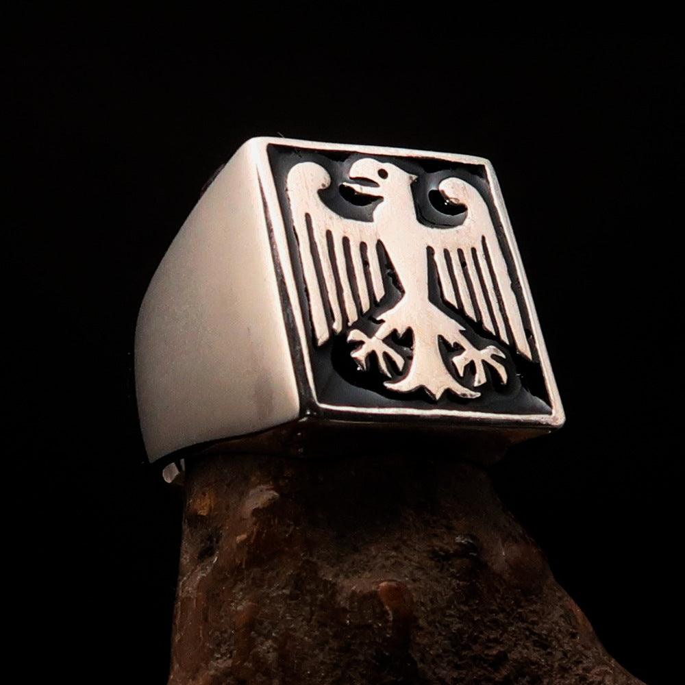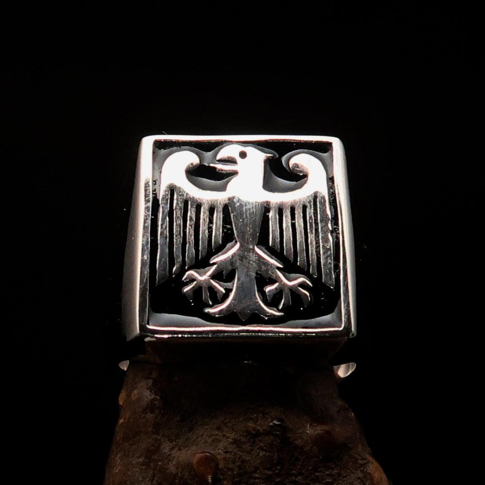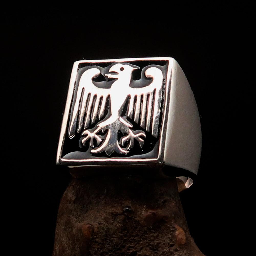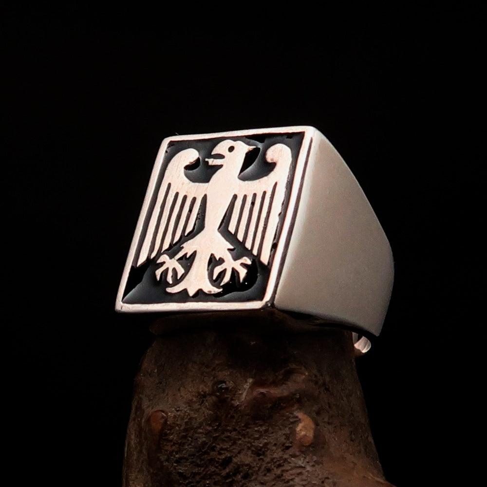 This Men's black German Eagle Seal Ring is a stunning piece of jewelry that combines elegance and craftsmanship. Made from solid sterling silver, this ring is designed to make a statement while providing durability and comfort. The high polished finish, complemented by black enamel accents, gives it a sophisticated look that is perfect for any occasion.