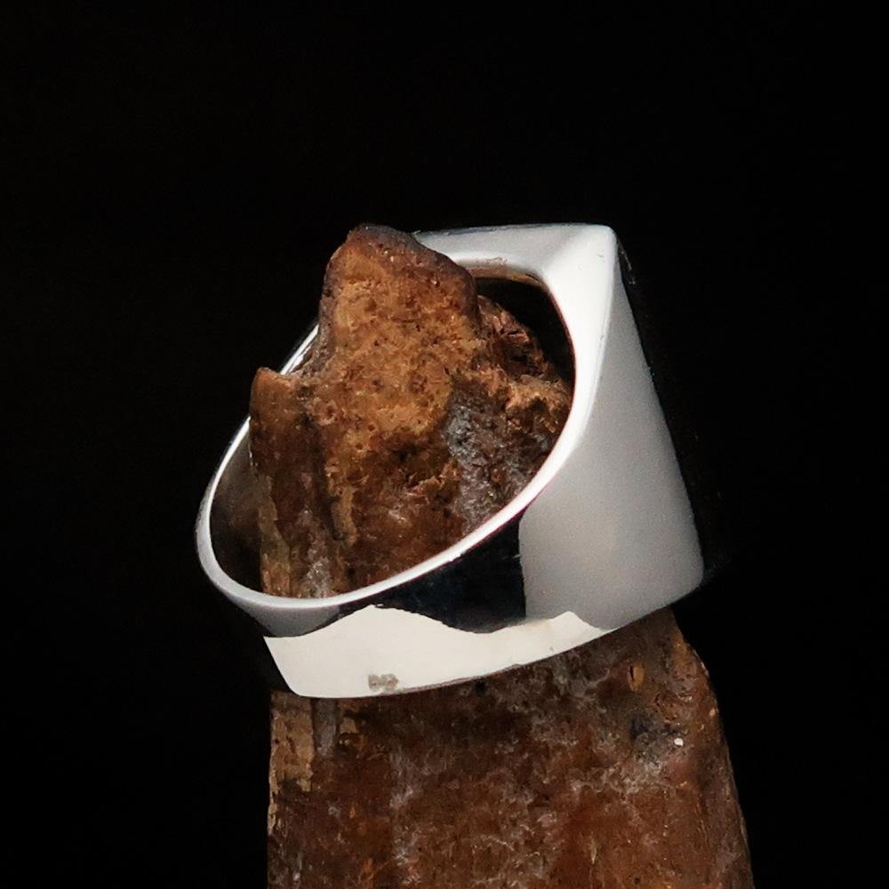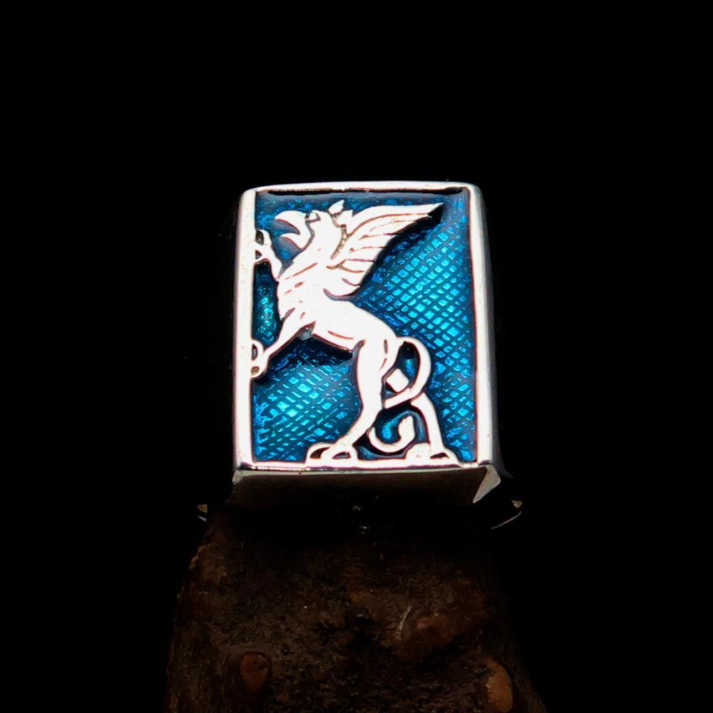 Introducing the Perfectly Crafted Men's Blue Griffin Ring Griffon - Sterling Silver, a stunning piece of jewelry that combines elegance and strength. This exquisite ring is designed for the modern man who appreciates fine craftsmanship and unique style. Made from solid sterling silver, this ring is not only durable but also features a high polish that enhances its overall appeal. The beautiful blue enamel inlay adds a striking contrast to the sleek silver, making it a standout accessory for any occasion.