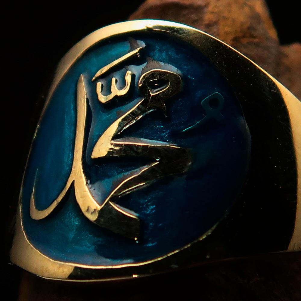 Introducing the exquisite Men's Blue Muhammad Muslim Pinky Ring, a stunning piece of jewelry that combines elegance and cultural significance. Crafted from solid brass, this ring is designed to withstand the test of time while providing a stylish accessory for any occasion. The high polish finish, complemented by vibrant blue enamel, makes this ring a standout piece that reflects both sophistication and faith.