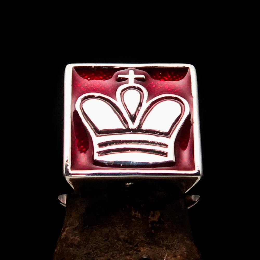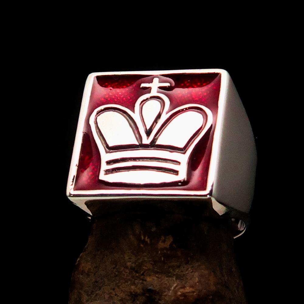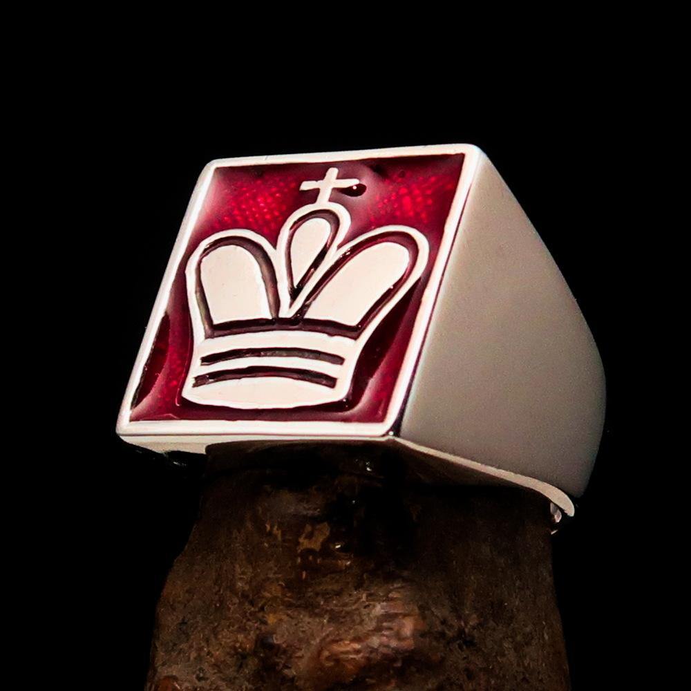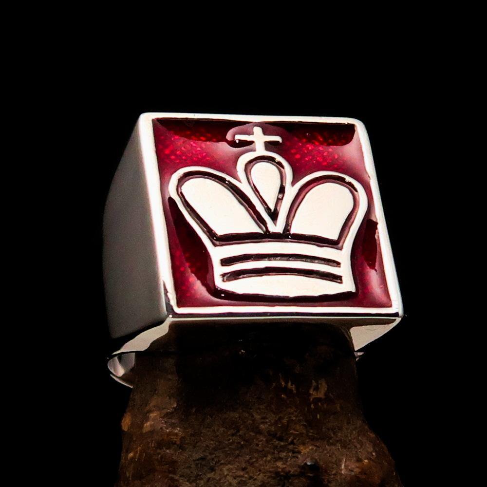 Introducing the Perfectly Crafted Men's Chess Player Ring King's Crown, a stunning piece of jewelry designed for chess enthusiasts and style aficionados alike. Made from solid sterling silver, this ring showcases a high-polished finish that gleams with elegance. The centerpiece of this exquisite ring is the King's Crown design, beautifully accented with vibrant red enamel that adds a touch of sophistication and flair.