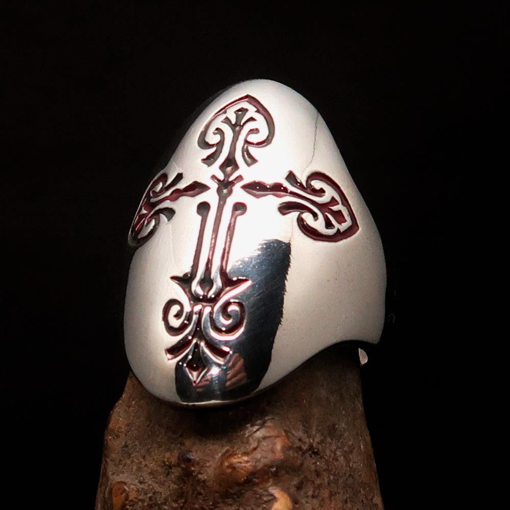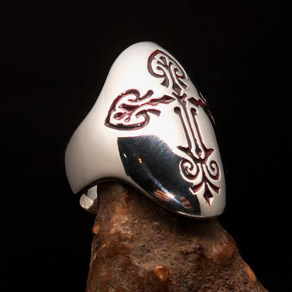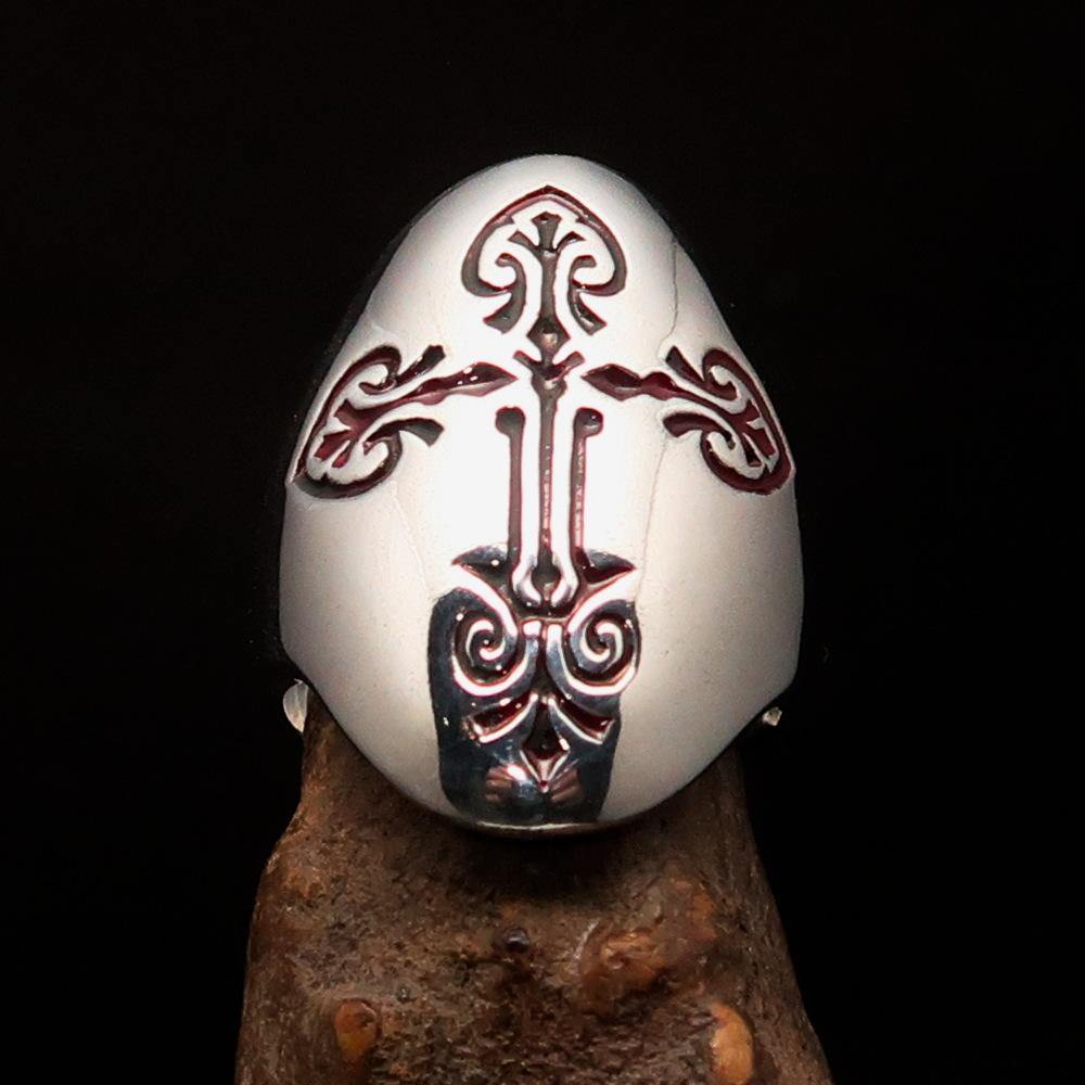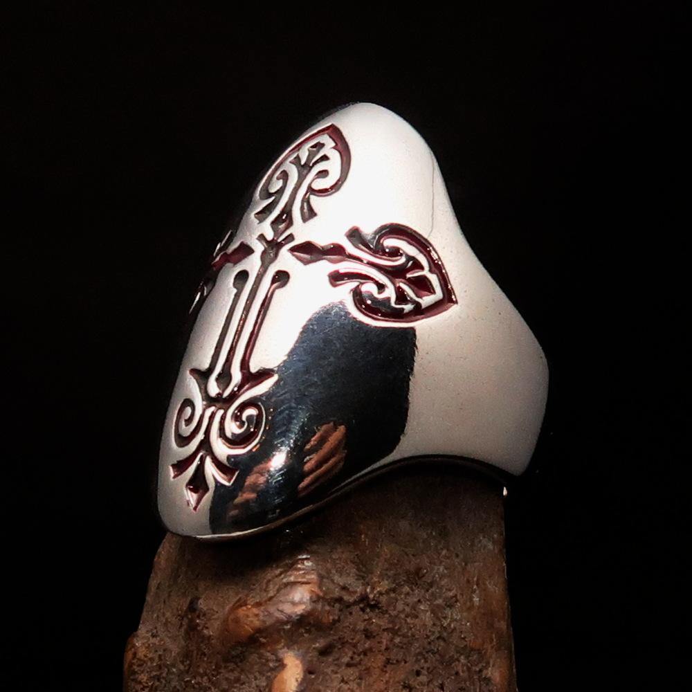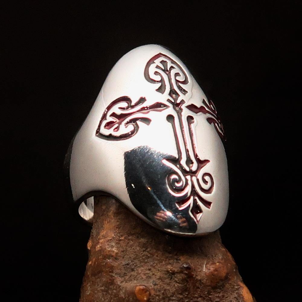 Men's Coptic Cross Ring in red enamel, crafted from solid sterling silver with a high-polished finish.