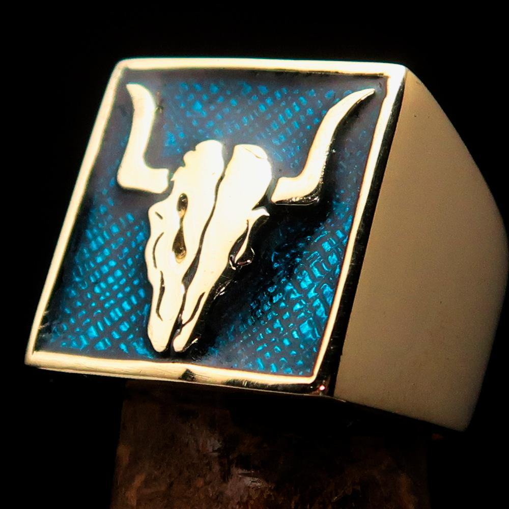Introducing the Perfectly Crafted Men's Cowboy Ring featuring a striking bull skull design, meticulously made from solid brass. This ring is not just a piece of jewelry; it’s a statement of style and individuality. The high-polished finish combined with vibrant blue enamel accents makes it a standout accessory for any cowboy or western enthusiast.