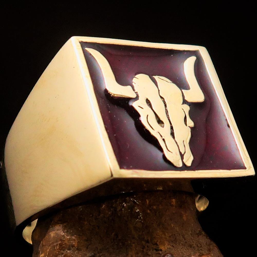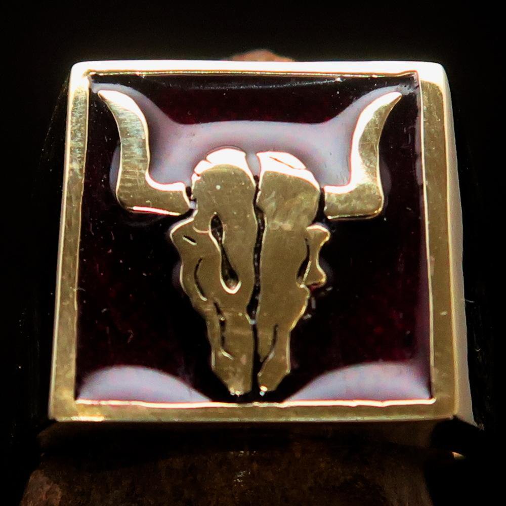 Men's Cowboy Ring featuring a bull skull design with red enamel, crafted from solid brass with a high polished finish.