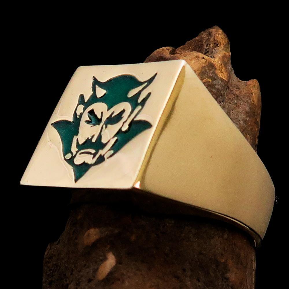 Introducing the Perfectly Crafted Men's Devil Ring in Solid Brass, a stunning piece of jewelry that combines elegance with a bold statement. This ring features a high-polished finish that enhances its luxurious appearance, making it a perfect accessory for any occasion. The vibrant green enamel adds a unique touch, ensuring that this ring stands out in any collection.