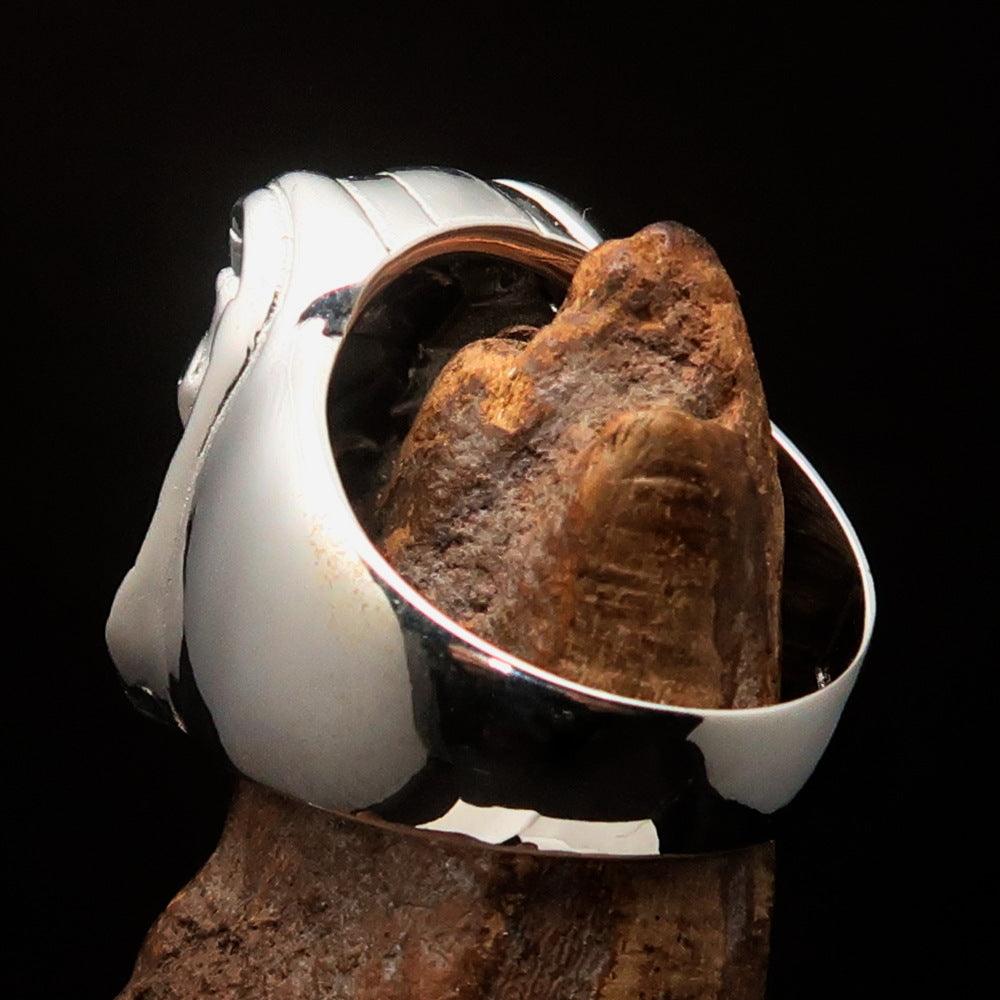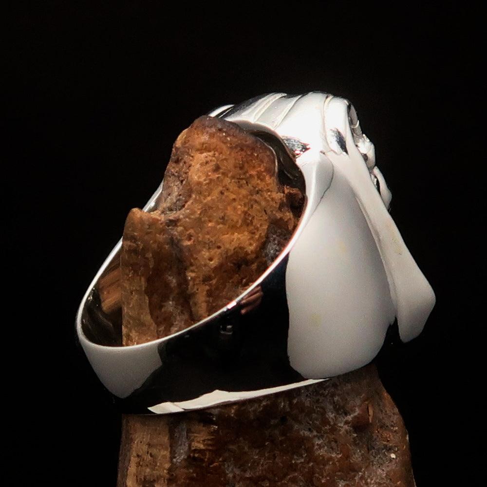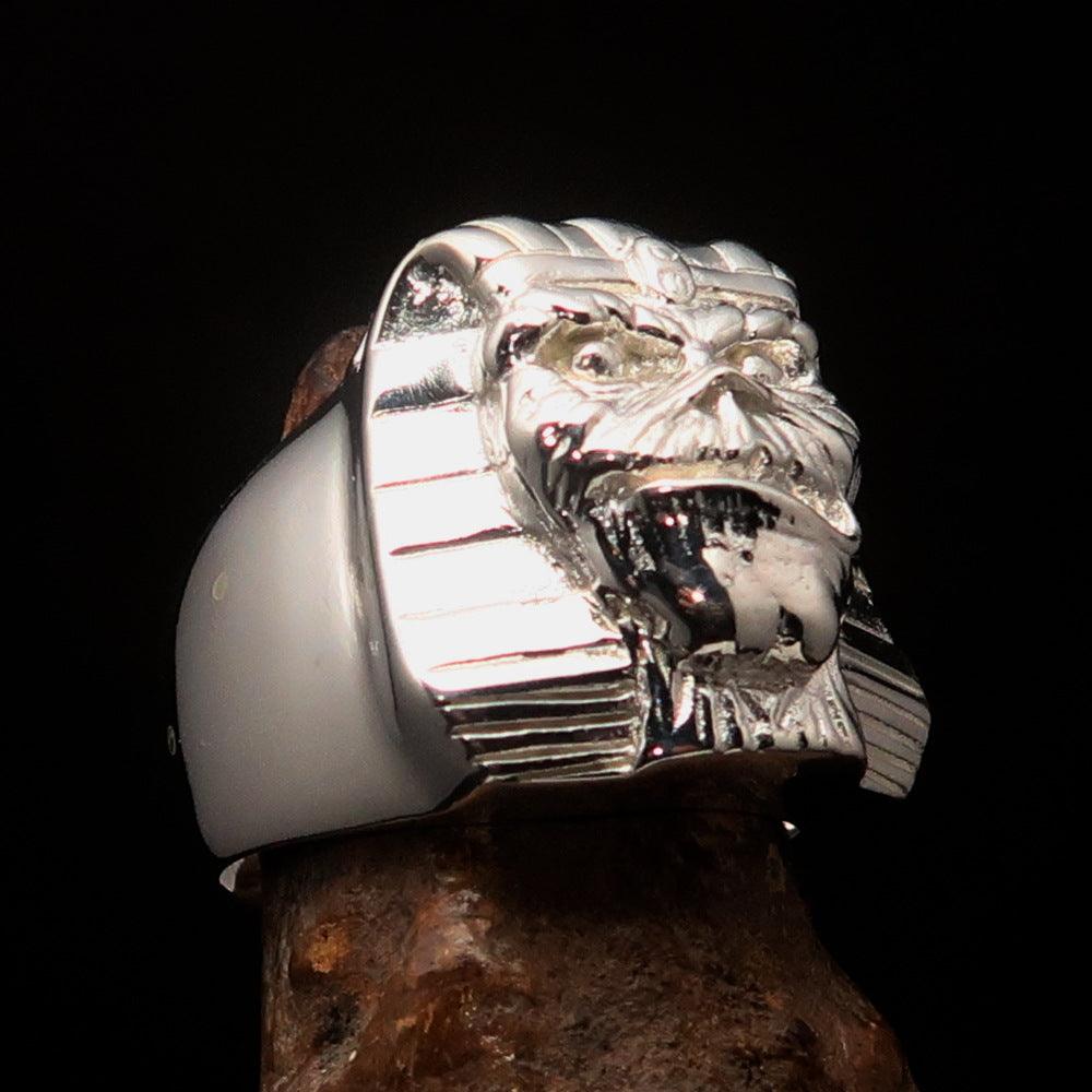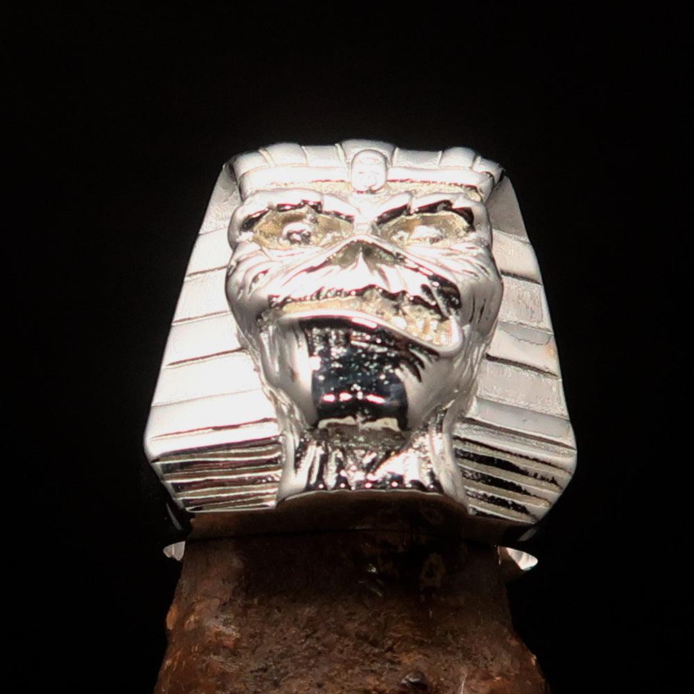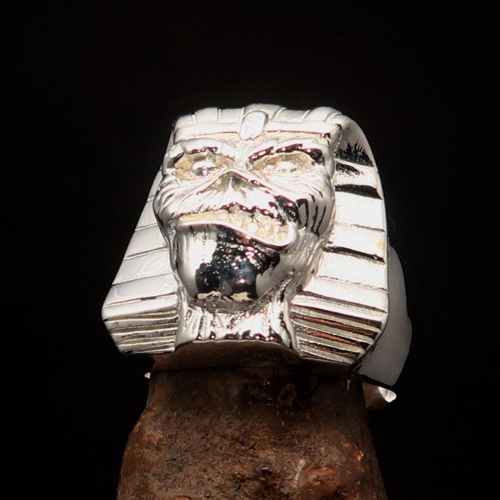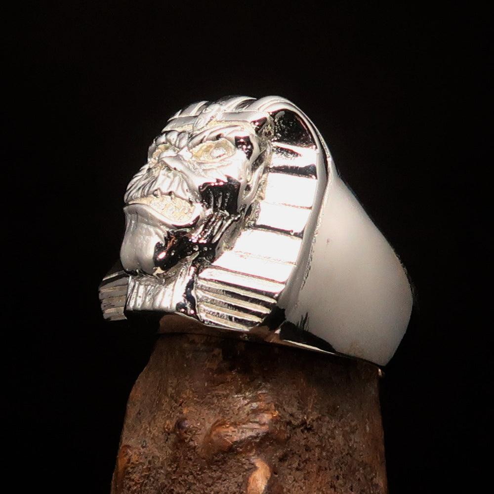 Men's Egyptian Pharaoh Sphinx Mummy Ring made of solid sterling silver with a high polished finish, showcasing intricate design and craftsmanship.