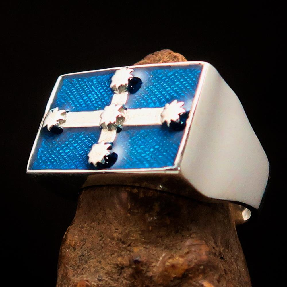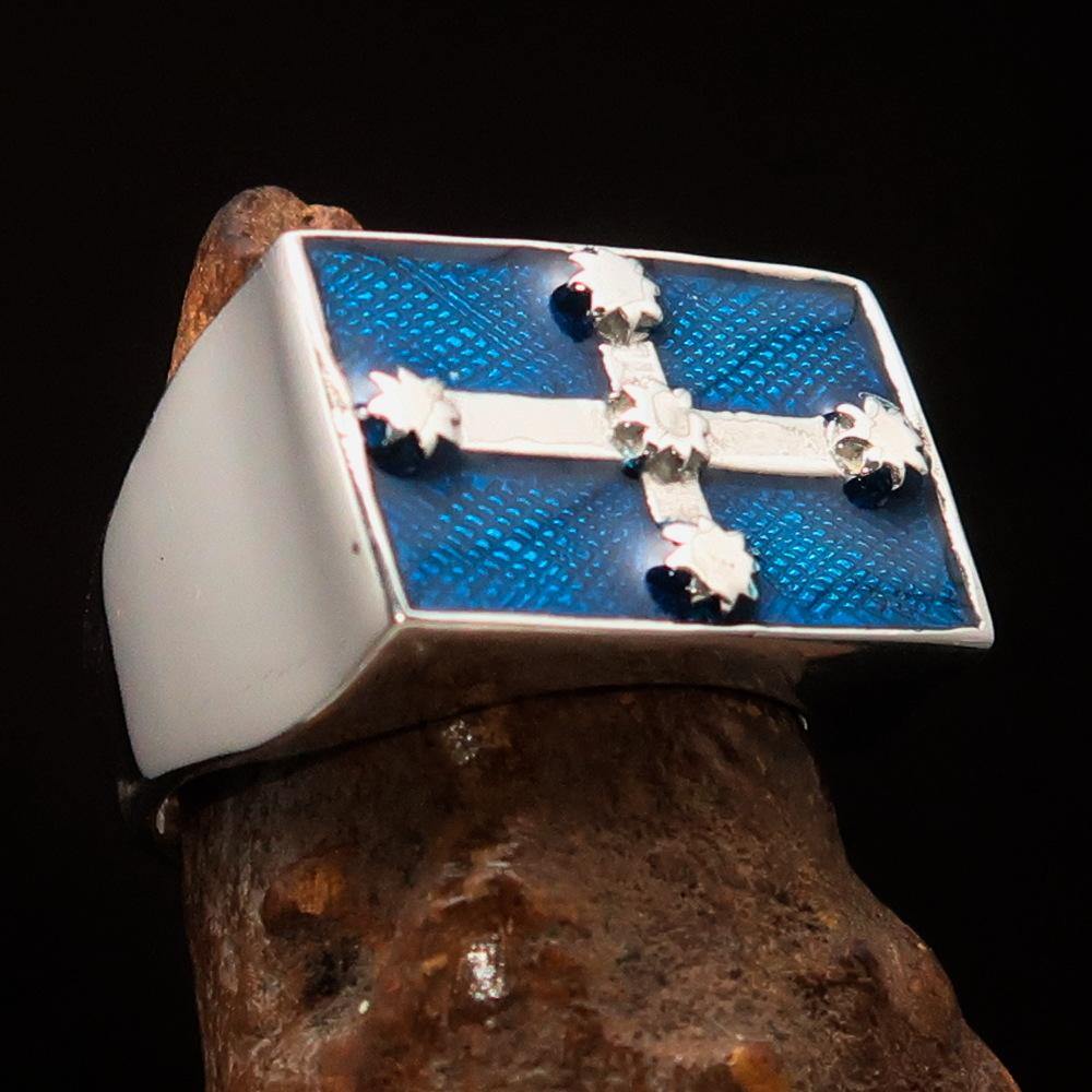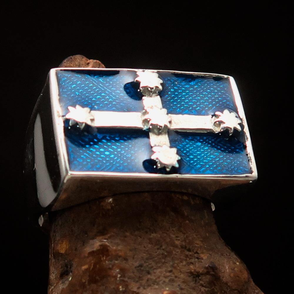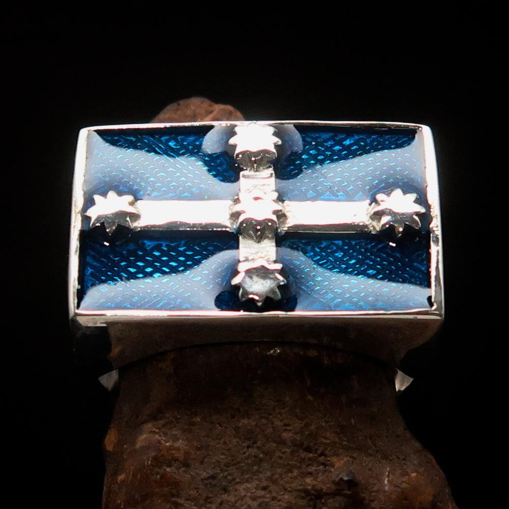 Introducing the Men's Eureka Flag Ring, a stunning piece of jewelry that embodies the spirit of Australian rebellion. Crafted from solid sterling silver, this ring is not only a fashion statement but also a symbol of pride and heritage. The high-polished finish combined with a vibrant blue enamel design makes it a standout accessory for any occasion.