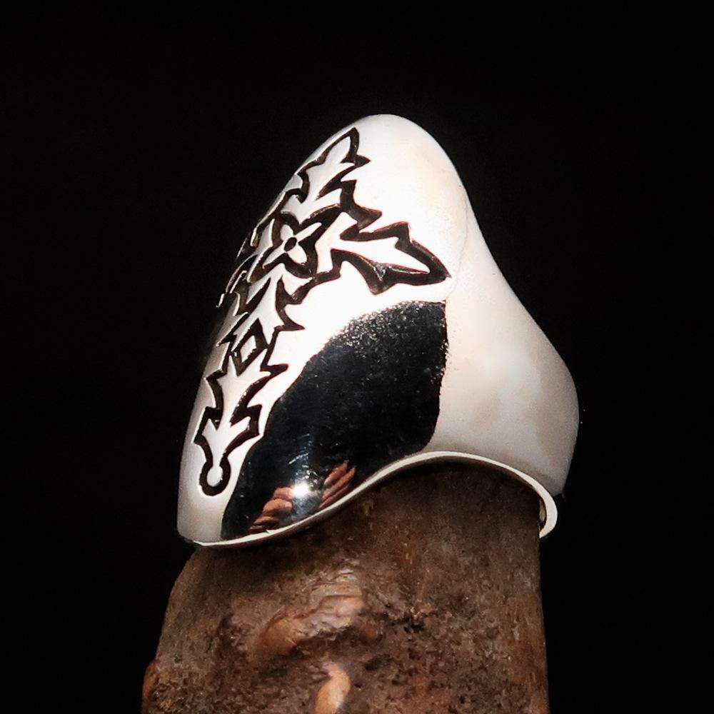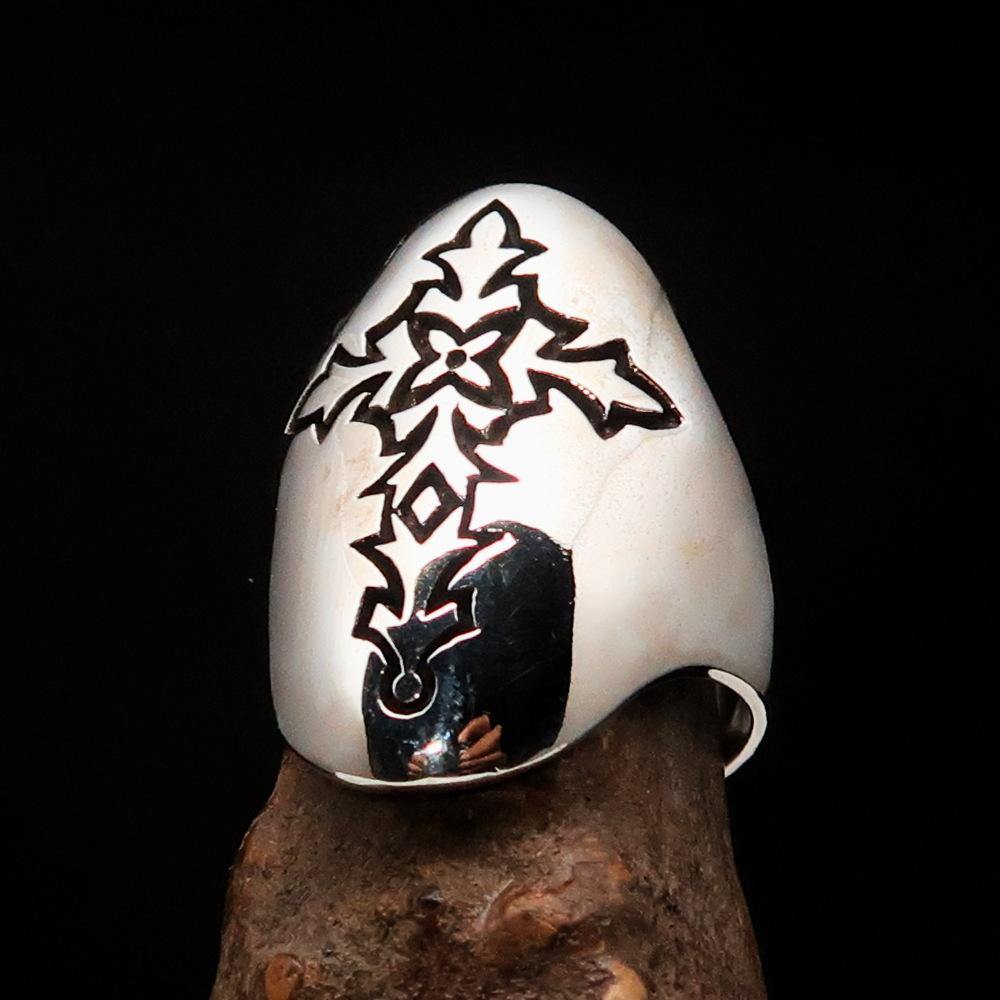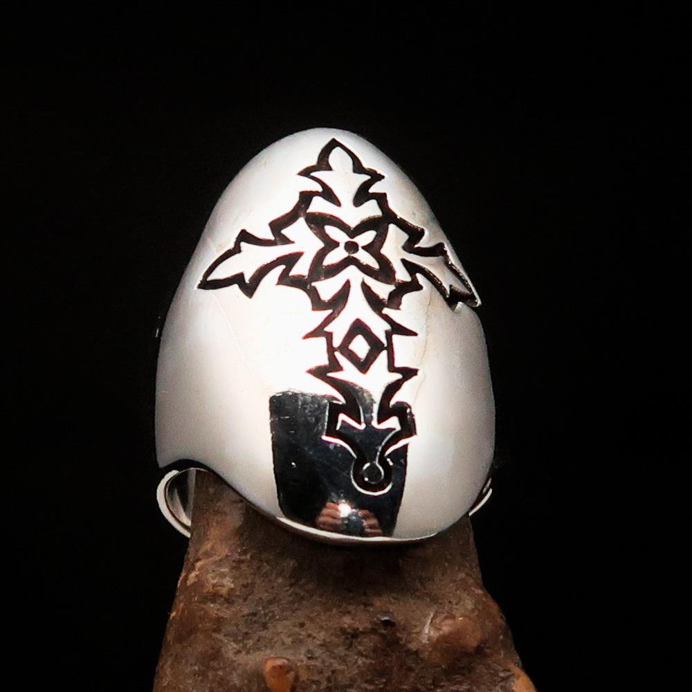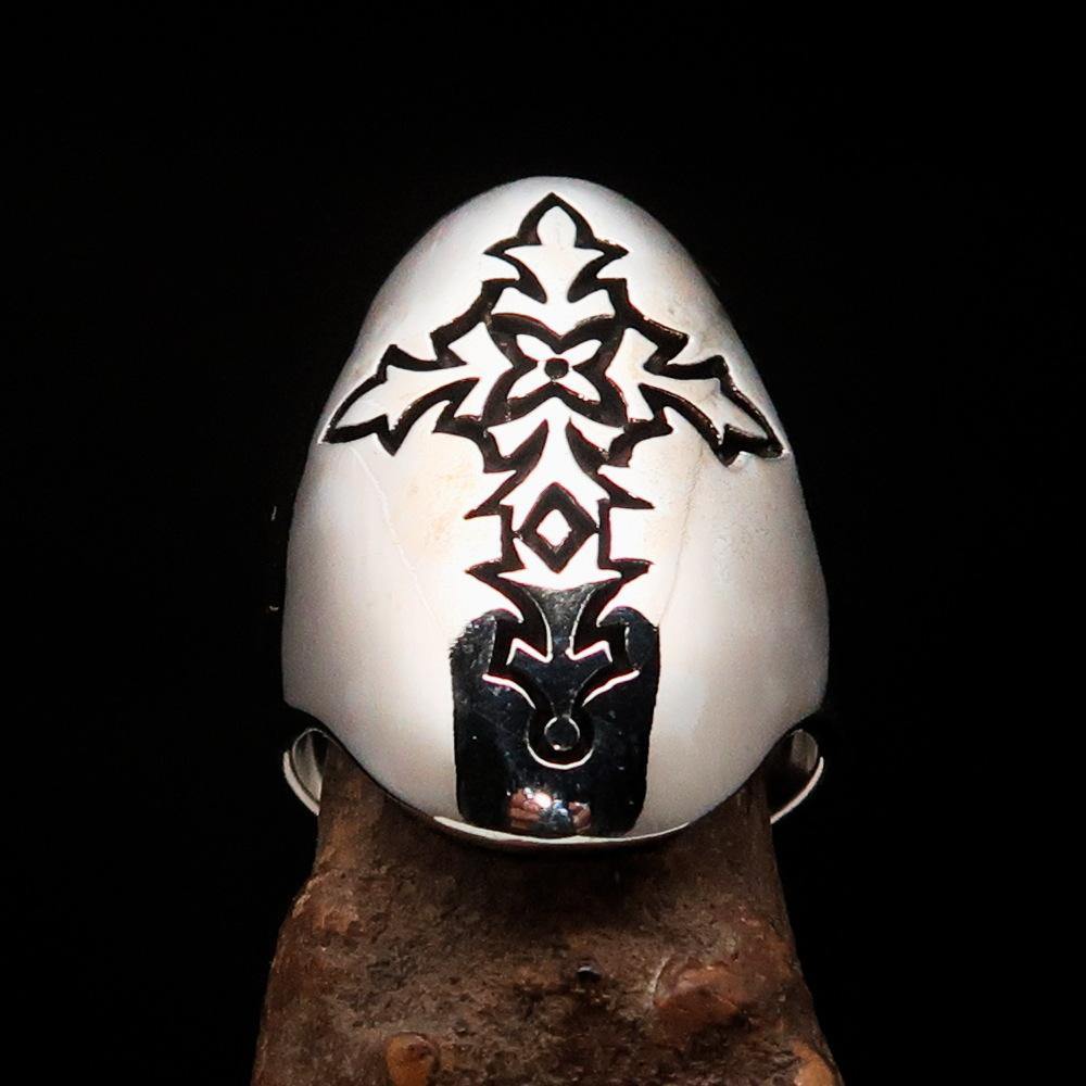 Men's Gothic Cross Ring made of antiqued sterling silver, featuring a detailed cross design and polished finish.