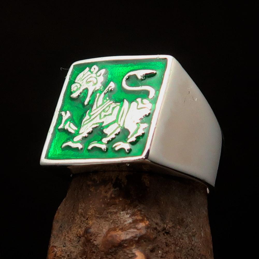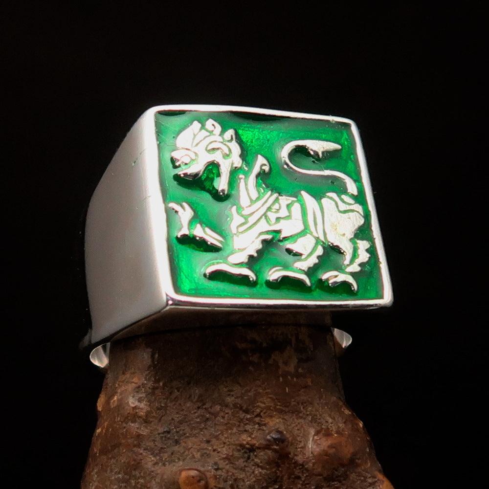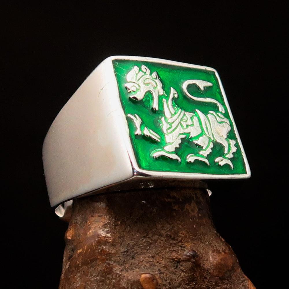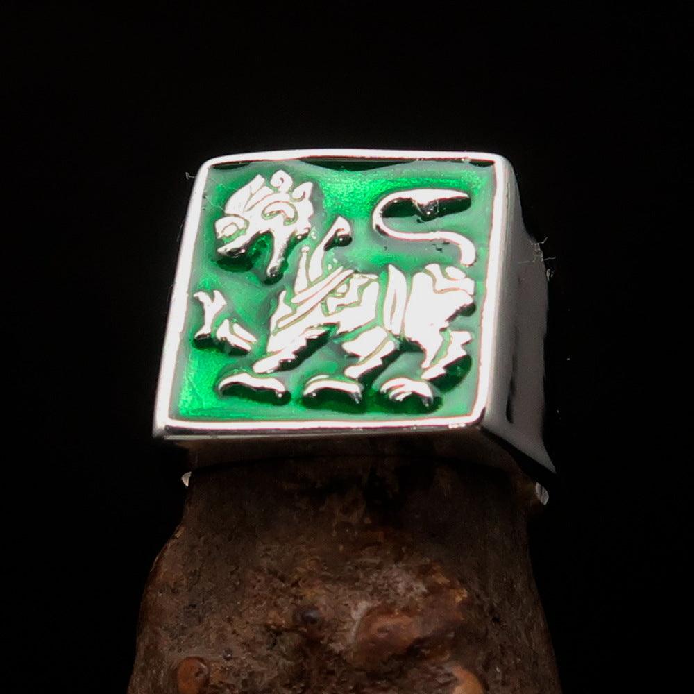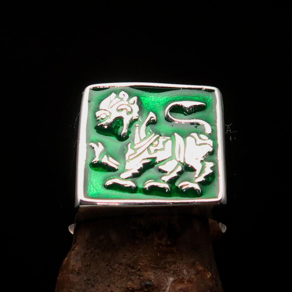 This stunning ring features a high-polished finish that enhances its beauty and elegance. The addition of vibrant green enamel not only adds a unique touch but also symbolizes prosperity and growth. The Sinhalese Lion, a revered emblem in Sri Lankan culture, is beautifully depicted, making this ring a perfect accessory for those who appreciate cultural significance in their jewelry.