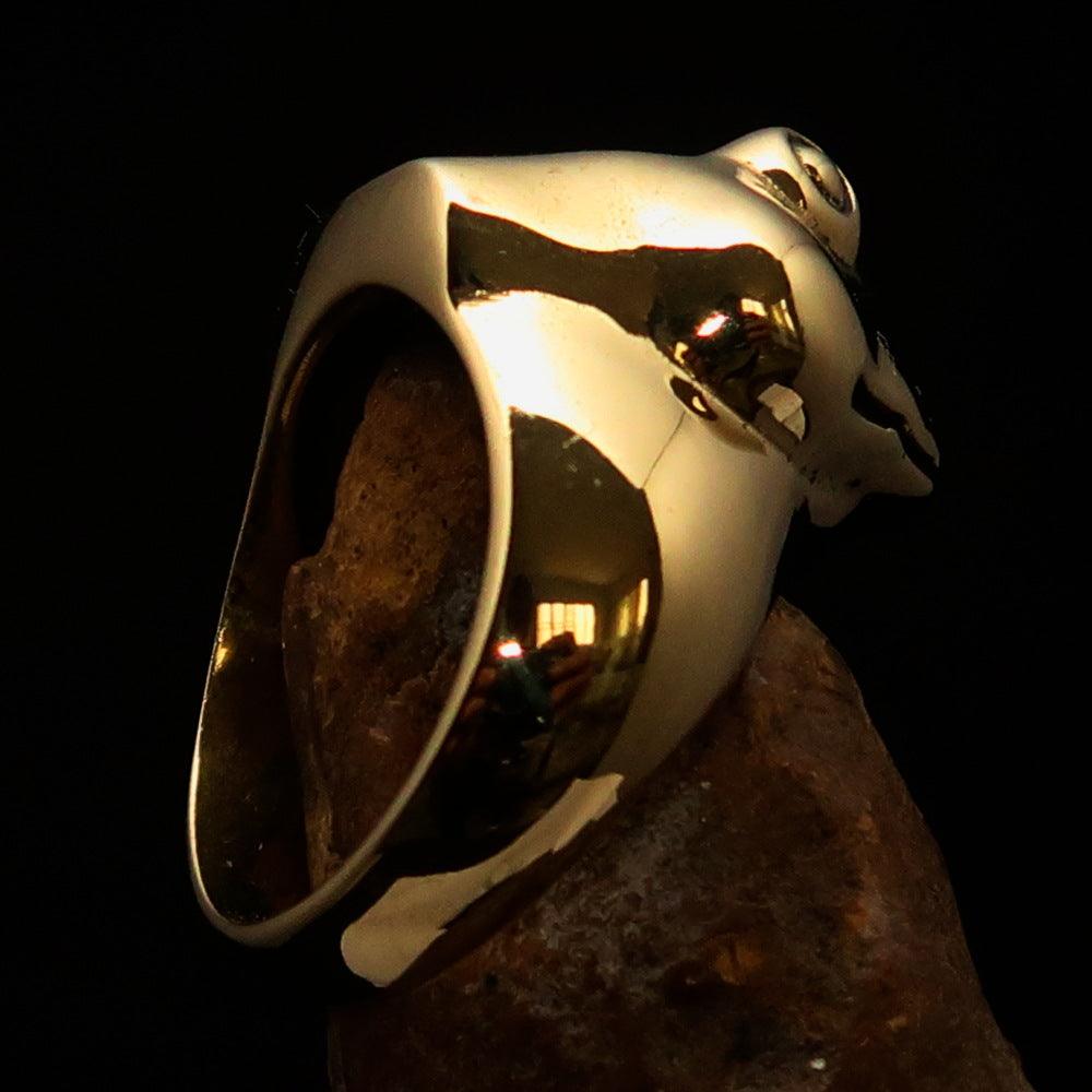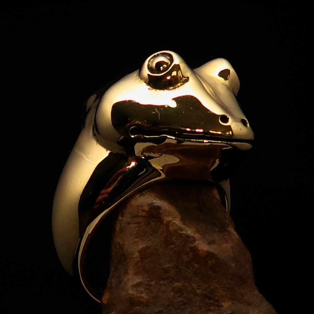 Men's Grinning Frog Pinky Ring made of solid brass with a mirror polished finish, showcasing a unique frog design.
